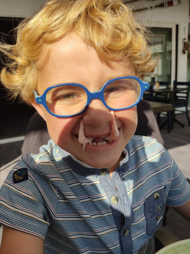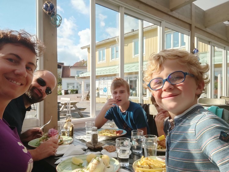 Nous arrivons ensuite à Grundsund sur l’île de Skaftö. Nous trouvons un joli petit restaurant dépendant de la poissonnerie du coin qui sert le traditionnel déjeuner suédois pour la modique somme de 10€ le menu. Nous choisissons des plats typiques : le sandwich aux crevettes pour Ludo, le cabillaud à la sauce aux oeufs pour moi et des saucisses frites pour les enfants.