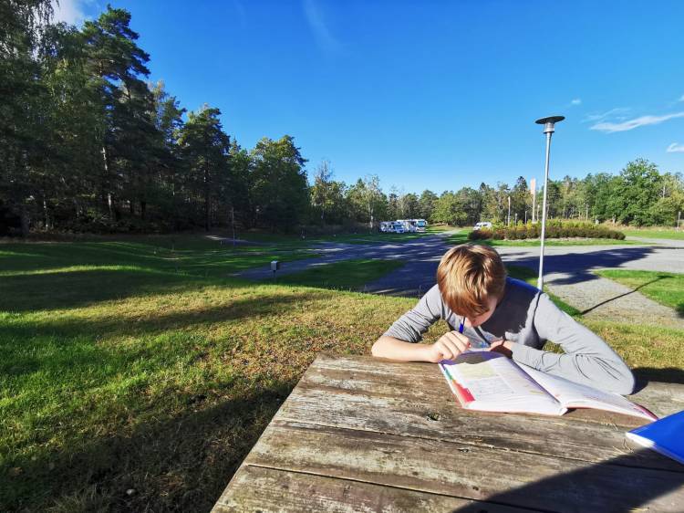 Le lendemain, nous avons le droit à une magnifique journée ensoleillée. Le matin, nous avons pu réserver la buanderie pour laver tout notre linge. Du coup, une fois terminé à 13H, nous n’avons plus le courage de bouger. Ce sera alors une journée « farniente » et école sous les derniers rayons chauds du soleil.