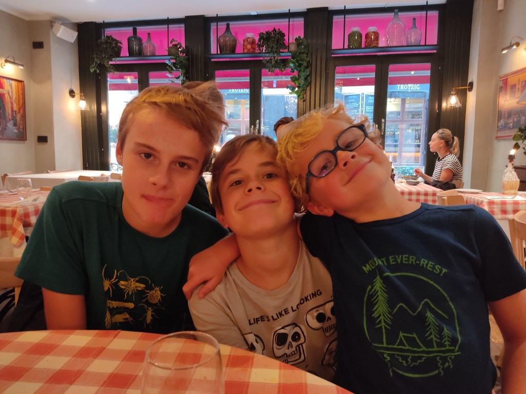 Déjeuner au restaurant : Ludo, désespéré de trouver le repas suédois typique, se trompe finalement et nous finissons chez l’italien qui sert aussi les plats typiques suédois. Au moins, on faisait plaisir aux enfants avec les pâtes et les pizzas et aux parents avec les plats suédois ! 🙂