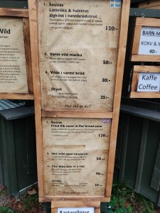 On déjeune sur place et oh bonheur !!! avec Ludo on prend une sorte de cornet au pain suédois avec de la viande d’élan fumé pour Ludo, une compotée de champignons pour Célou, sur une purée maison avec de la crème fouettée et de la confiture de « Cloudberries »… comment dirait-on ? c’était une tuerie :p