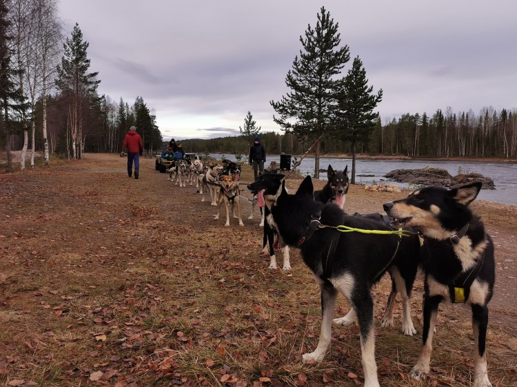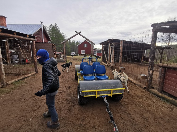 Ils lâchent les chiens qui vont faire partir l’attelage ce matin et les accrochent à une chaine dans l’ordre qu’ils souhaitent par rapport à l’attelage : au total 16 chiens vont tirer notre quad ce matin pour 1h de ballade.