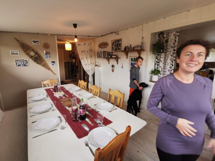 Nous rentrons pour le déjeuner. Cédric nous a préparé un bon repas chaud chez lui. Il nous raconte ses courses de musher, l’une d’elle faisait 500km sans stop. Il nous explique comment ils organisent le ravitaillement, le rapatriement de certains chiens pendant la course… Lisa suit Cédric pendant la course avec le pick-up sur lequel est installé une cabine dans laquelle Lisa dort et peut récupérer les quelques chiens trop fatigués de la course.