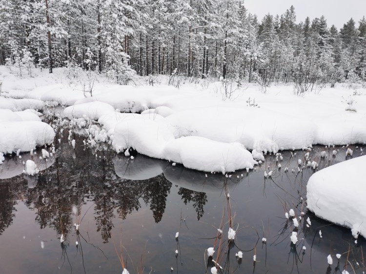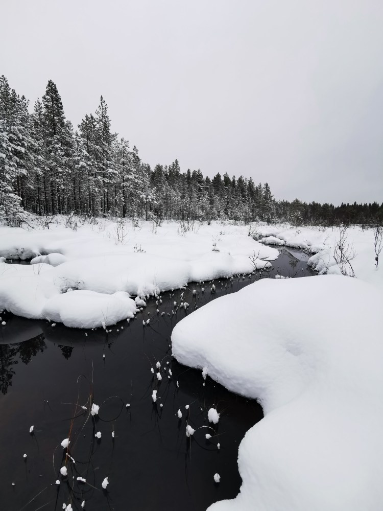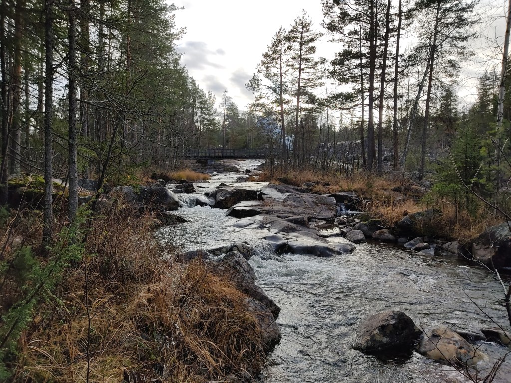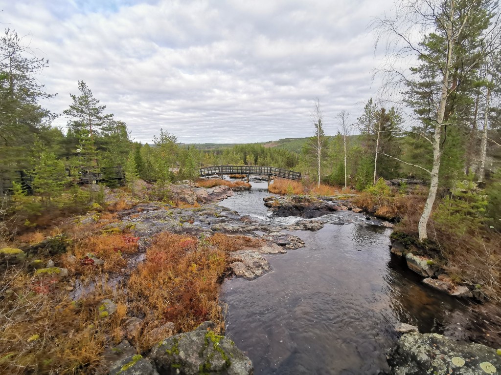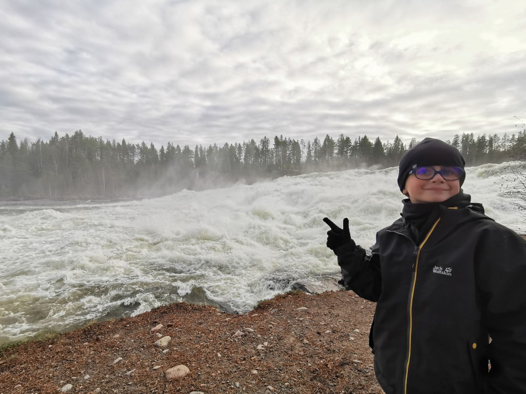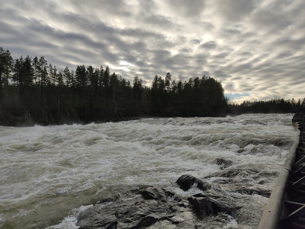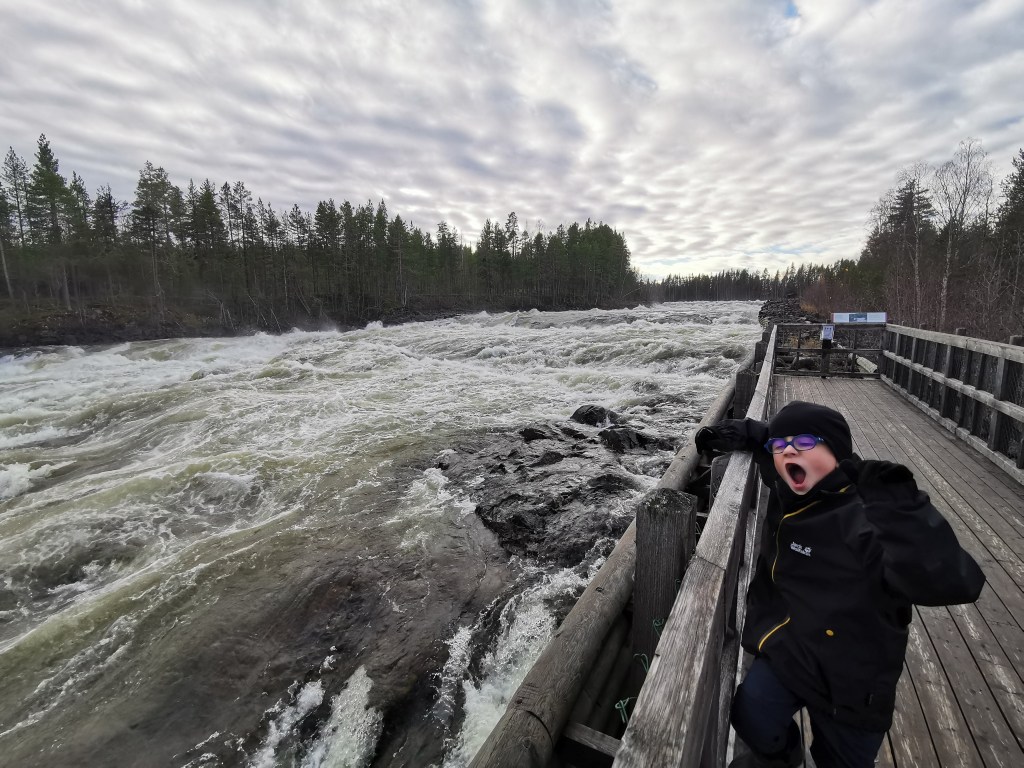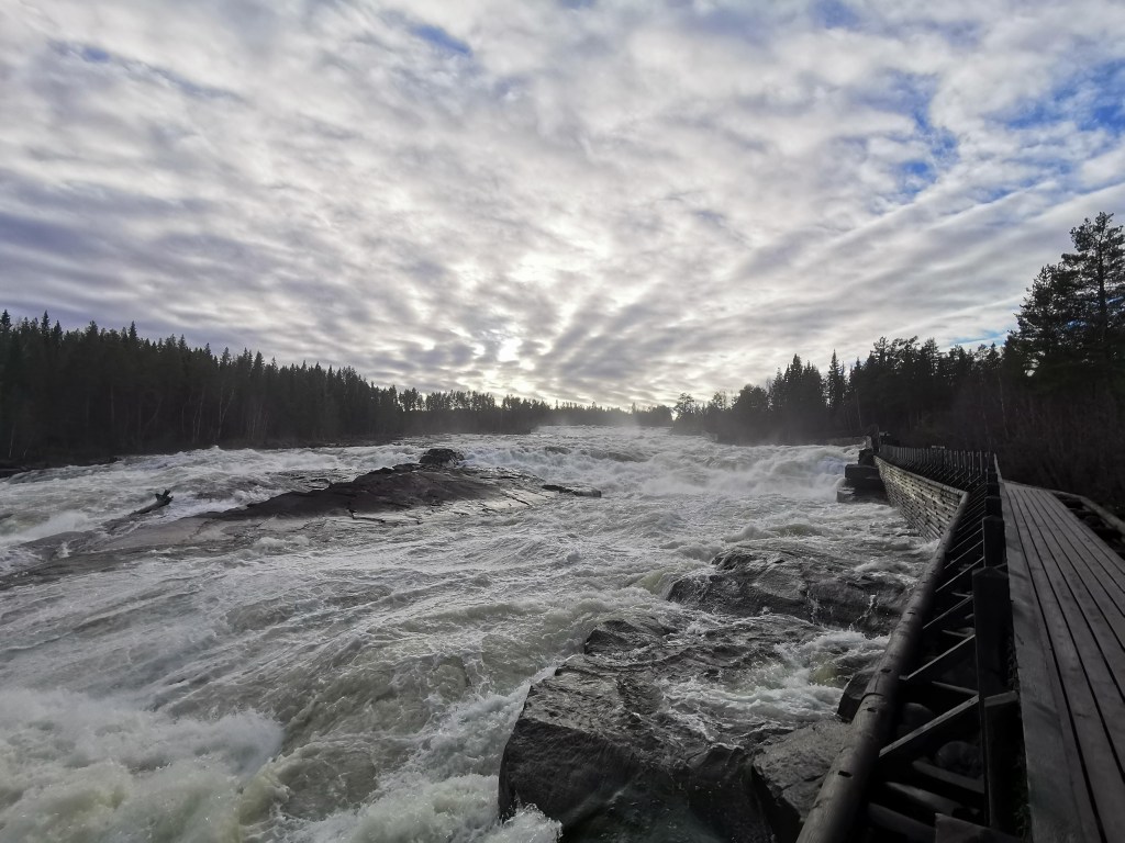 Nous faisons route tôt le matin pour rentrer en Laponie. A l’heure du déjeuner, nous arrivons à notre premier stop : les chutes de Storforsen sur la rivière Pite.