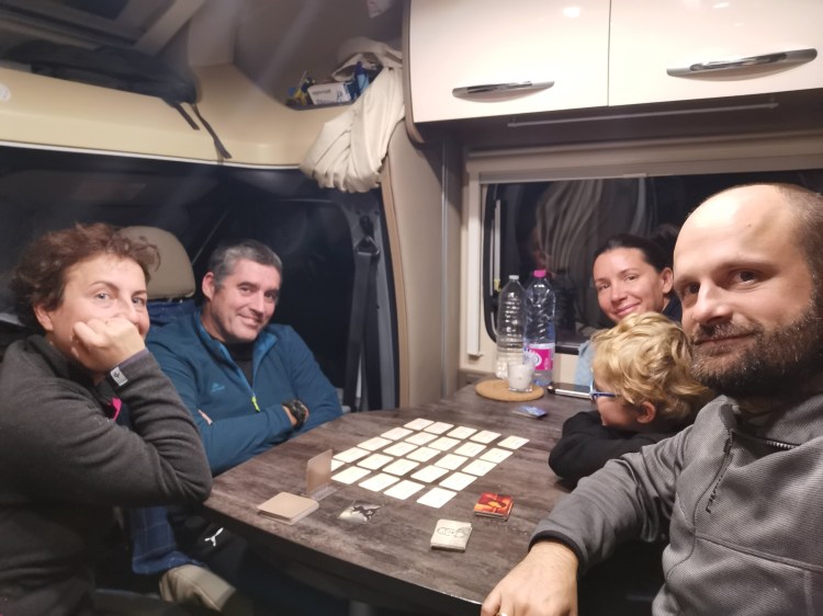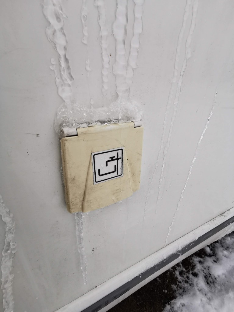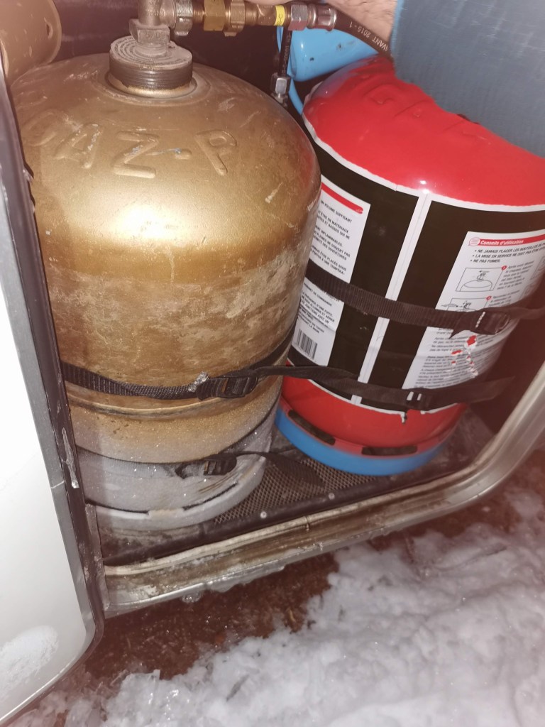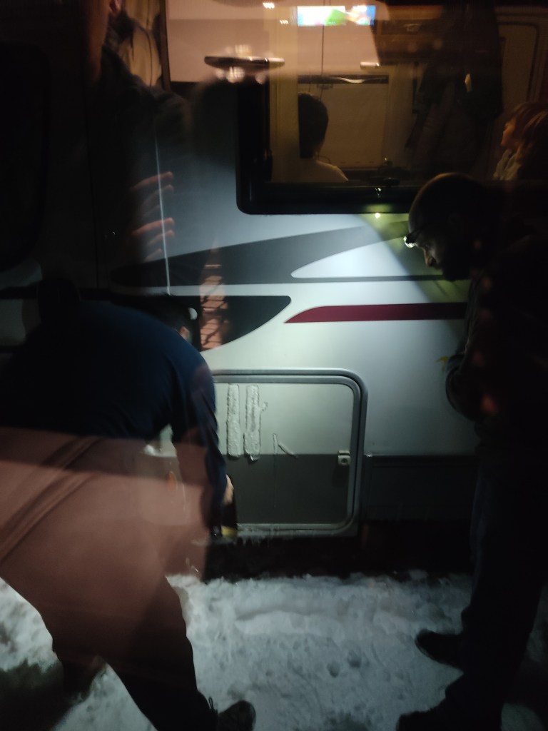 Nous découvrons les joies de la vie en camping-car l’hiver et constatons, encore novices, qu’il y a quelques ajustements à prévoir pour vivre dans ces conditions : les bombonnes de gaz des Francouglobetrotters qui ont commencé à geler, nos eaux grises qui ont gelé (impossible d’ouvrir la trappe), de la glace formée à l’intérieur du pare-brise, quelques soucis avec le chauffage au fuel, les chambres des enfants glaciales…