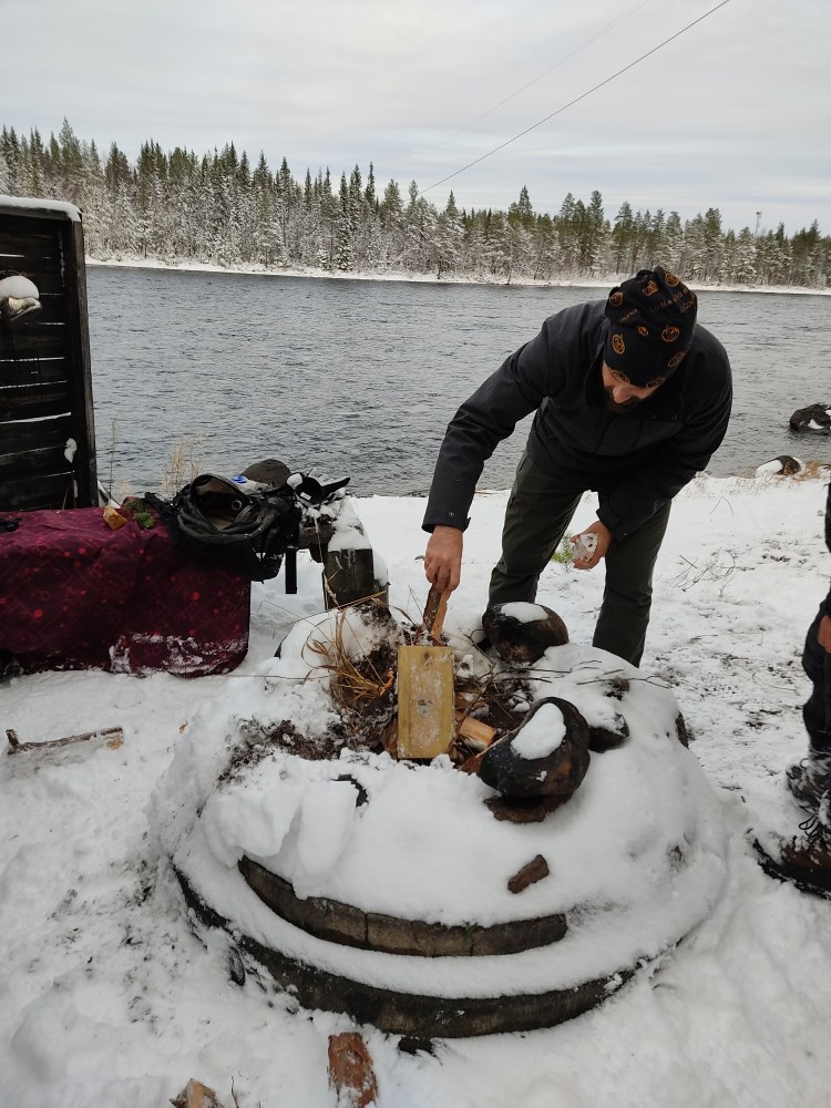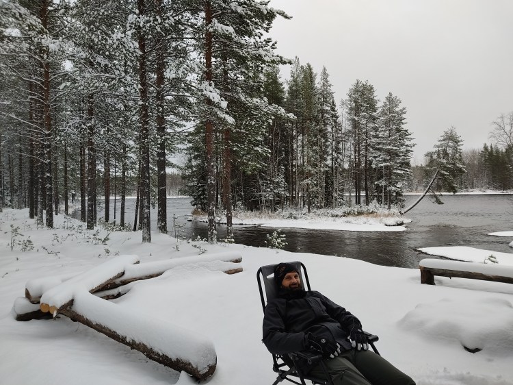 Le lendemain, dimanche 18octobre, on n’y croyait pas… Mais si la neige est tombée et pas qu’un peu !! Et avec les températures glaciales entre -5°C la journée et -15°C la nuit, autant dire que la route est impraticable avec nos pneus été. Nous allons rester du coup jusqu’au mardi matin avec nos amis sur place. Nous profitons de cette belle nature recouverte de neige. Nous nous essayons même à faire du feu au bord de la rivière pour faire rôtir des chamallows… mais nous ne sommes pas encore prêt pour Koh Lanta, le bois est définitivement trop humide pour brûler…