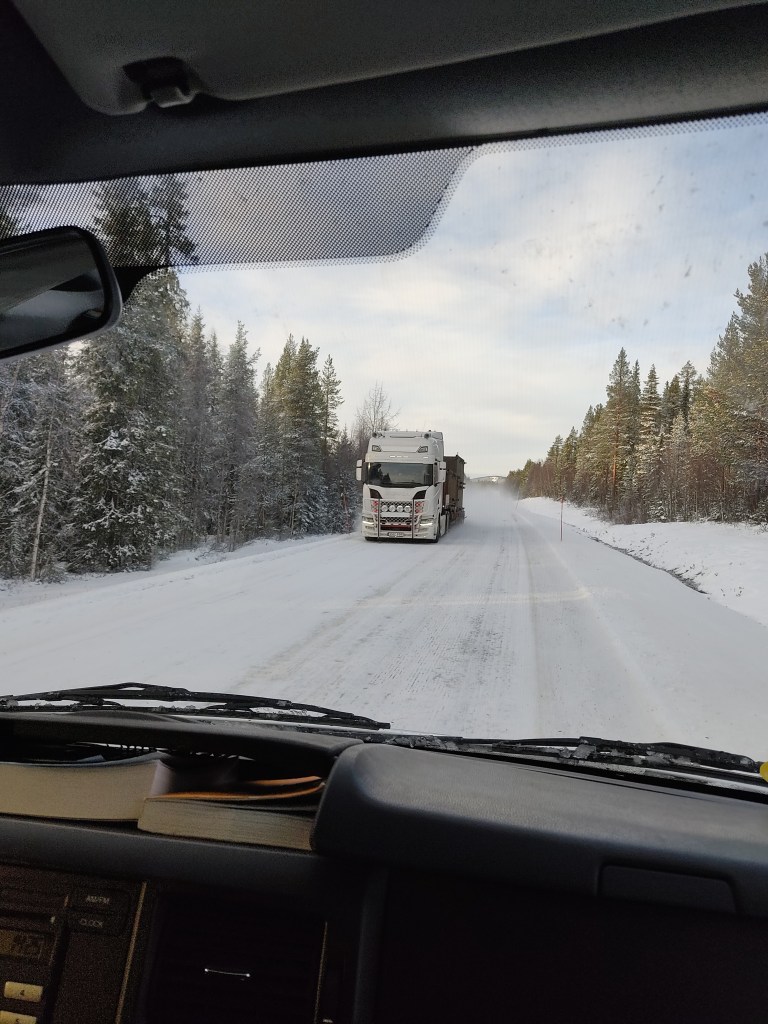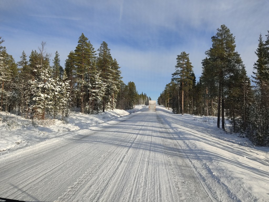 Mardi matin, nous montons les chaînes et faisons route vers le cercle polaire toujours avec nos amis les Francouglobetrotters 🙂 et nous allons découvrir que les routes ne sont vraiment pas dégagés : je vous laisse voir la photo avec le camion, nous sommes bien sur l’autoroute !!
