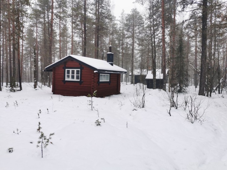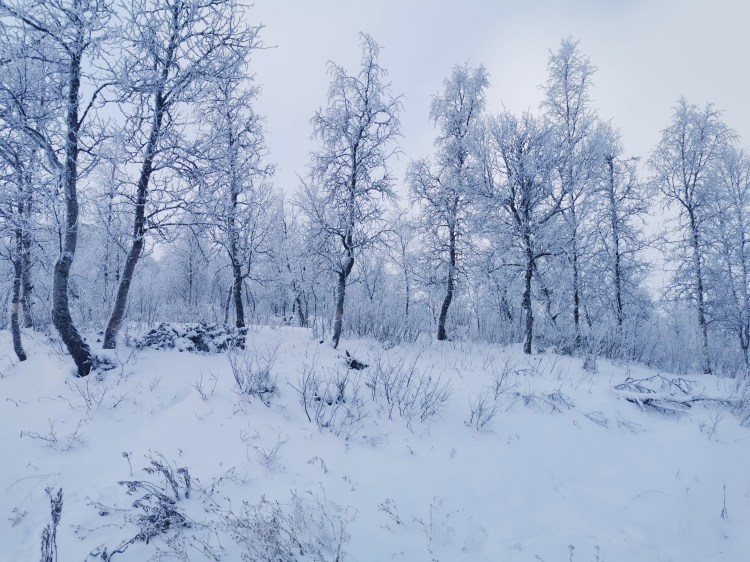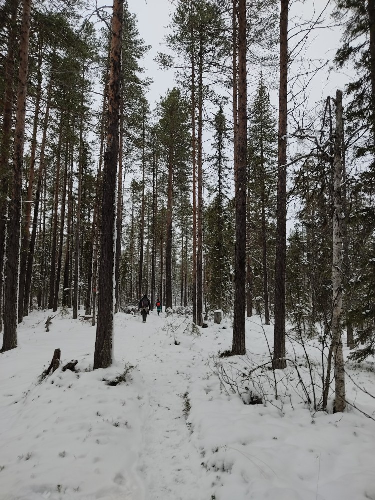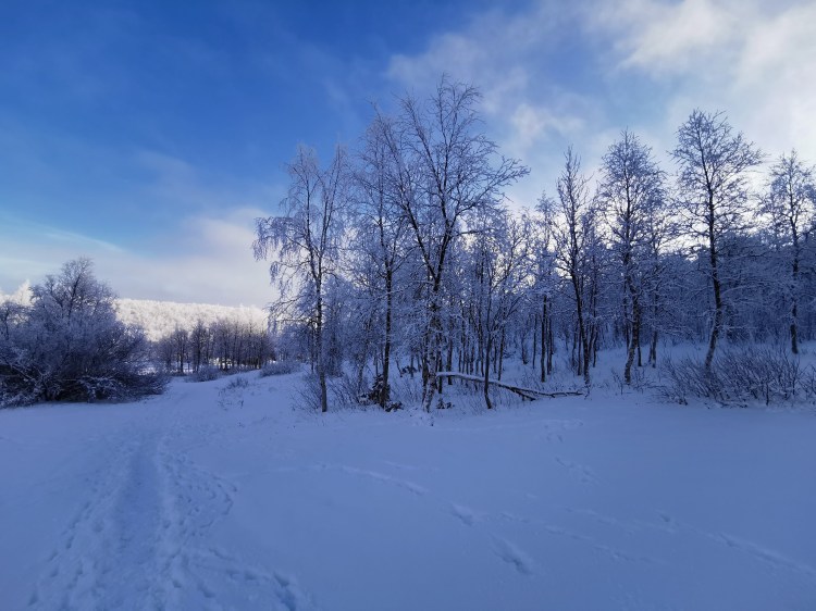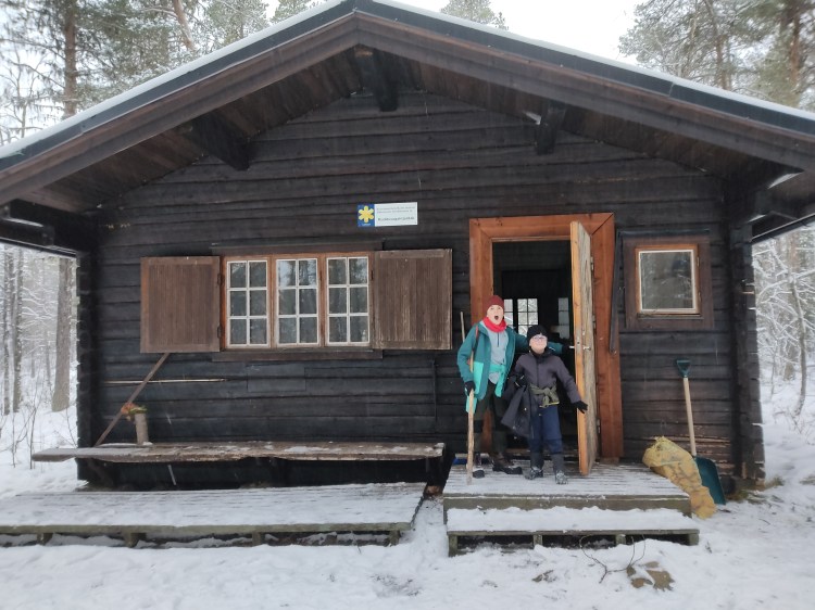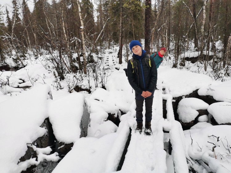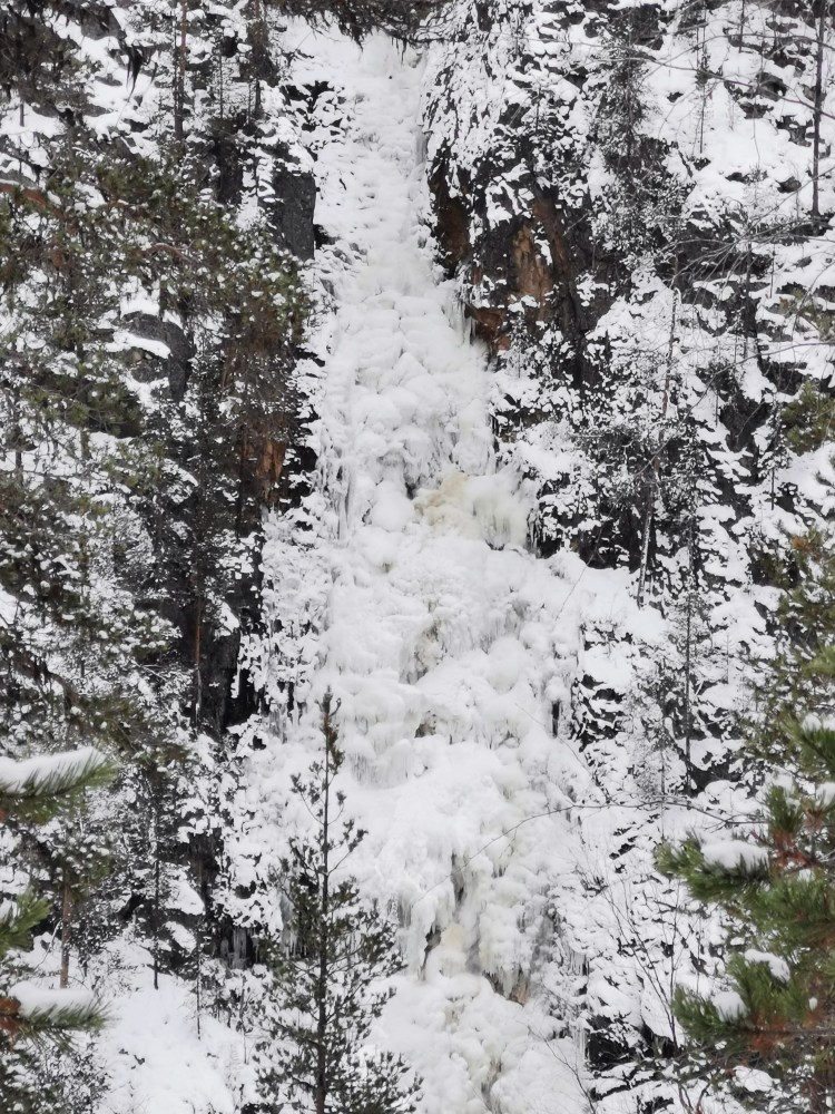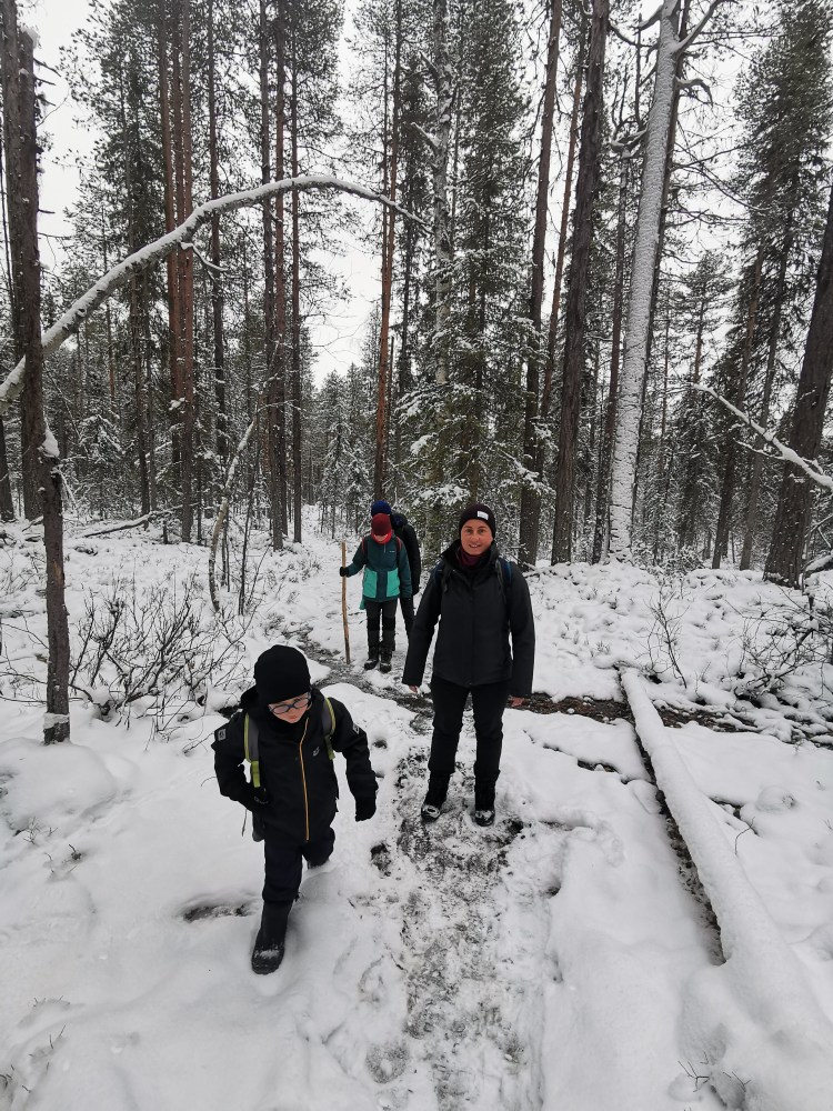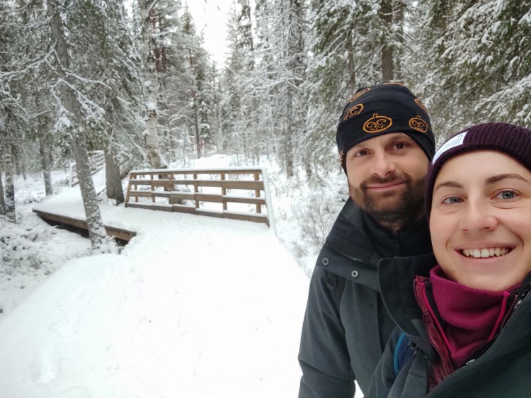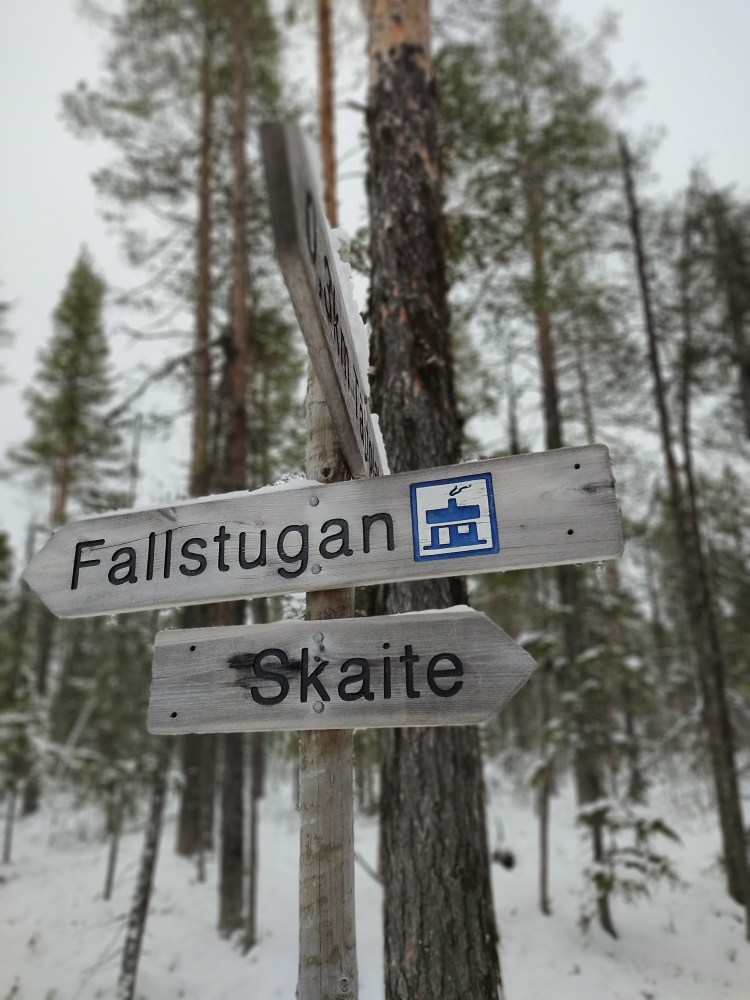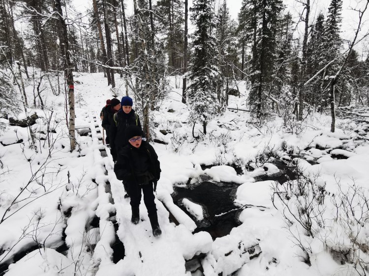 Nous partons pour 7 km de marche dans la neige au milieu de la forêt. Pour tout avouer, le paysage ne varie pas trop et marcher dans la neige n’est pas évident… Du coup les 7 km nous ont paru bien longs alors autant dire qu’intérieurement on espérait tous que la nuit en refuge ça allait le faire 🙂 Juste avant l’arrivée au refuge, on a un magnifique point de vue sur la chute Muddusfallet qui tombe de 60m dans la vallée.