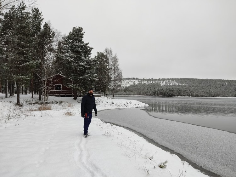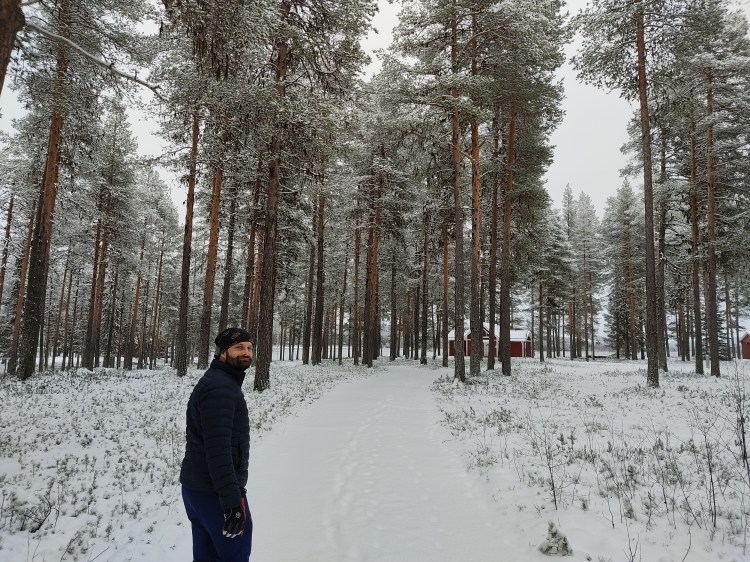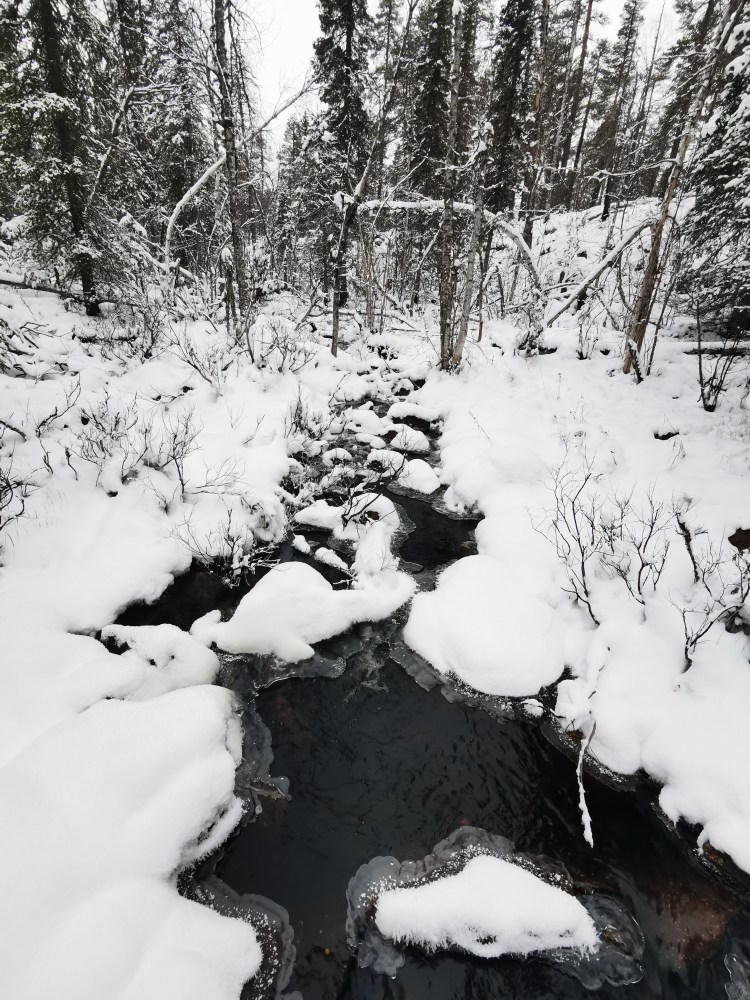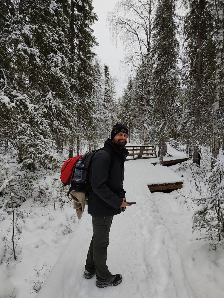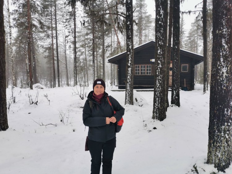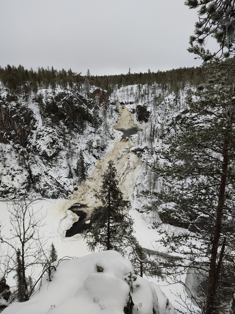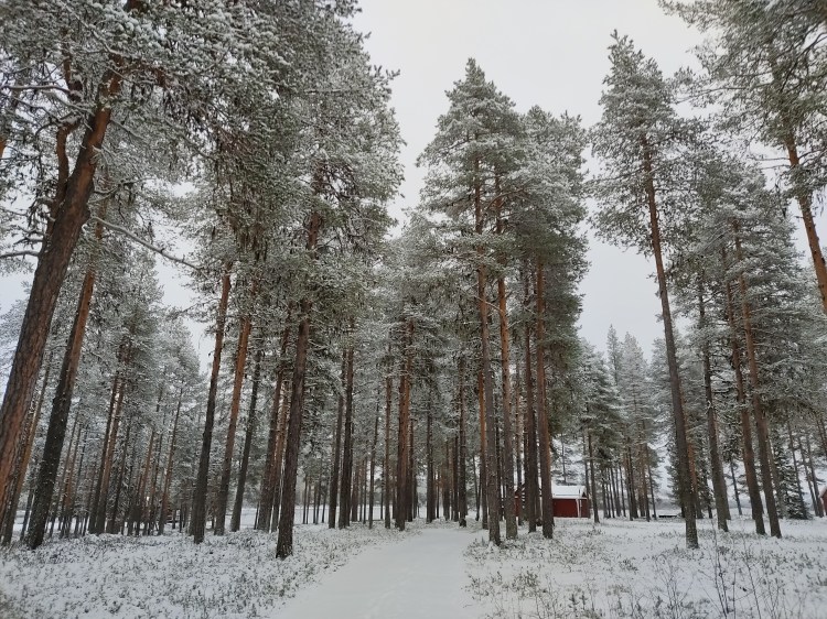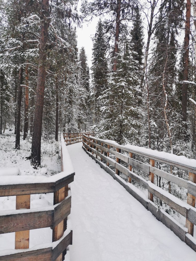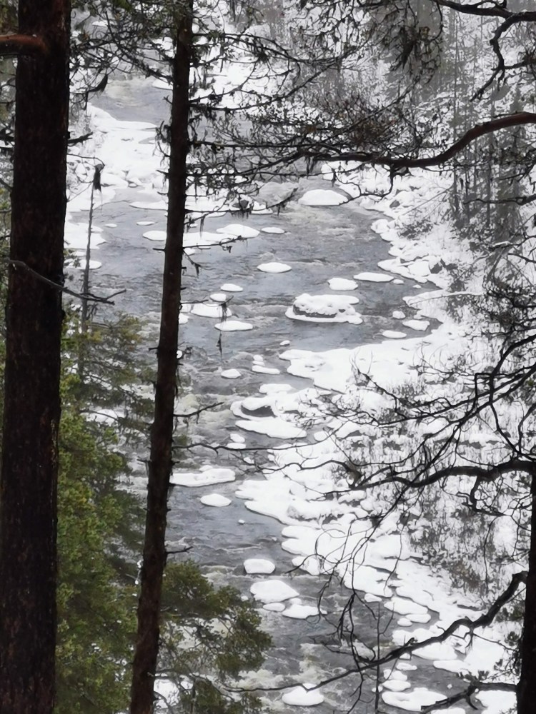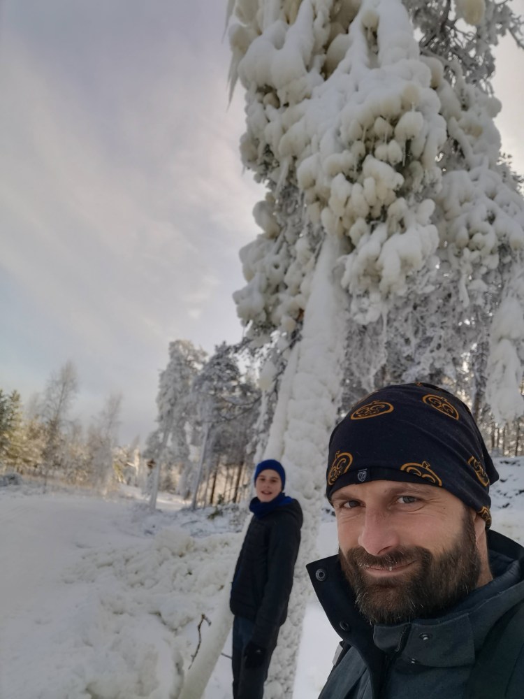 Nous partons pour 7 km de marche dans la neige au milieu de la forêt. Pour tout avouer, le paysage ne varie pas trop et marcher dans la neige n’est pas évident… Du coup les 7 km nous ont paru bien longs alors autant dire qu’intérieurement on espérait tous que la nuit en refuge ça allait le faire 🙂 Juste avant l’arrivée au refuge, on a un magnifique point de vue sur la chute Muddusfallet qui tombe de 60m dans la vallée.