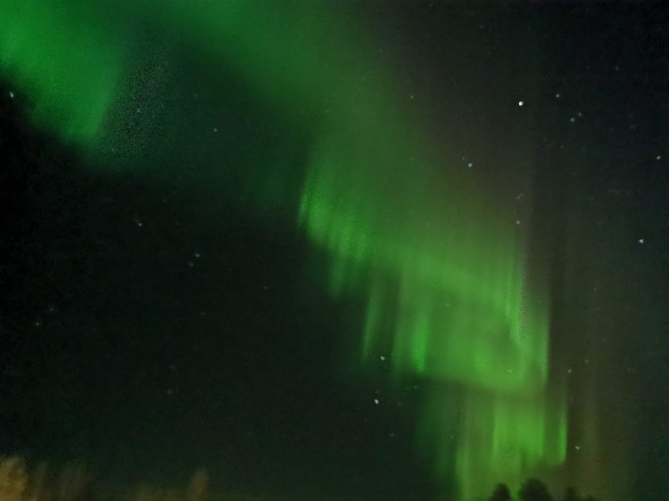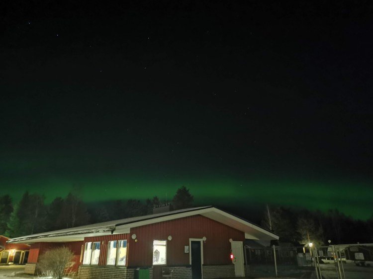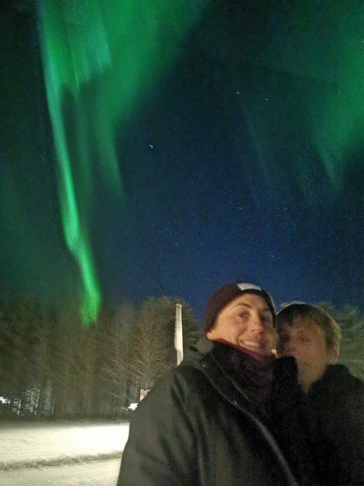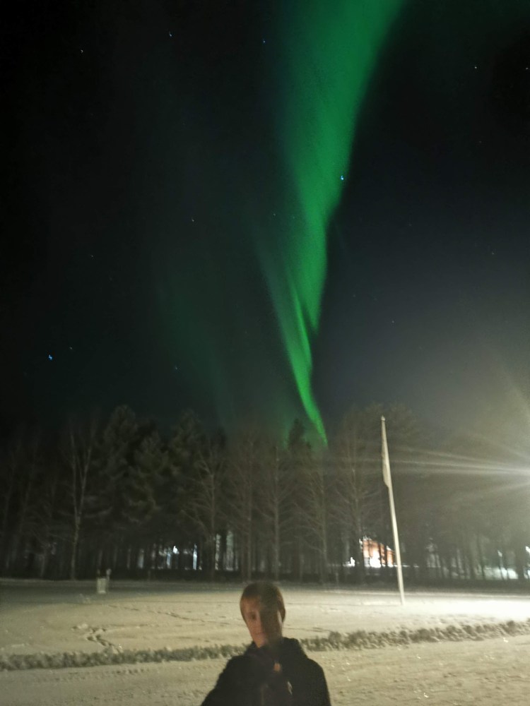 Comme tous les vendredis, nous avons notre soirée Koh Lanta. Nous décidons de nous installer dans la maison de services pour la soirée dîner et télévision. Avec le ciel clair que nous avons ce soir-là, nous sommes au taquet sur notre application « Aurora » afin de guetter l’arrivée des aurores boréales. Petit à petit dans la soirée, les probabilités d’en voir augmentent… En attendant les fameux 40% annoncés dans 1 heure, Célou décide quand-même de pointer mon nez dehors pour voir si jamais une aurore commençait… et là ! Ohhhhhhh ! Ahhhhhhhhhhhh ! Comme on dit, l’effet wahou !! Nous avons vu les aurores danser au dessus de notre tête, un ballet féérique… Hugo nous a même improvisé sa danse des aurores.