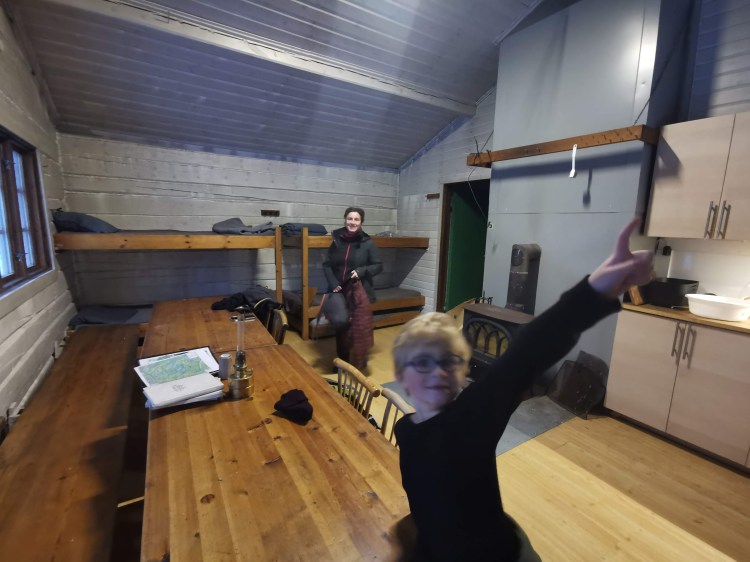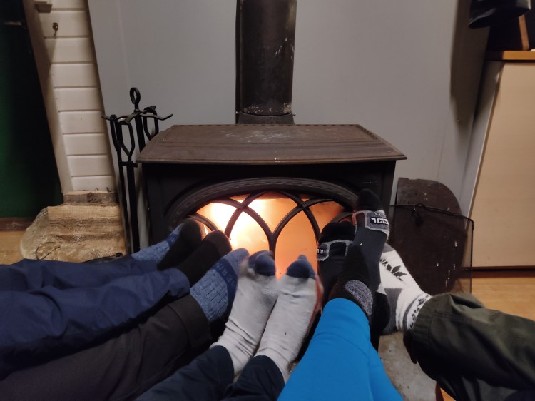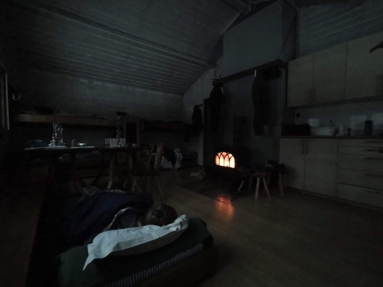 Enfin nous arrivons au refuge… Ouf il y a tout ce qu’il faut : lits, électricité, poêle et bois pour se chauffer, de la neige à proximité à défaut de trouver le point d’eau pour avoir de l’eau pour la soirée. Il fait 3°C quand nous entrons dans le chalet, il nous faudra 2 petites heures pour réchauffer jusqu’à 18°C, de quoi passer une bonne nuit. Célou a la surprise de recevoir quelques vidéos surprise pour son anniversaire de sa famille et de ses conscrits. Elle se fait tirer 40 fois les oreilles par Hugo et nous trinquons tous ensemble à la neige fondue !