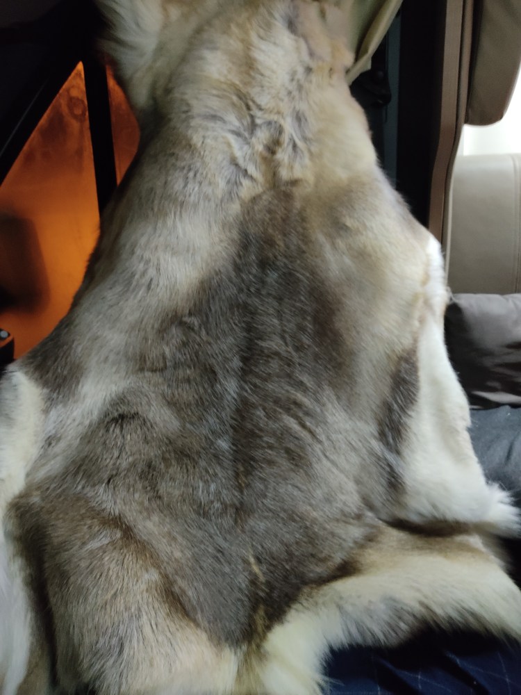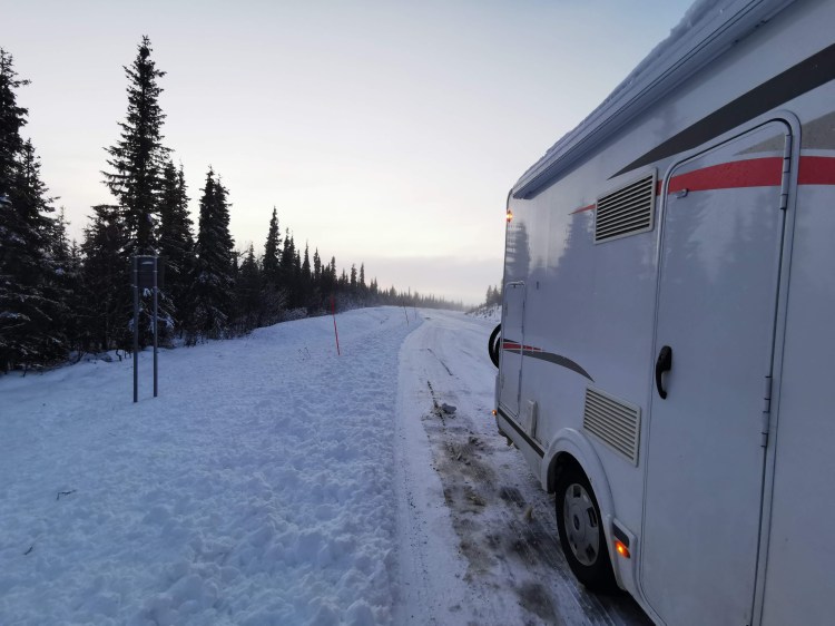 Nous arrivons à notre camping-car pour le déjeuner. Il redémarre ouf ! Le temps de se préparer un bon repas chaud et hop on reprend la route blanche direction Gallivare. Notre monteur de pneus nous attend à 7h du matin pétantes le lendemain. Nous verrons un renne sur le bord de la route mais nous n’aurons pas le temps de le photographier… mais à défaut quelques kms plus loin, nous tomberons sur un magasin en bord de route qui vend tout et rien et nous y trouverons une belle peau de renne… (oui nous sommes un peu barbares :D)