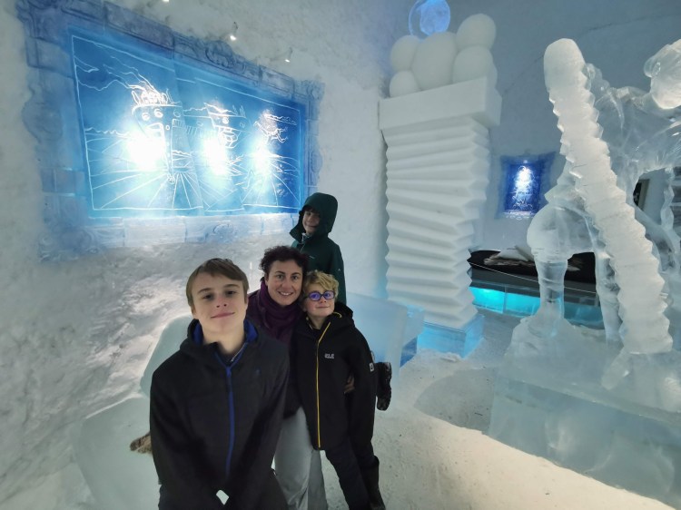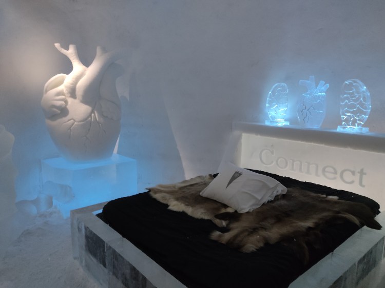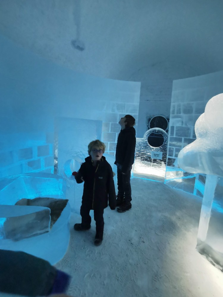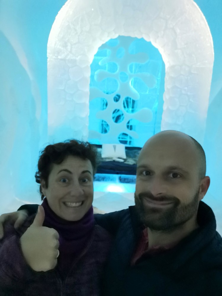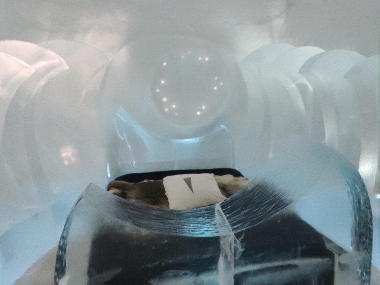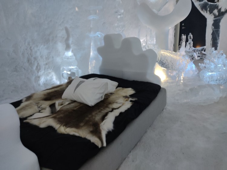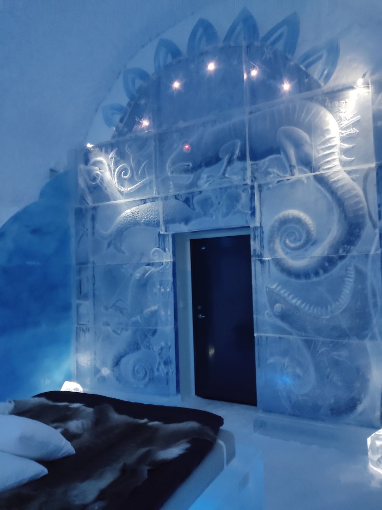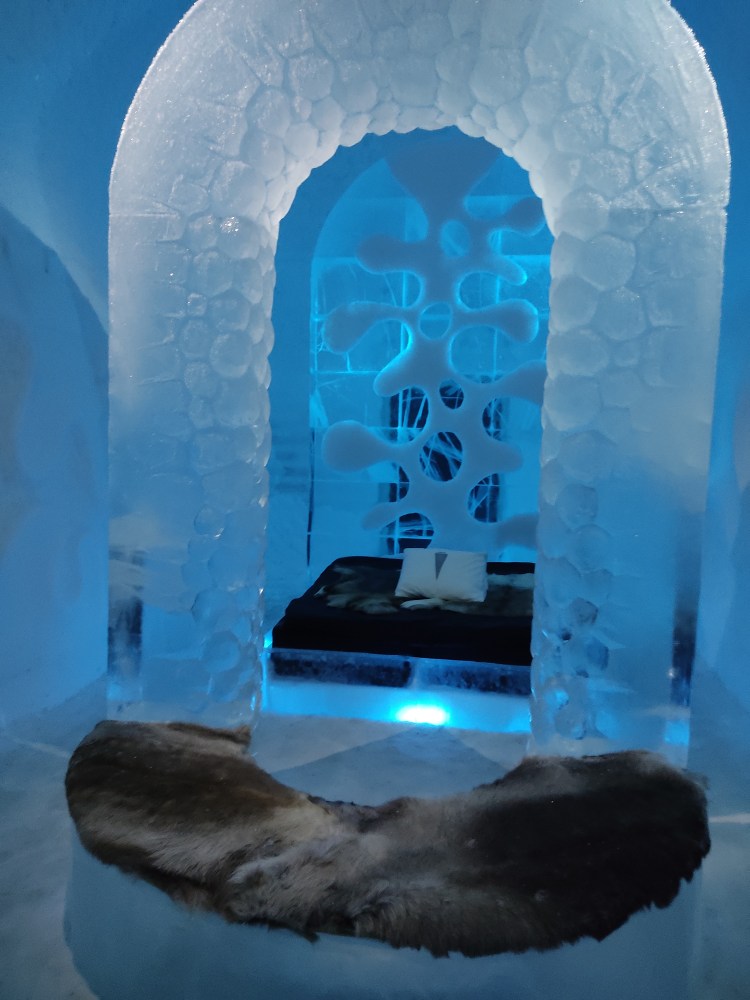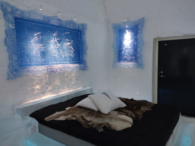 Nous nous arrêtons à Jukkasjarvi où se trouve le premier hôtel de glace construit dans le monde. Cet hôtel est éphémère et est reconstruit chaque année. Il faut compter entre 200€ et 500€ la nuit pour y dormir par -5°C… Chaque chambre est sculptée par un artiste et a son propre style. Afin de donner une idée aux touristes de cet hotel qu’elle que soit la période de l’année, ils ont construit un bâtiment ouvert 365 jours par an que l’on peut visiter. La visite vaut vraiment le détour.
