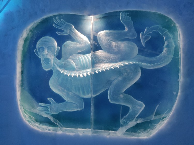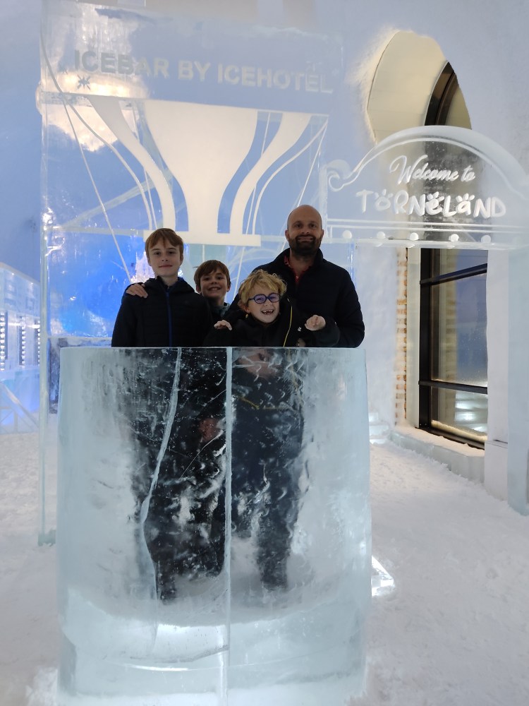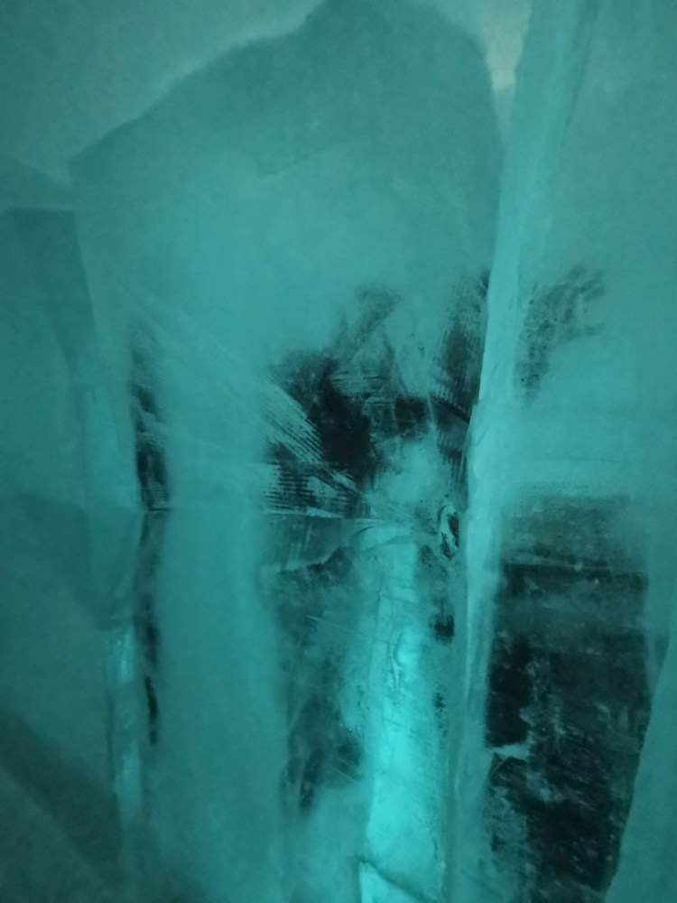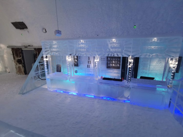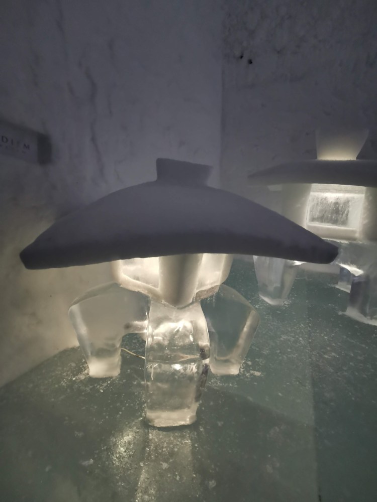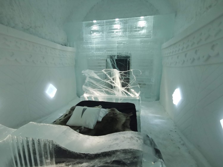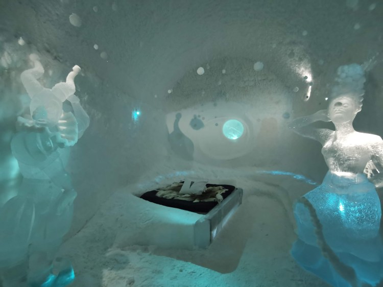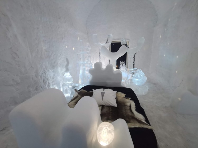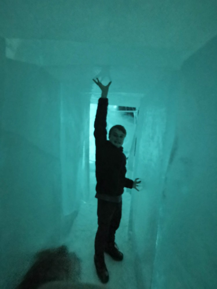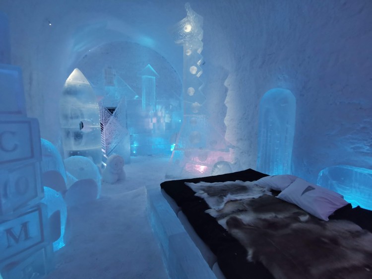 Nous nous arrêtons à Jukkasjarvi où se trouve le premier hôtel de glace construit dans le monde. Cet hôtel est éphémère et est reconstruit chaque année. Il faut compter entre 200€ et 500€ la nuit pour y dormir par -5°C… Chaque chambre est sculptée par un artiste et a son propre style. Afin de donner une idée aux touristes de cet hotel qu’elle que soit la période de l’année, ils ont construit un bâtiment ouvert 365 jours par an que l’on peut visiter. La visite vaut vraiment le détour.