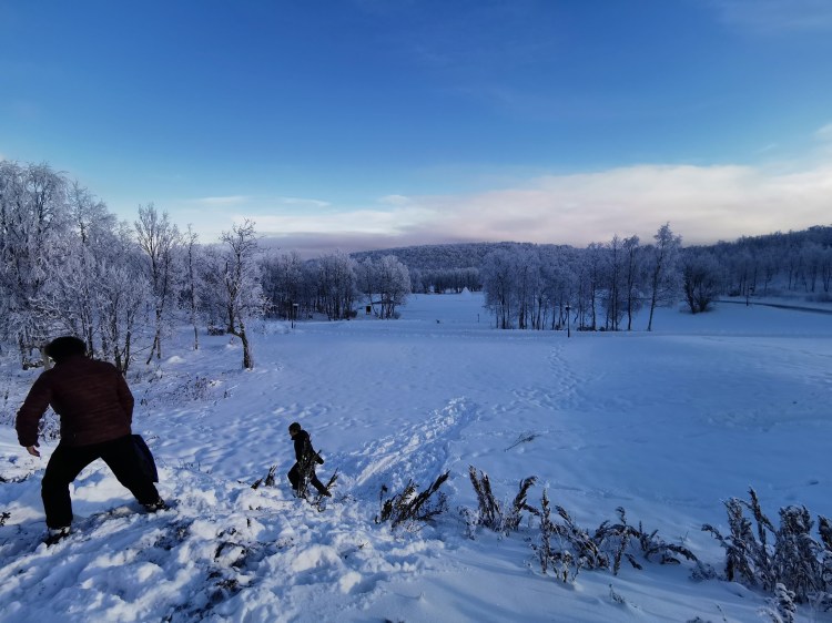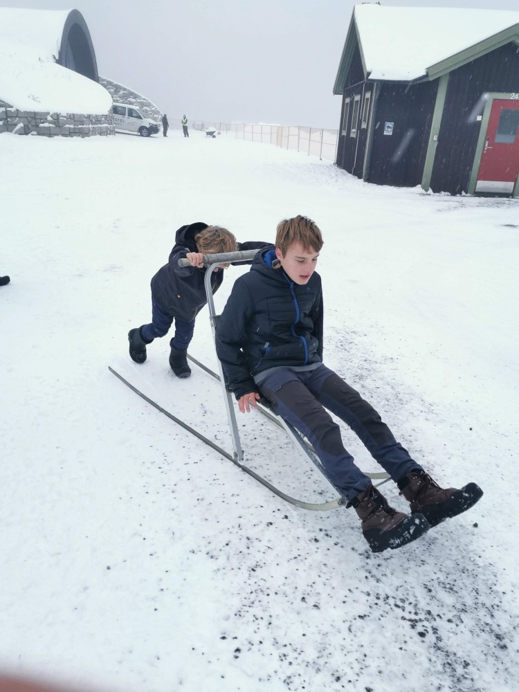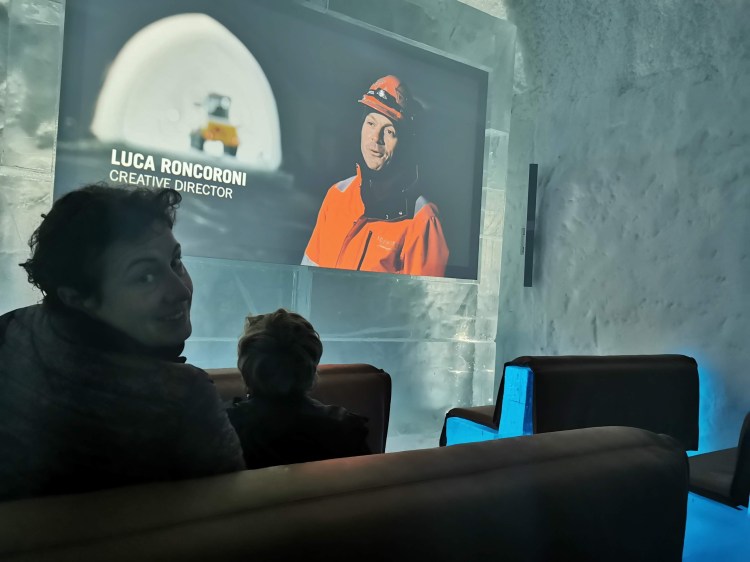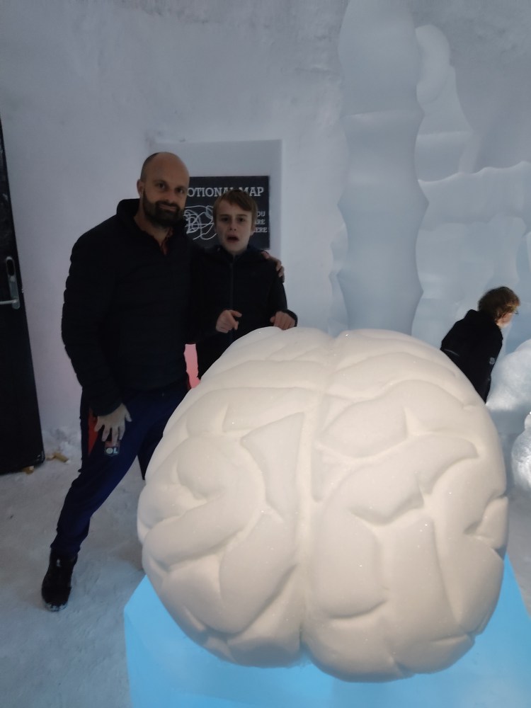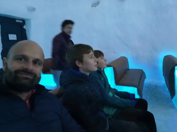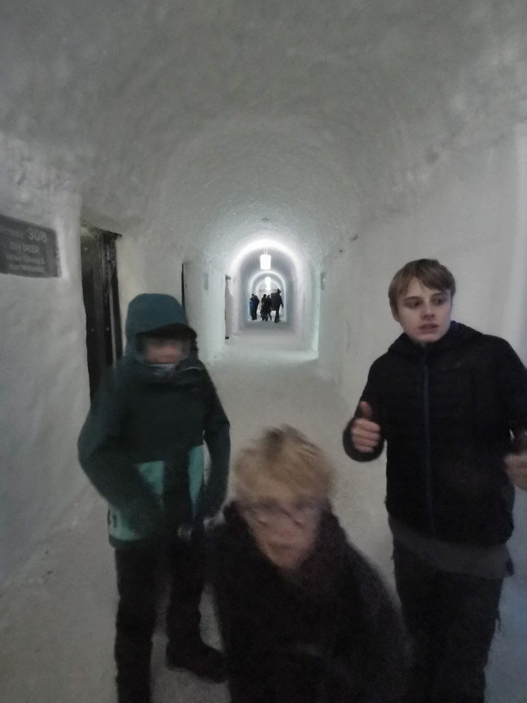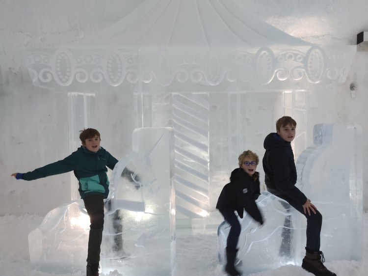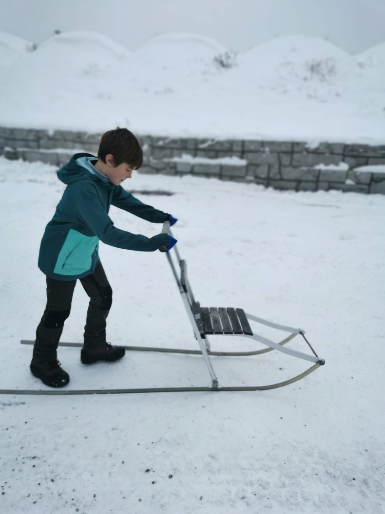 Vous y croyez ? Oh non, je crois que même si on nous l’offrait, nous n’y dormirions pas. Nous avons passé 1H dans ce magnifique hôtel à -5°C… autant vous dire que nous avons trouvé qu’il faisait chaud une fois dehors sous la neige par 0°C. Nous sommes tellement réchauffés que nous profitons des quelques luges disponibles pour s’amuser sur la neige.