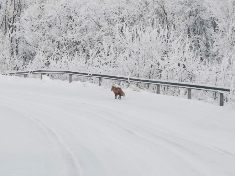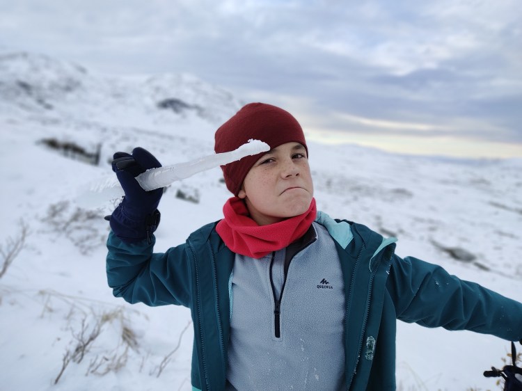 Le lendemain, les enfants sont moins motivés pour randonner avec tout ce qu’on a fait depuis quelques jours. Du coup, on laisse les enfants profiter des joies de la neige : nous improvisons des luges avec des sacs de course… De notre côté, nous allons nous promener tous les 2 dans les alentours.