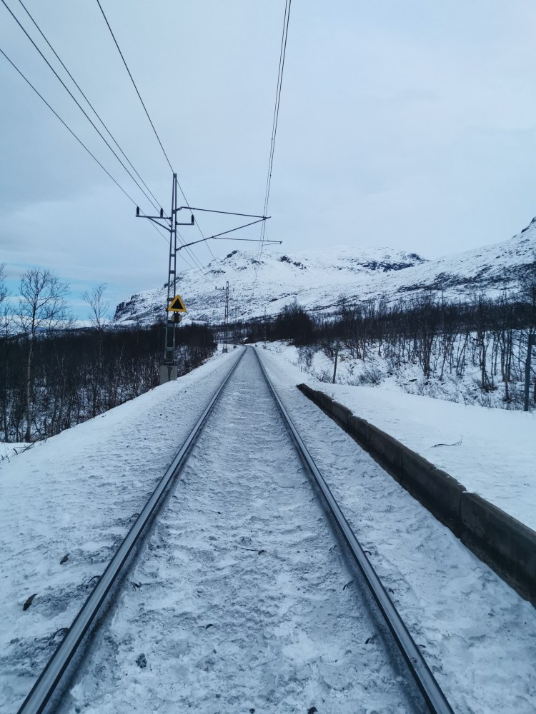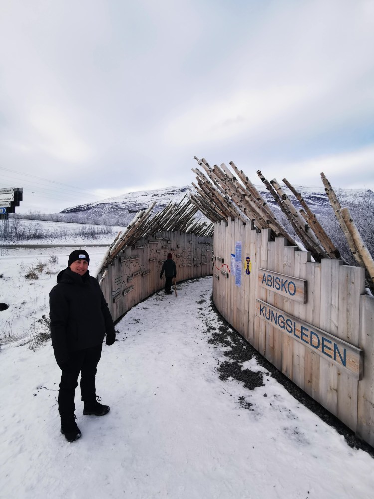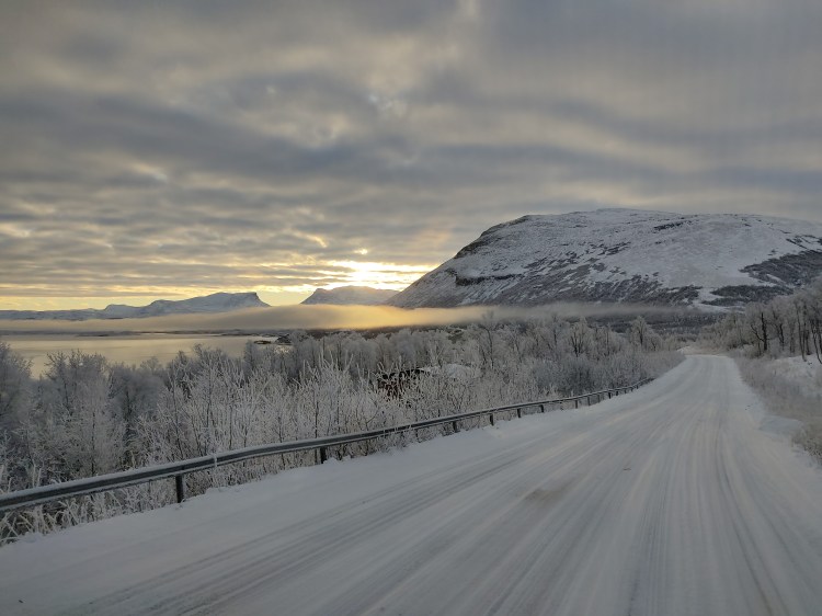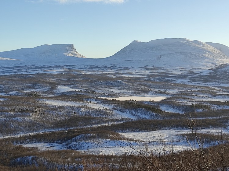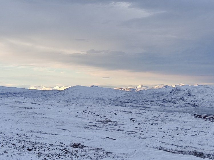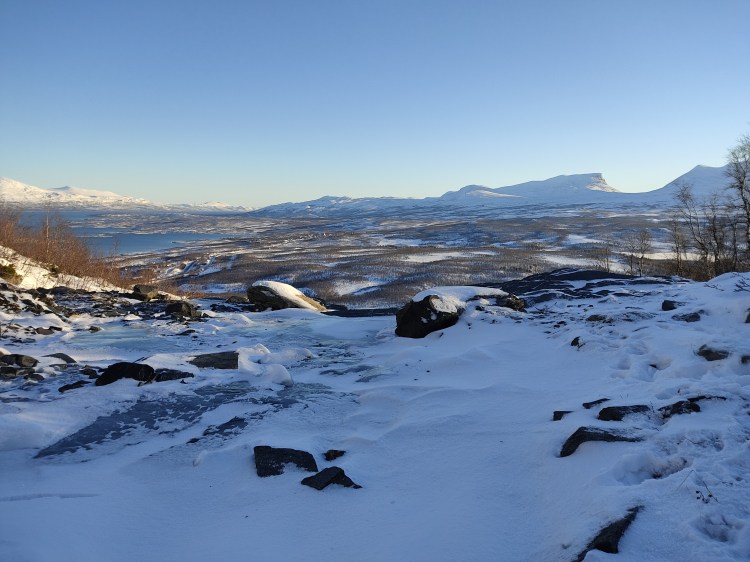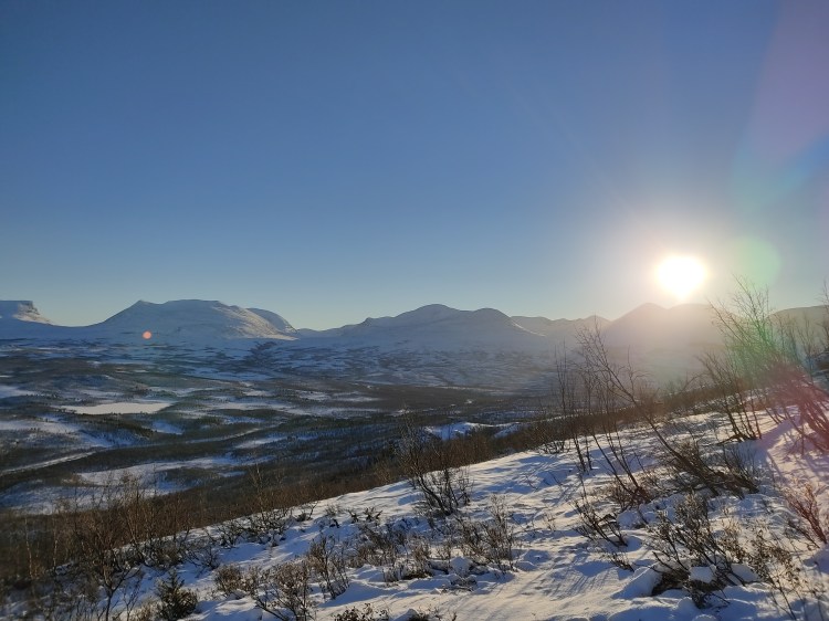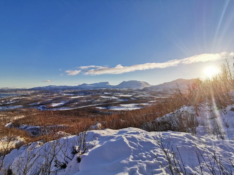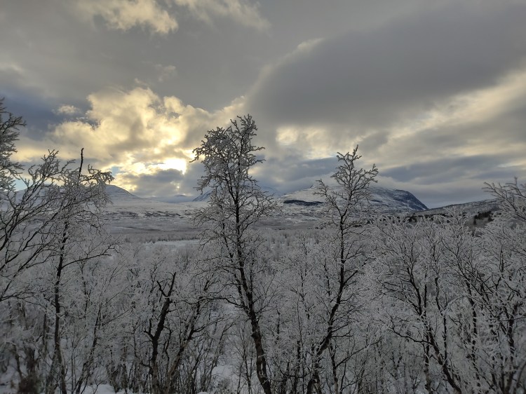 Nous arrivons dans l’après-midi sur Abisko mais il fait déjà nuit : le soleil se couche à 16h. Nous nous renseignons auprès de l’Abisko Tourist Station pour les informations touristiques à savoir les principales randonnées du coin avant de regagner un camping quelques km plus loin dans une petite station de ski. L’hôtel gérant le camping est déjà fermé à 16h45… alors nous nous débrouillons pour trouver une prise au camping et retournons le lendemain matin à l’hôtel pour se mettre en règle pour les nuits suivantes. Mais problème de réseau, impossible de payer par CB, l’hotel nous donne tout de même les accès et nous demande de revenir payer le lendemain… En redescendant de l’hôtel, nous avons un magnifique point de vue sur la montagne en U symbole de l’entrée en Laponie suédoise.