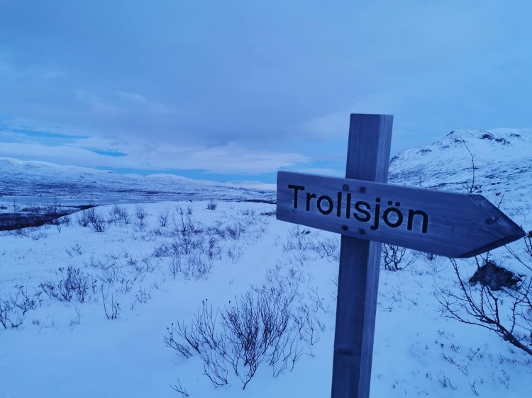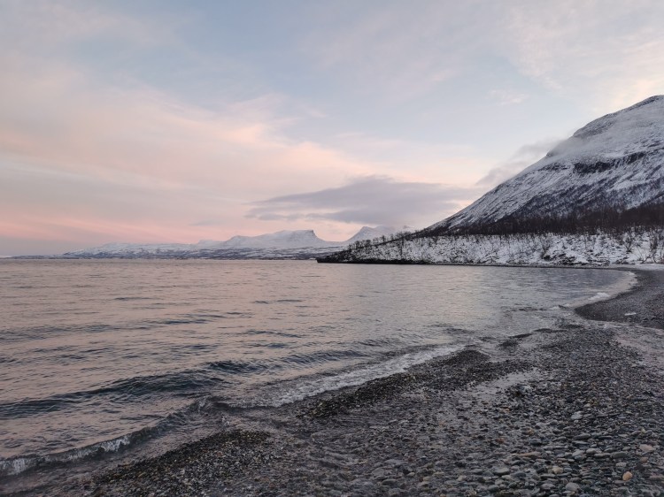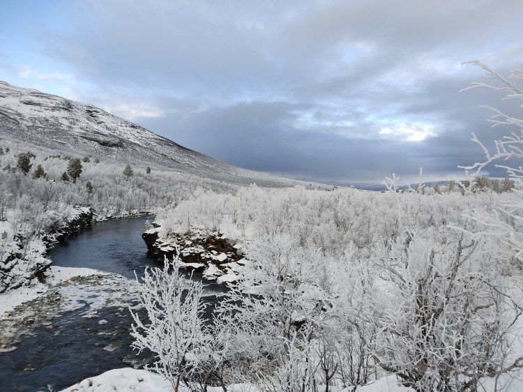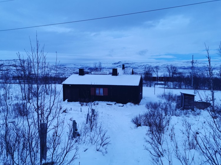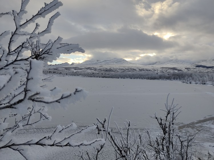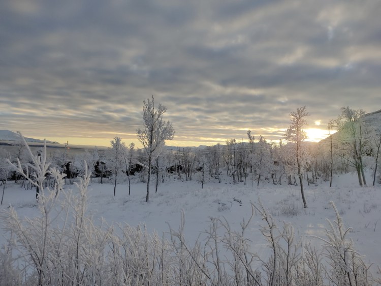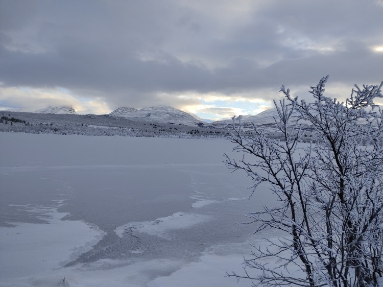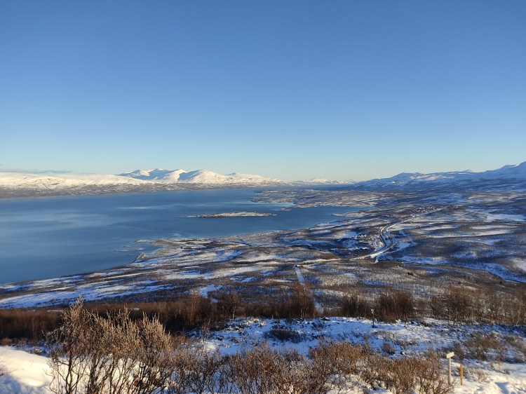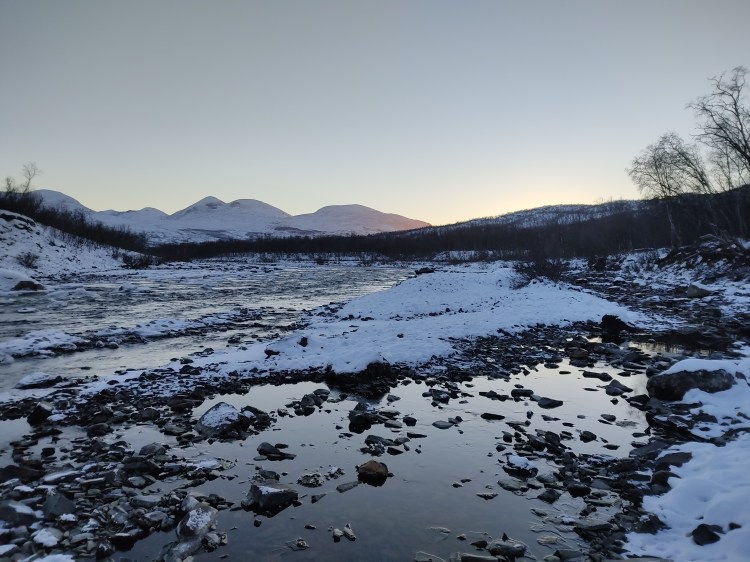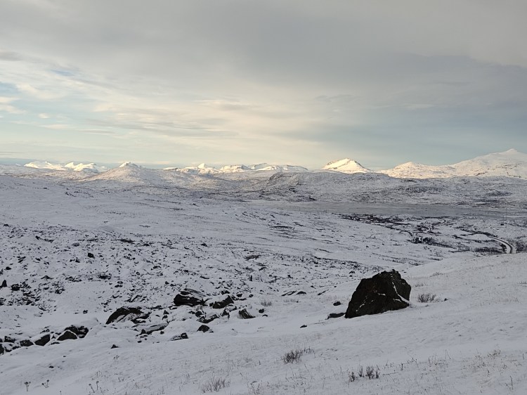 Nous arrivons dans l’après-midi sur Abisko mais il fait déjà nuit : le soleil se couche à 16h. Nous nous renseignons auprès de l’Abisko Tourist Station pour les informations touristiques à savoir les principales randonnées du coin avant de regagner un camping quelques km plus loin dans une petite station de ski. L’hôtel gérant le camping est déjà fermé à 16h45… alors nous nous débrouillons pour trouver une prise au camping et retournons le lendemain matin à l’hôtel pour se mettre en règle pour les nuits suivantes. Mais problème de réseau, impossible de payer par CB, l’hotel nous donne tout de même les accès et nous demande de revenir payer le lendemain… En redescendant de l’hôtel, nous avons un magnifique point de vue sur la montagne en U symbole de l’entrée en Laponie suédoise.