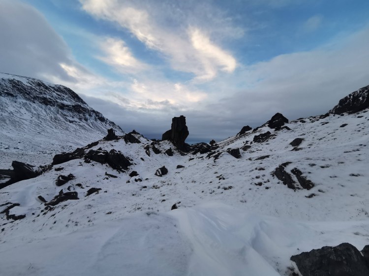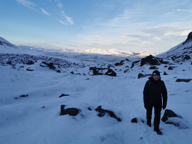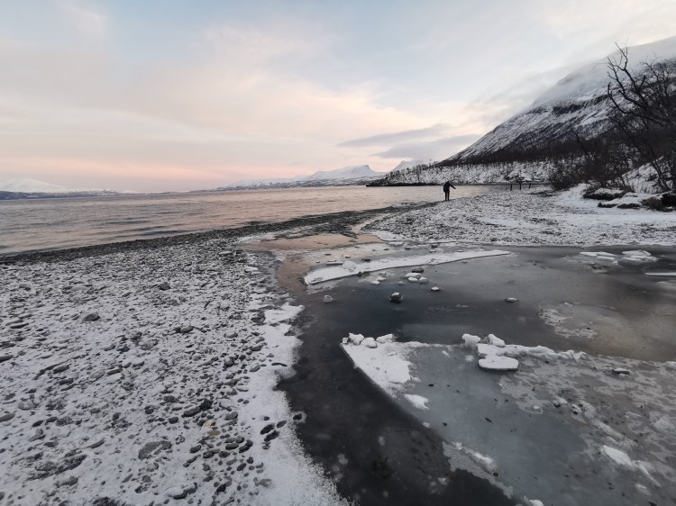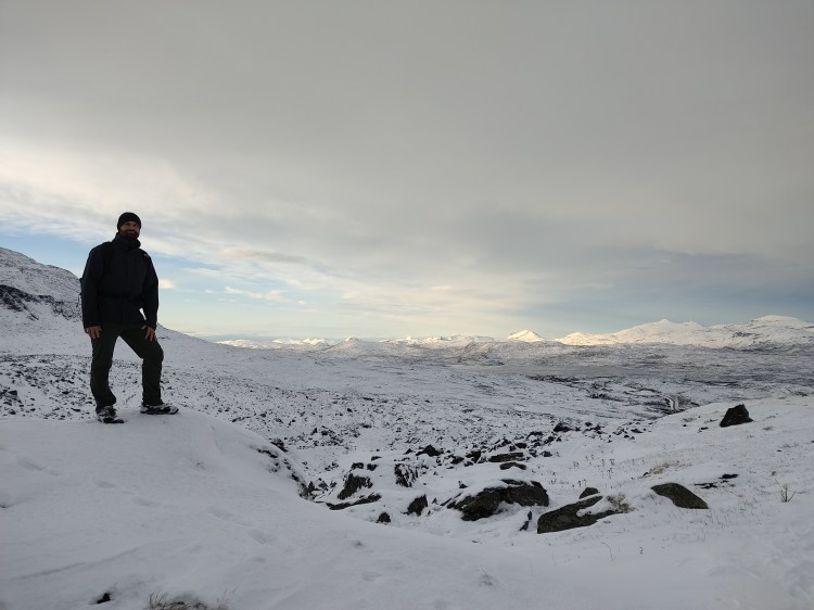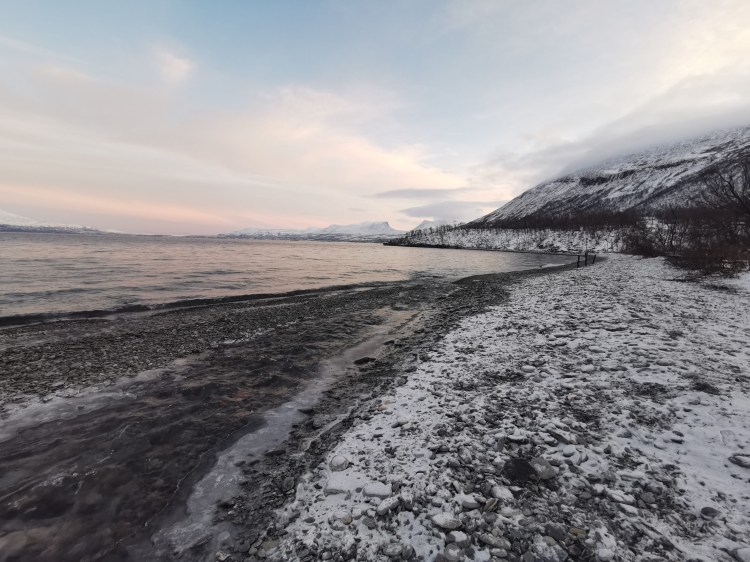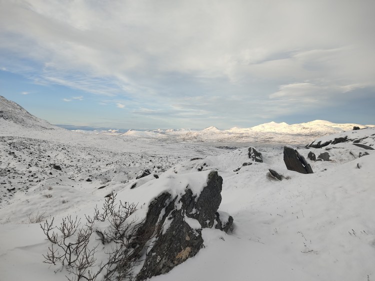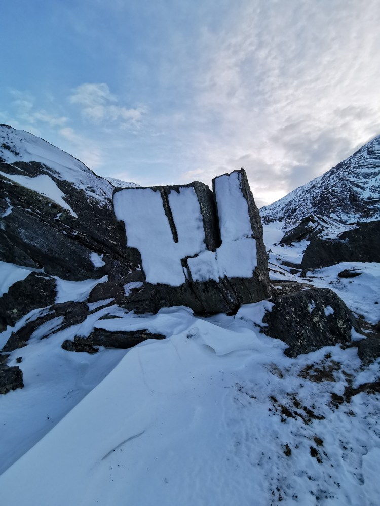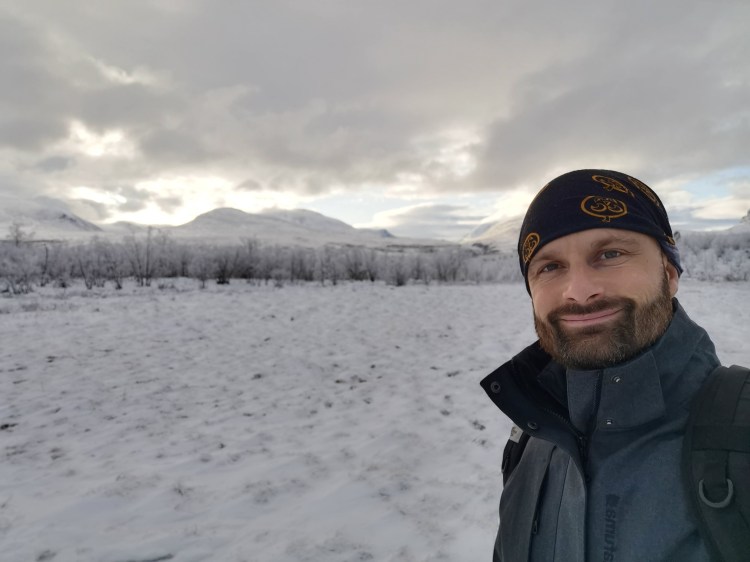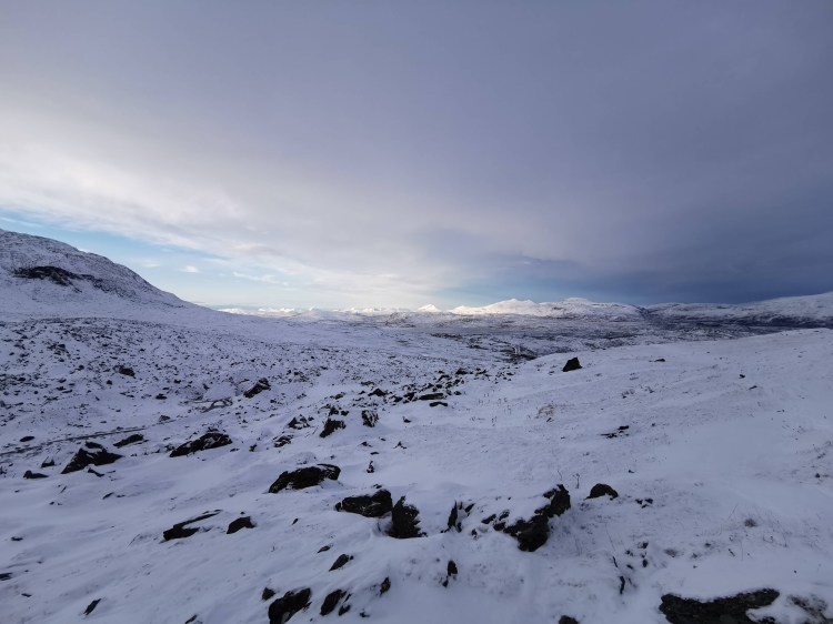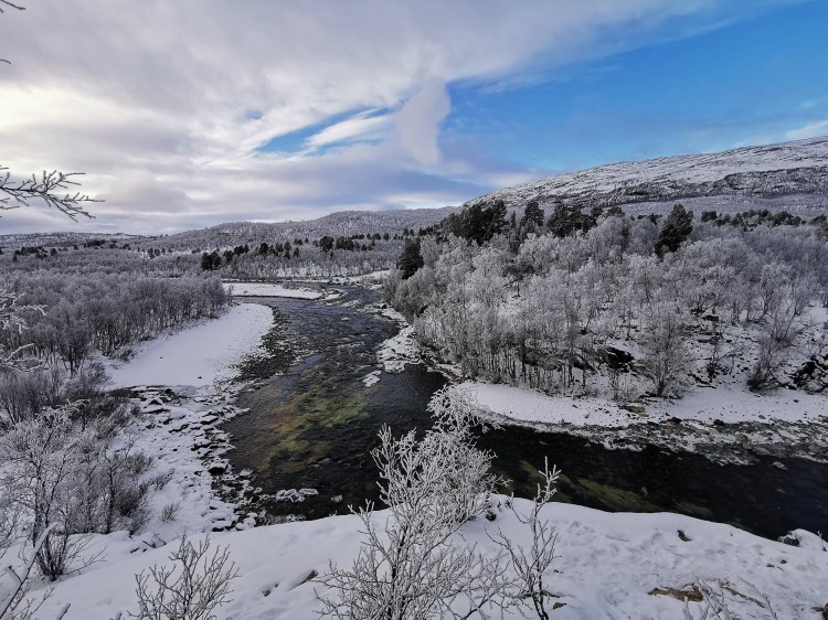 Nous arrivons dans l’après-midi sur Abisko mais il fait déjà nuit : le soleil se couche à 16h. Nous nous renseignons auprès de l’Abisko Tourist Station pour les informations touristiques à savoir les principales randonnées du coin avant de regagner un camping quelques km plus loin dans une petite station de ski. L’hôtel gérant le camping est déjà fermé à 16h45… alors nous nous débrouillons pour trouver une prise au camping et retournons le lendemain matin à l’hôtel pour se mettre en règle pour les nuits suivantes. Mais problème de réseau, impossible de payer par CB, l’hotel nous donne tout de même les accès et nous demande de revenir payer le lendemain… En redescendant de l’hôtel, nous avons un magnifique point de vue sur la montagne en U symbole de l’entrée en Laponie suédoise.