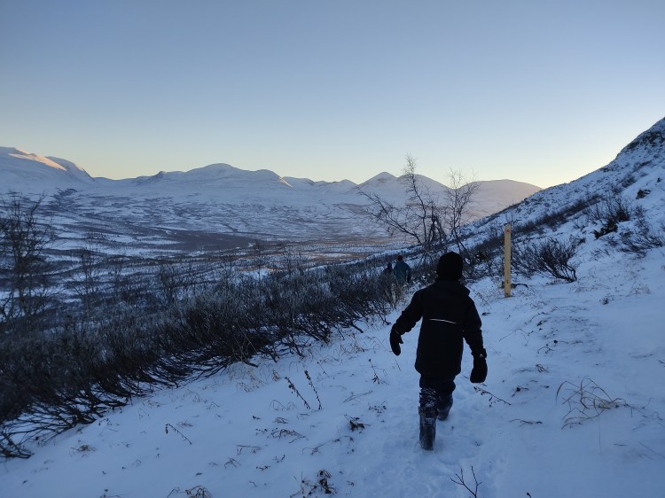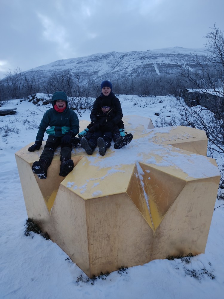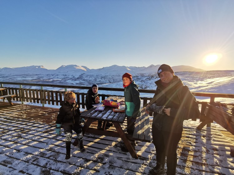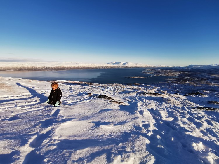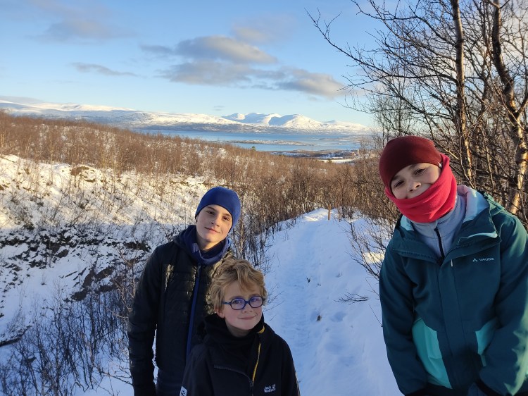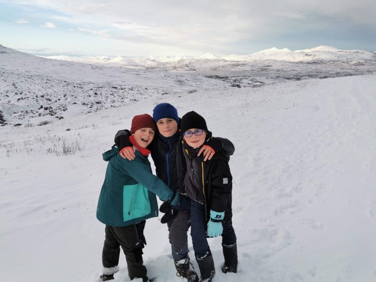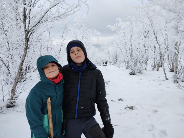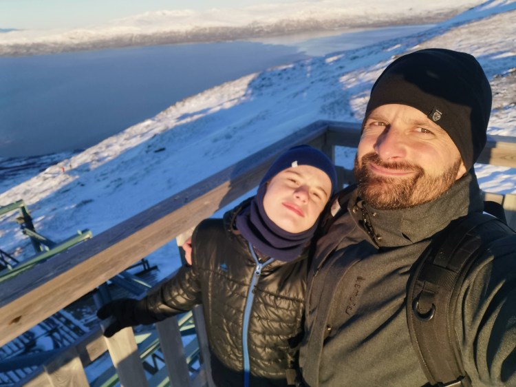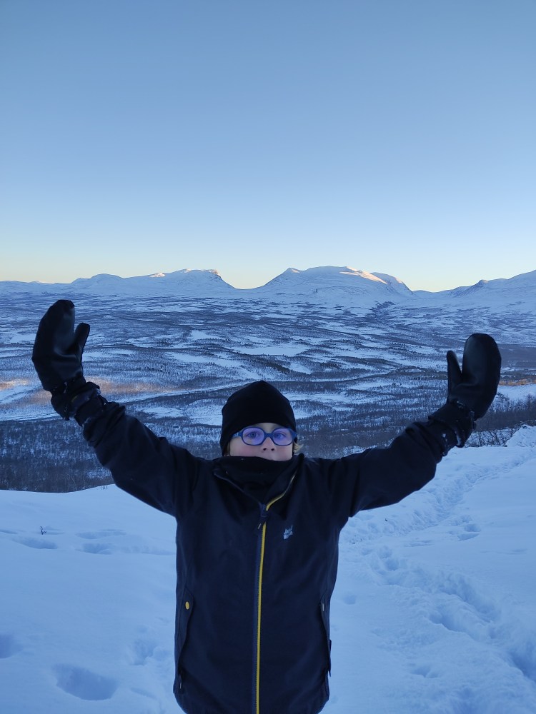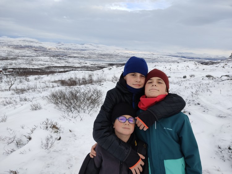 Nous repartons pour une randonnée sur un des sommets du parc, Nuolja, où se trouve la Aurora Sky Station. Il y a normalement un télésiège pour monter mais il ne fonctionne que l’été et à partir du mois de décembre. C’est un endroit magnifique pour observer les aurores boréales. Nous partons pour 9km et 600m de dénivelé. Louis surmonte sa phobie de l’altitude sur les chemins de neige un peu glissant, la carotte à la clé : les 3 garçons dépunis de 15 jours sans écran 🙂 Une fois arrivés à la Aurora Sky Station, nous restons seulement 5 min avec un pique-nique flash éclair. Et oui il fait -15°C là-haut !!!