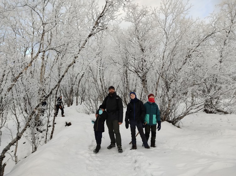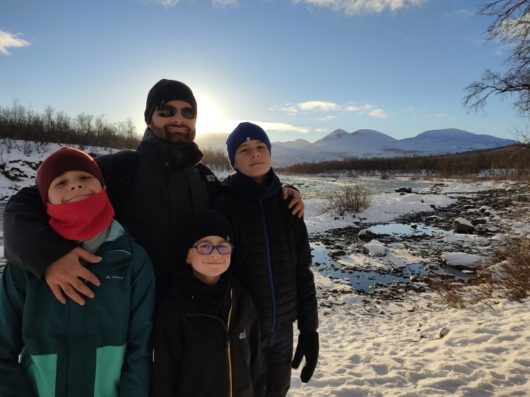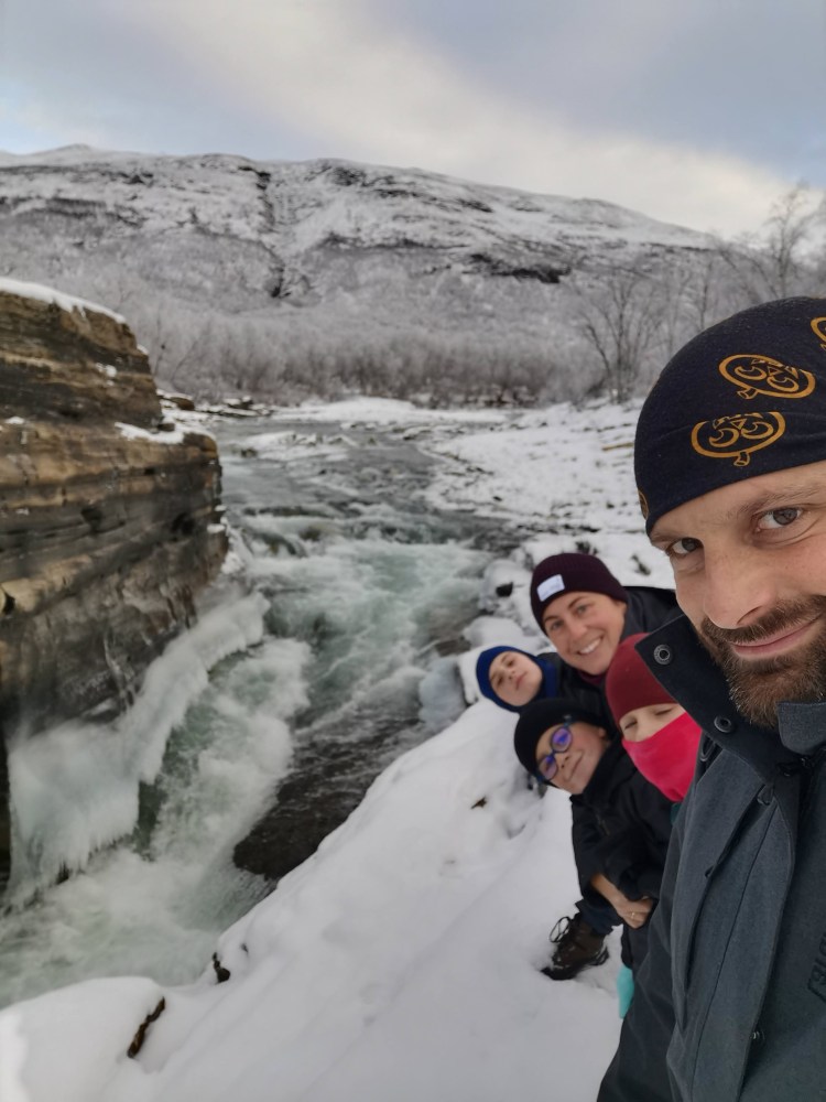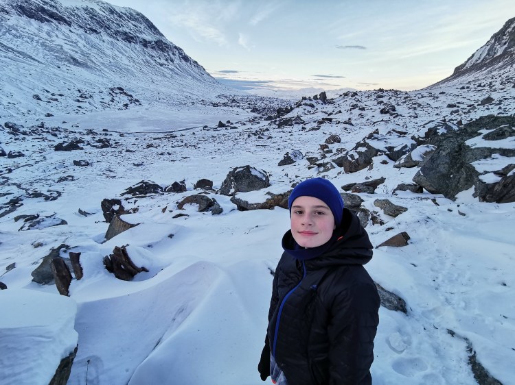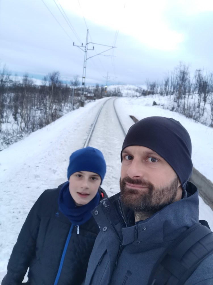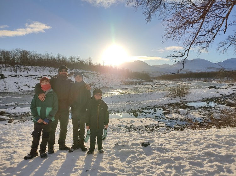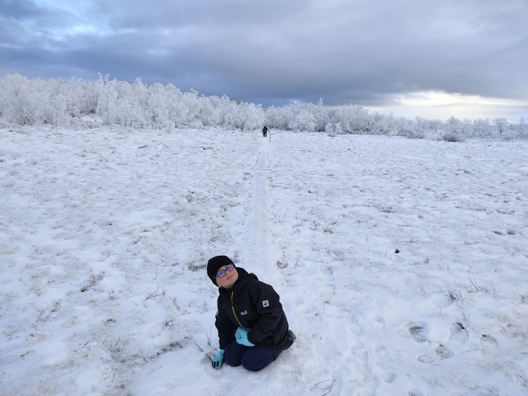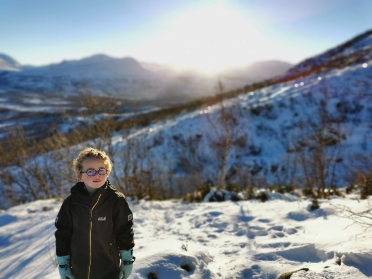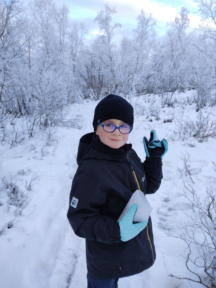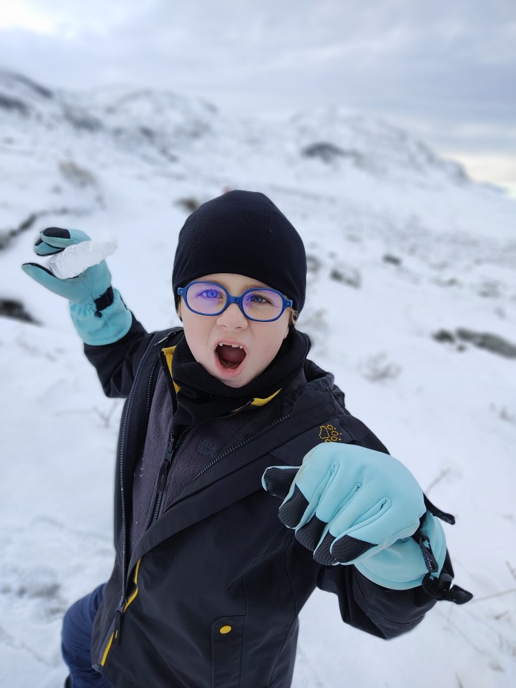 Nous repartons pour une randonnée sur un des sommets du parc, Nuolja, où se trouve la Aurora Sky Station. Il y a normalement un télésiège pour monter mais il ne fonctionne que l’été et à partir du mois de décembre. C’est un endroit magnifique pour observer les aurores boréales. Nous partons pour 9km et 600m de dénivelé. Louis surmonte sa phobie de l’altitude sur les chemins de neige un peu glissant, la carotte à la clé : les 3 garçons dépunis de 15 jours sans écran 🙂 Une fois arrivés à la Aurora Sky Station, nous restons seulement 5 min avec un pique-nique flash éclair. Et oui il fait -15°C là-haut !!!