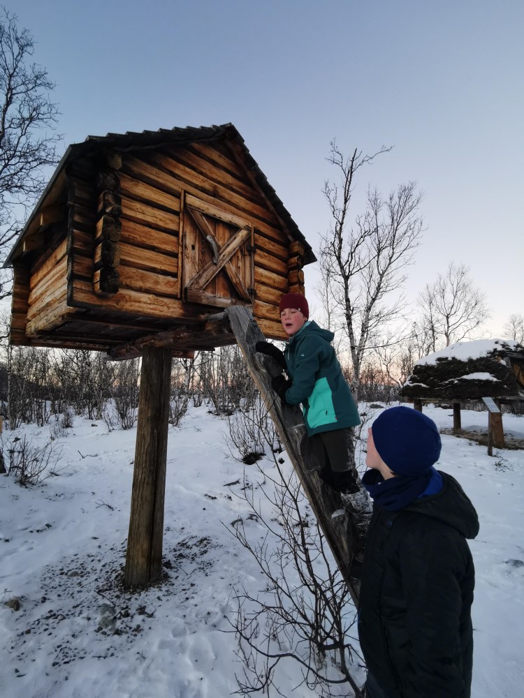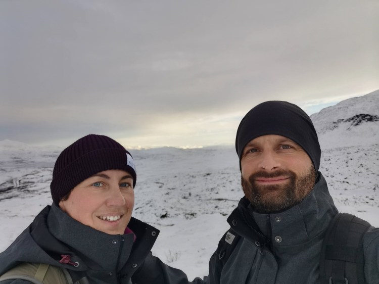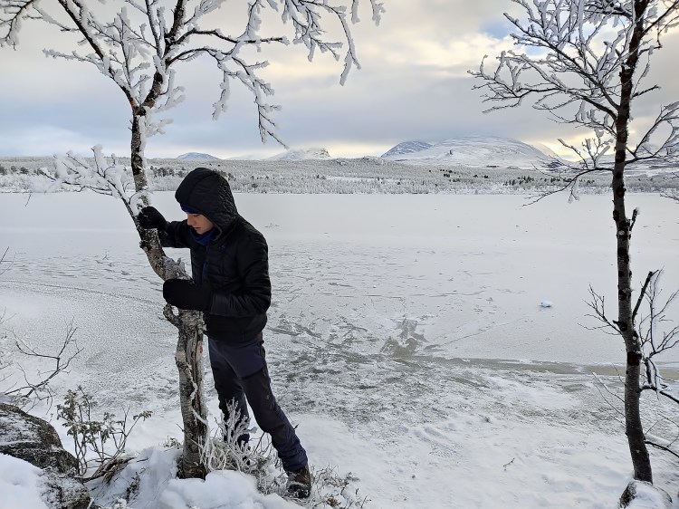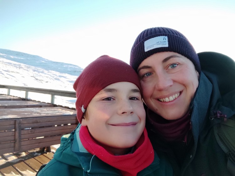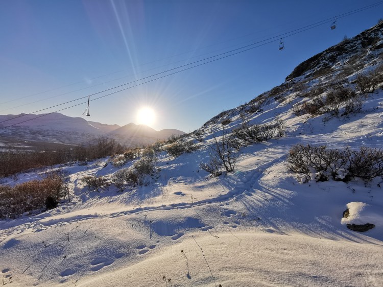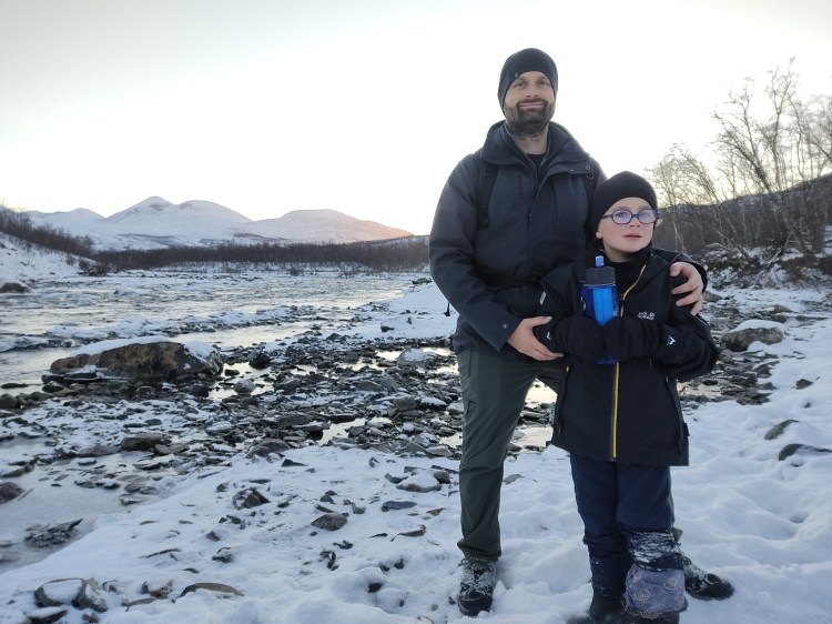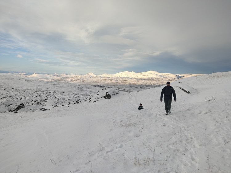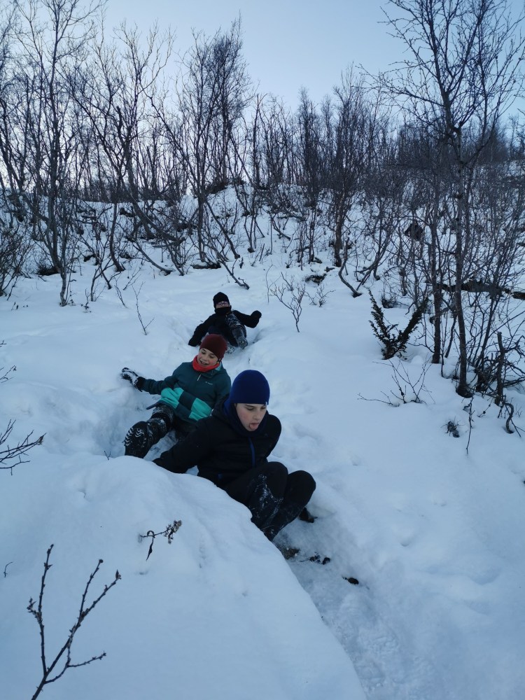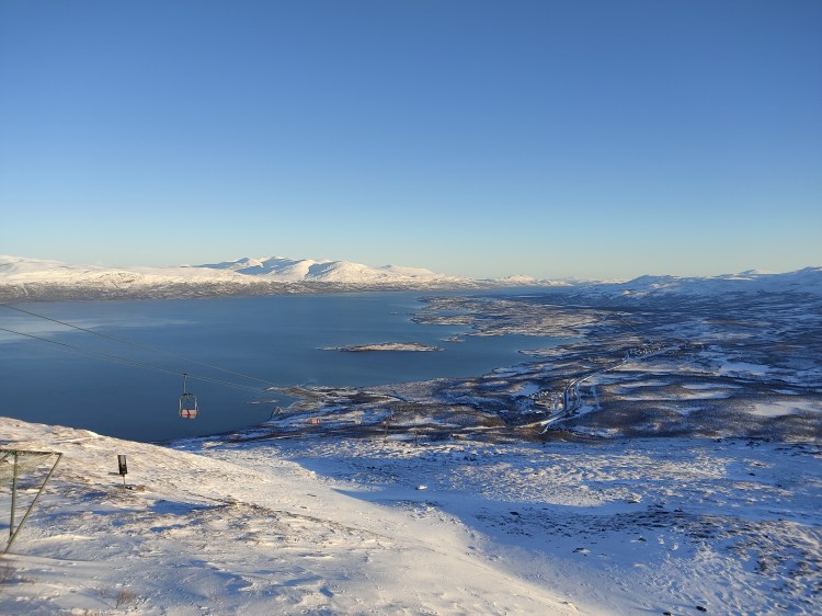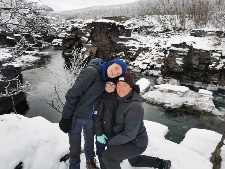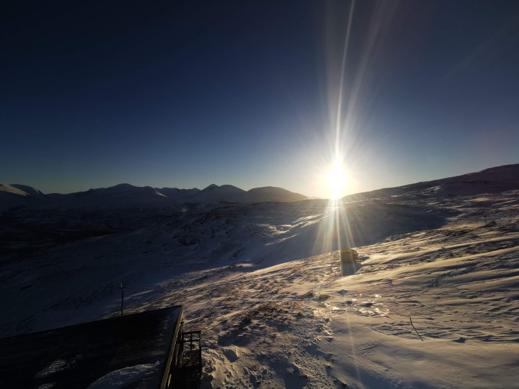Nous repartons pour une randonnée sur un des sommets du parc, Nuolja, où se trouve la Aurora Sky Station. Il y a normalement un télésiège pour monter mais il ne fonctionne que l’été et à partir du mois de décembre. C’est un endroit magnifique pour observer les aurores boréales. Nous partons pour 9km et 600m de dénivelé. Louis surmonte sa phobie de l’altitude sur les chemins de neige un peu glissant, la carotte à la clé : les 3 garçons dépunis de 15 jours sans écran 🙂 Une fois arrivés à la Aurora Sky Station, nous restons seulement 5 min avec un pique-nique flash éclair. Et oui il fait -15°C là-haut !!!