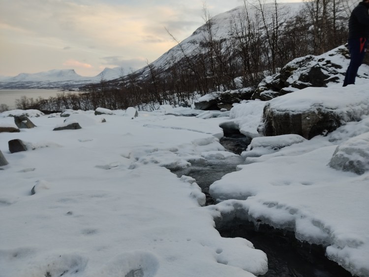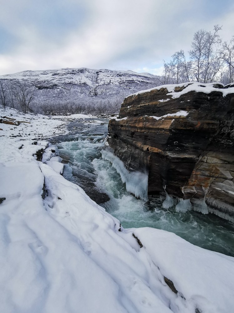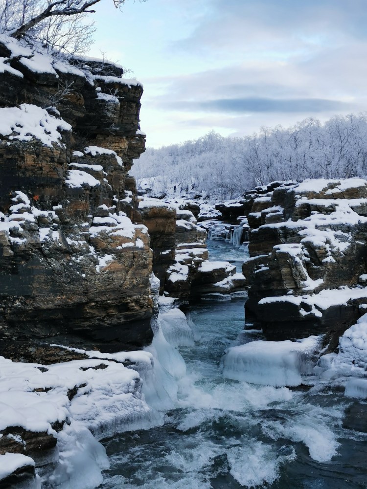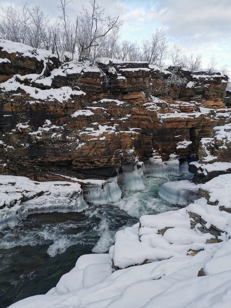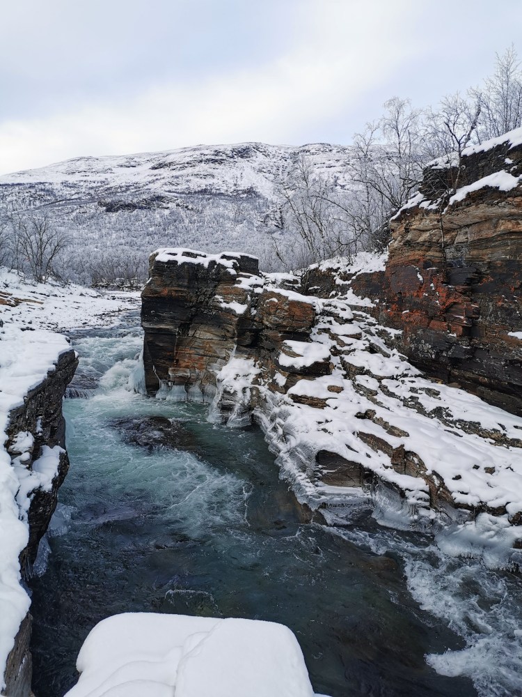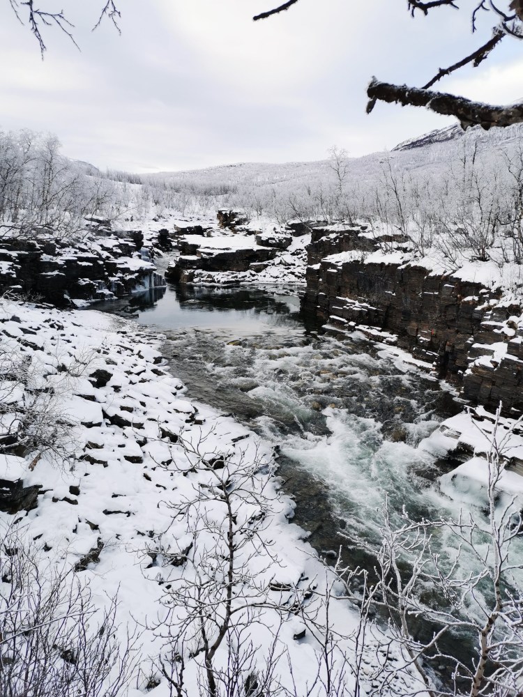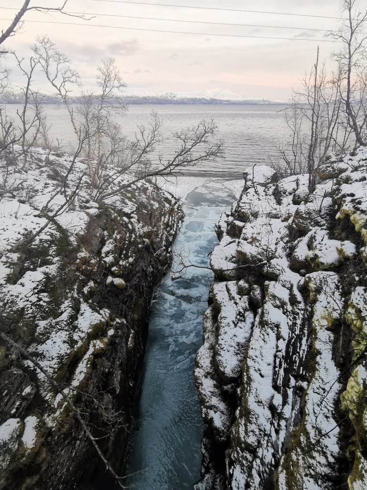 Nous commençons par la randonnée appelée Vuolip Njahkajavri. Nous longeons tout d’abord le canyon, splendide entre l’eau, la neige, la glace et la roche.