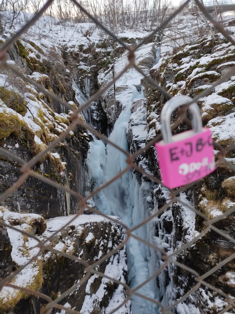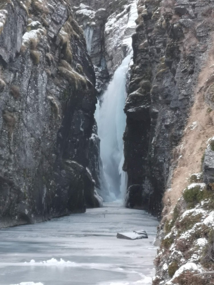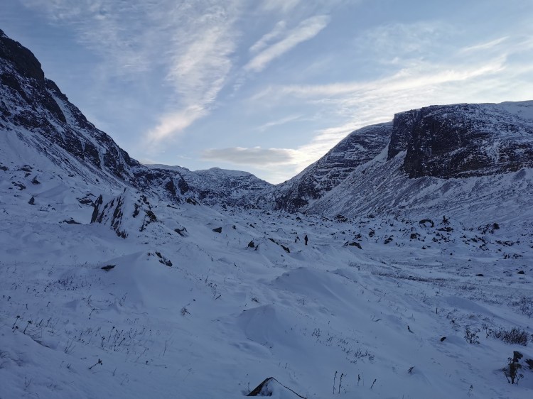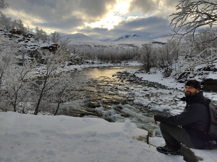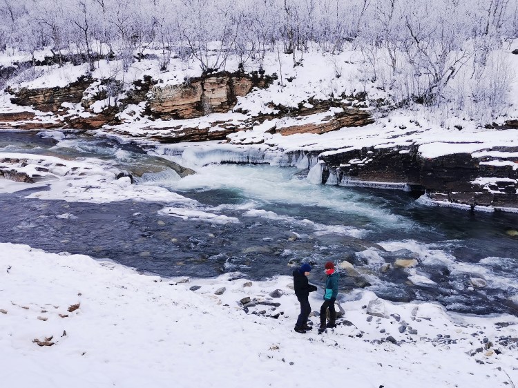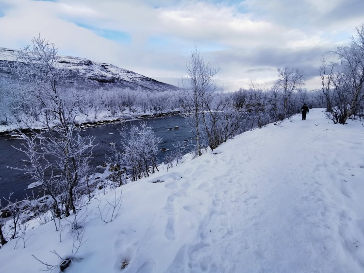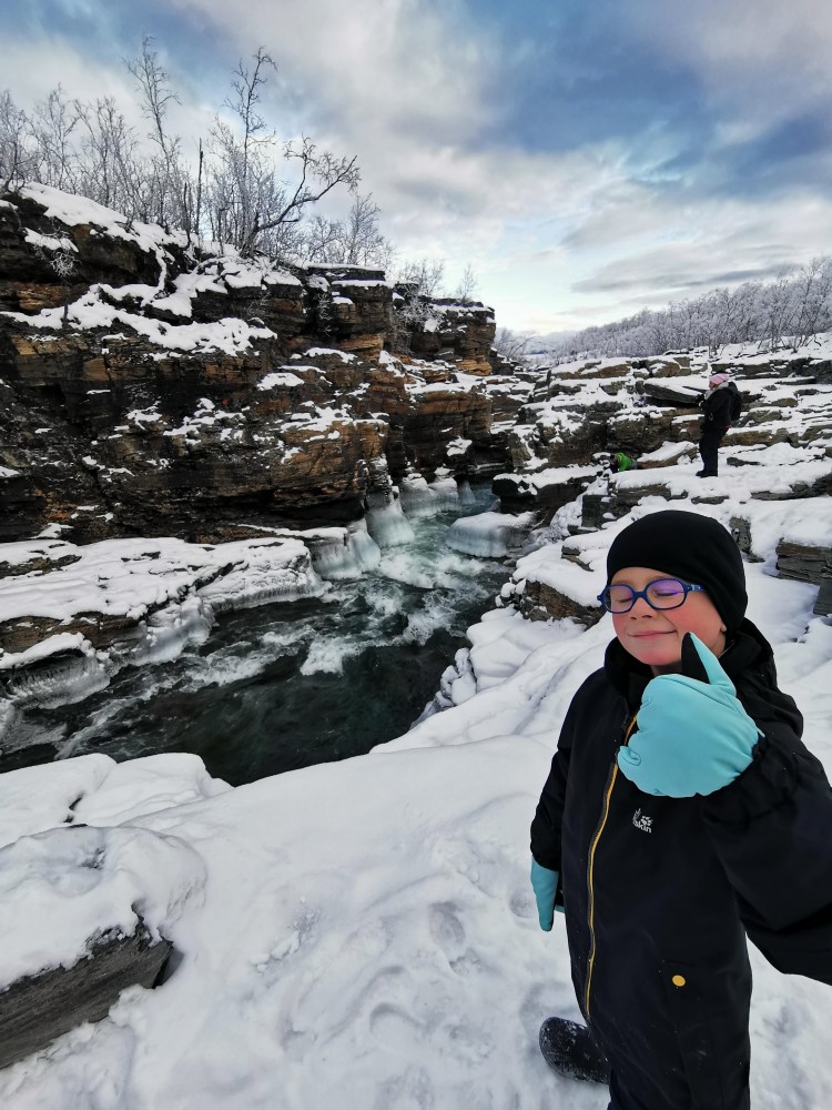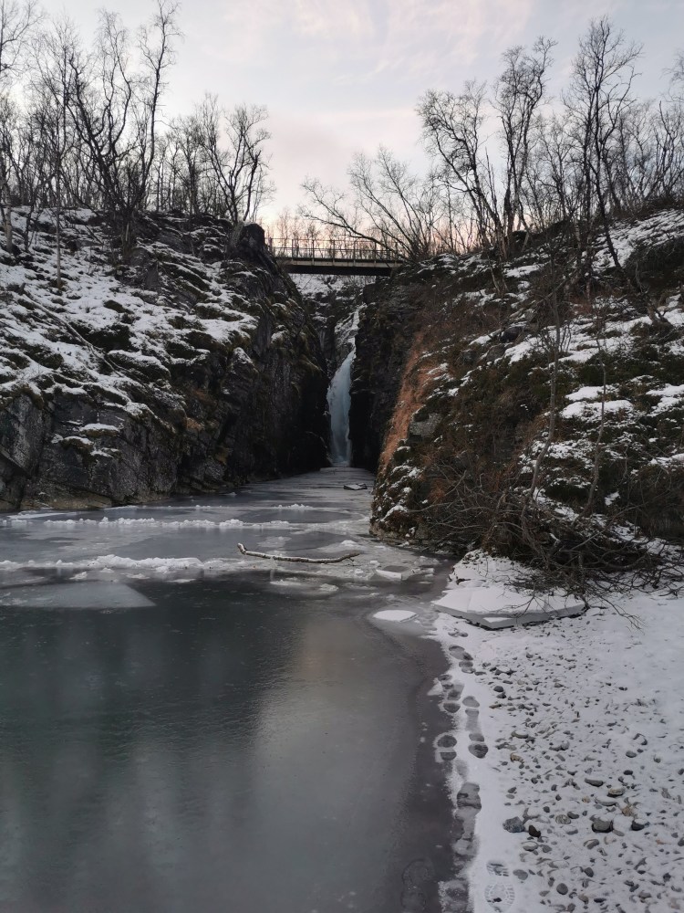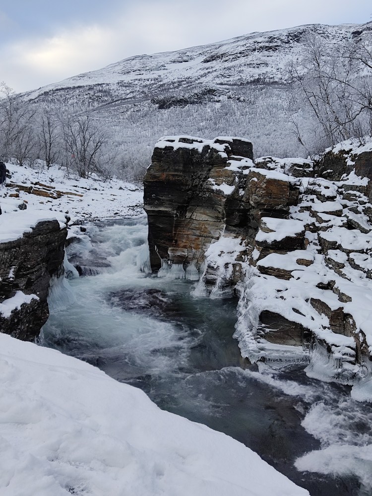 Nous commençons par la randonnée appelée Vuolip Njahkajavri. Nous longeons tout d’abord le canyon, splendide entre l’eau, la neige, la glace et la roche.