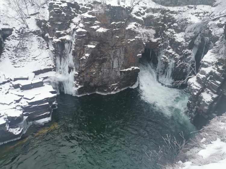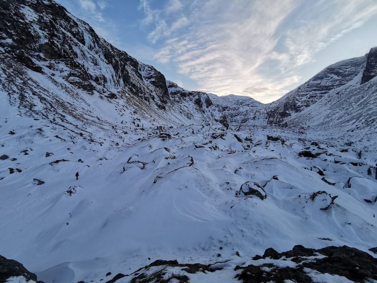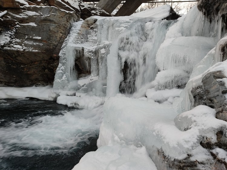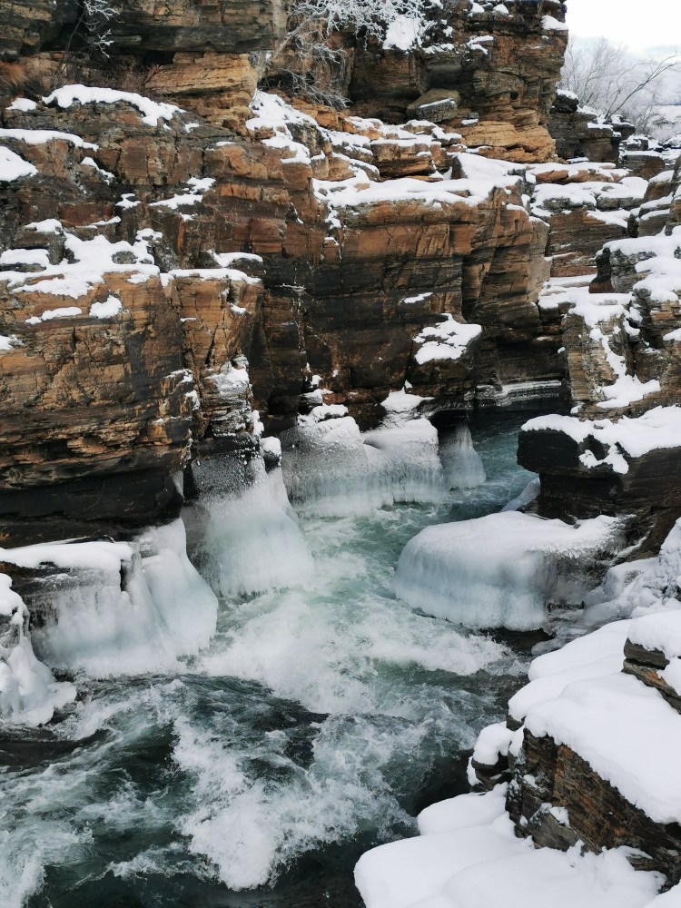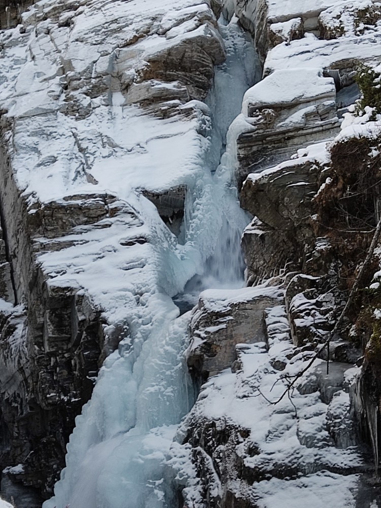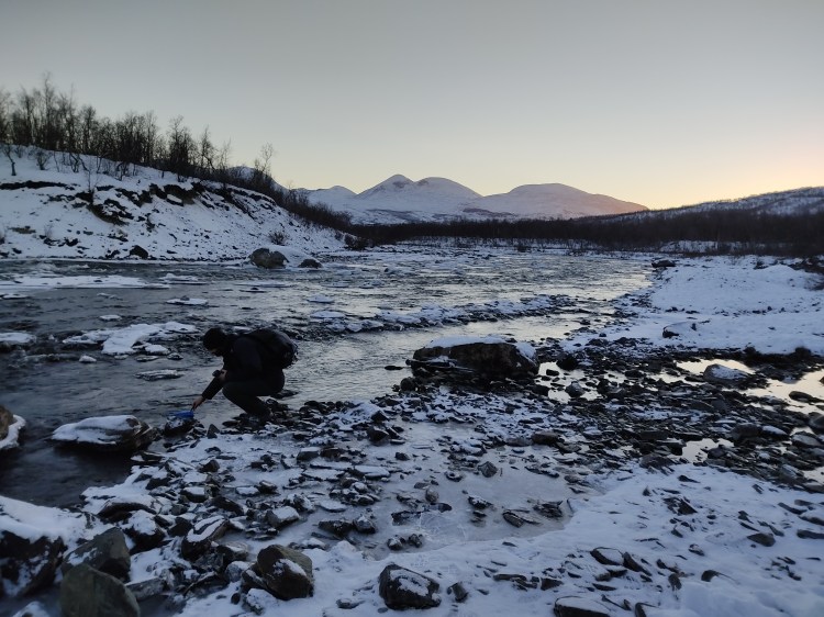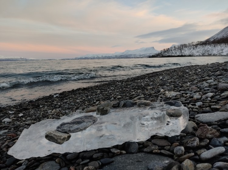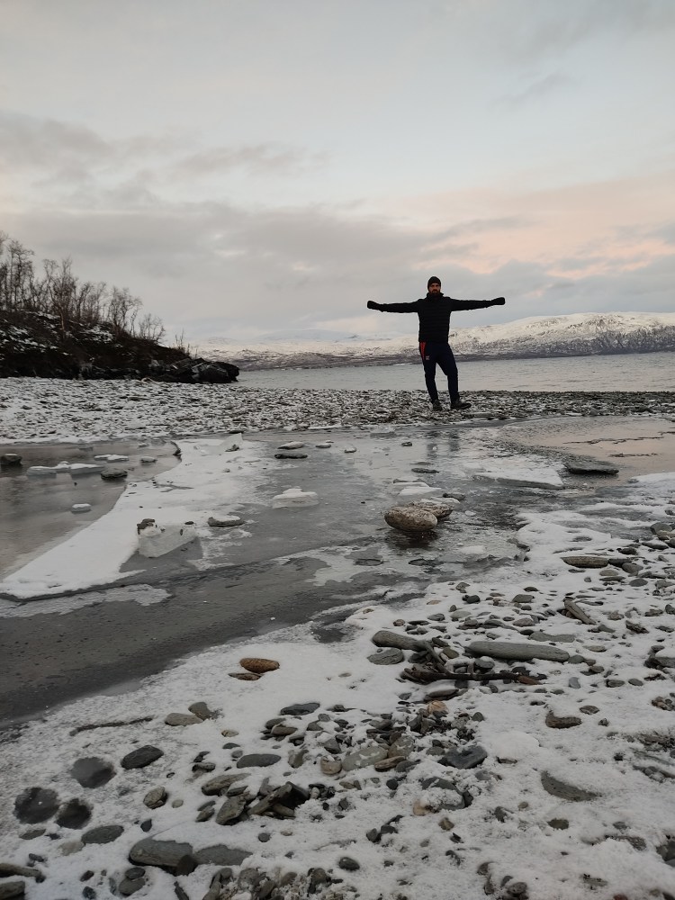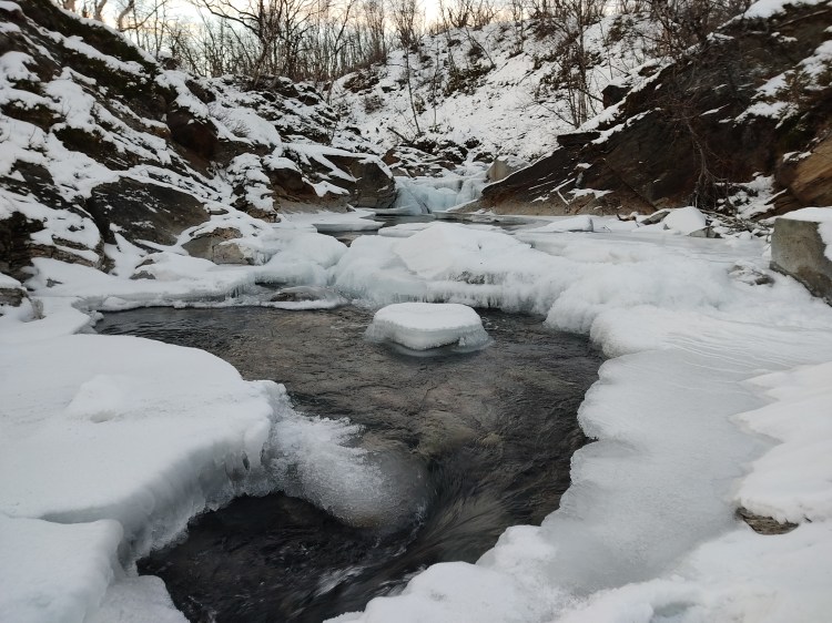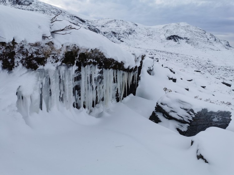 Nous commençons par la randonnée appelée Vuolip Njahkajavri. Nous longeons tout d’abord le canyon, splendide entre l’eau, la neige, la glace et la roche.