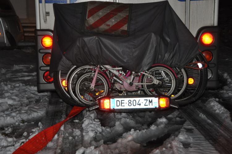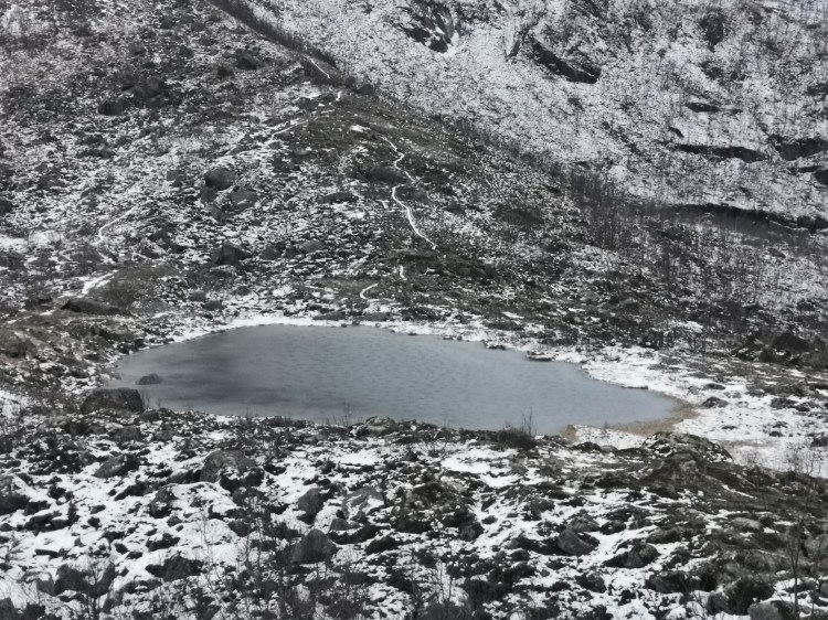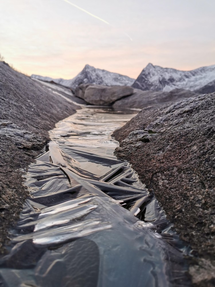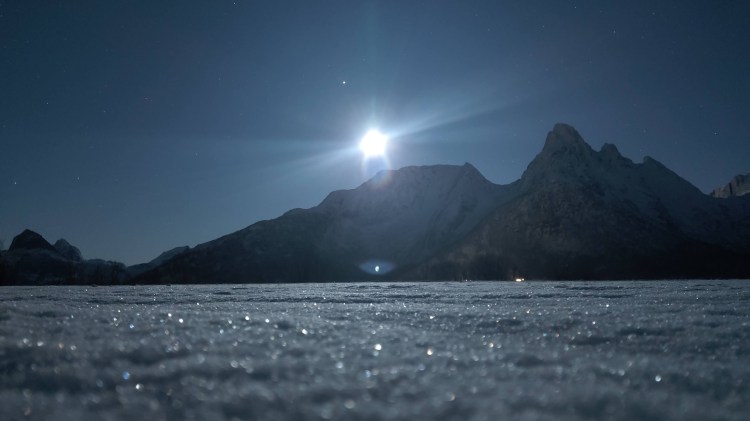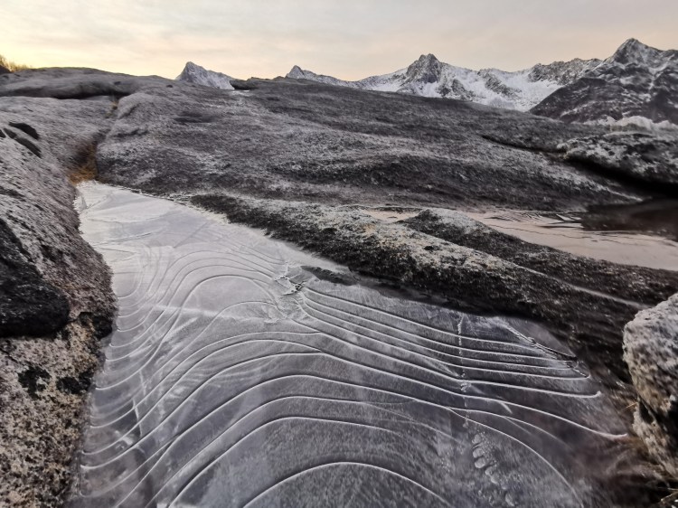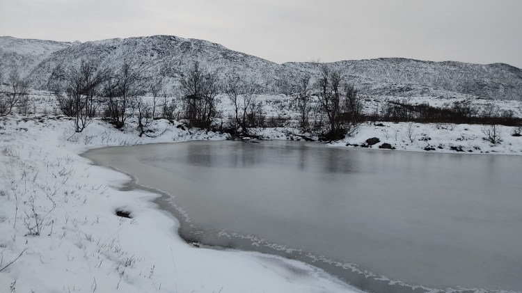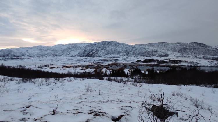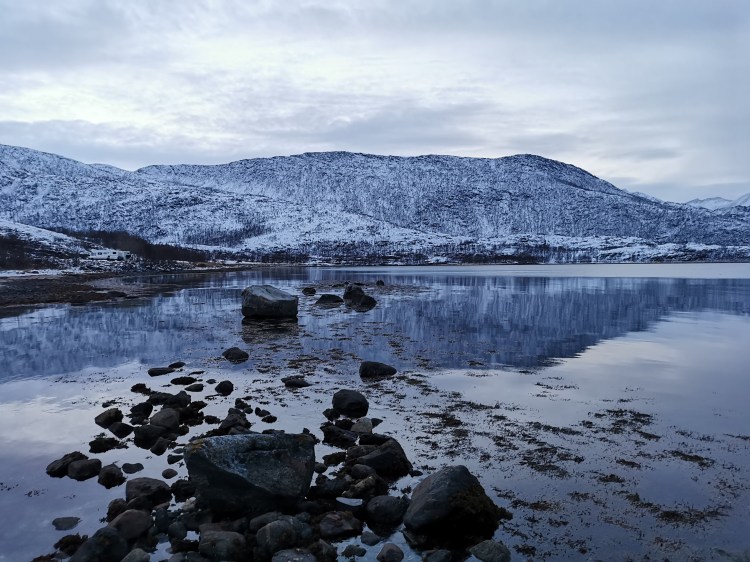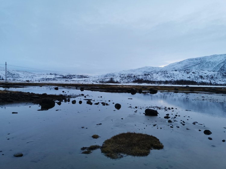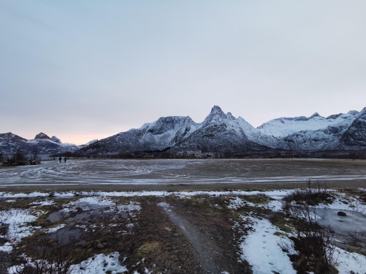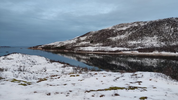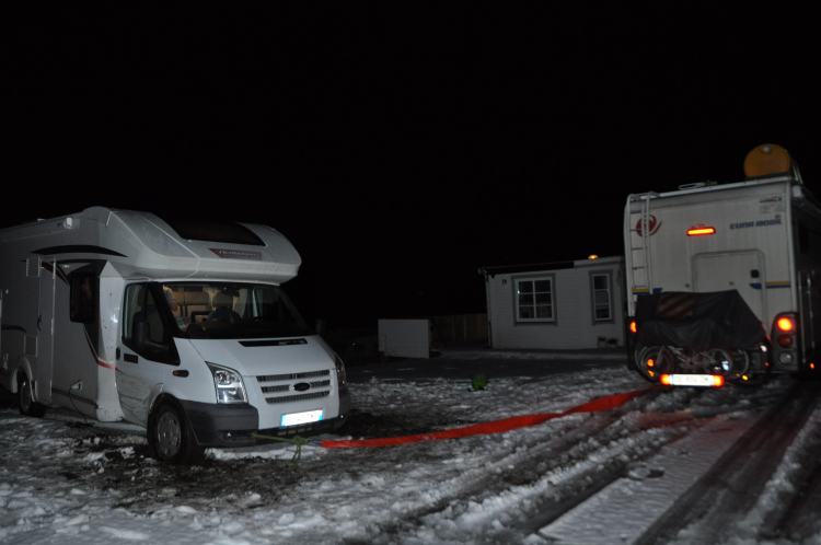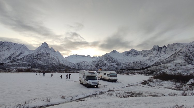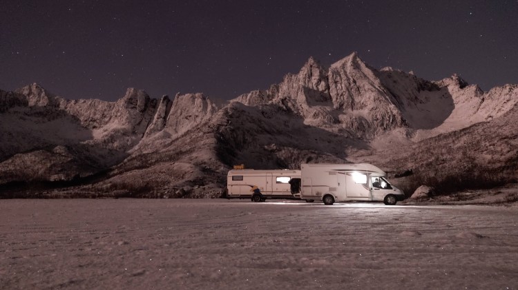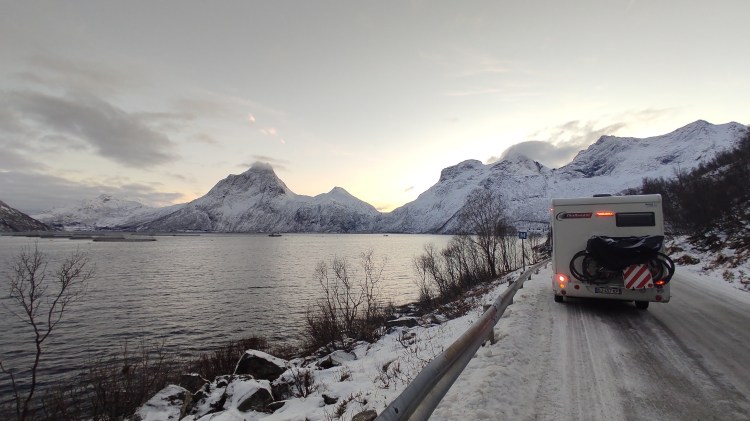 De retour de ballade, nous décidons de quitter le camping avant que la nuit tombe définitivement car nous pressentons que cela va être plutôt compliqué. Il y a en effet une rude montée gelée avant d’arriver à l’entrée du camping qui ressemble à une véritable patinoire. Nos inquiétudes se confirment, même avec de l’élan, notre camping-car ne monte pas jusqu’en haut. On couvre la route de graviers aux endroits les plus glacés mais il nous manque un dernier mètre à passer… Du coup, Ludo décide de chaîner et ouf ! nous voilà sortis de ce bazar !! Nous n’avons plus envie de passer une minute de plus dans ce foutu camping. Nous laissons donc nos amis pour une nuit et quittons l’île de Senja en direction du nord.