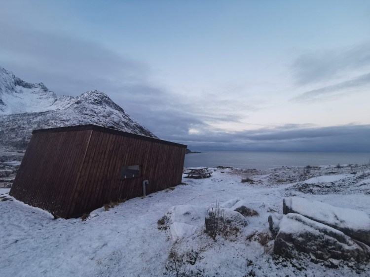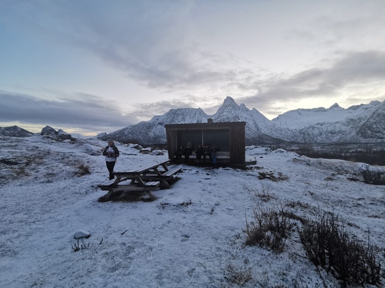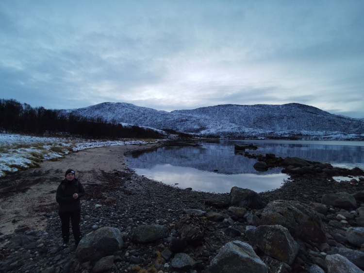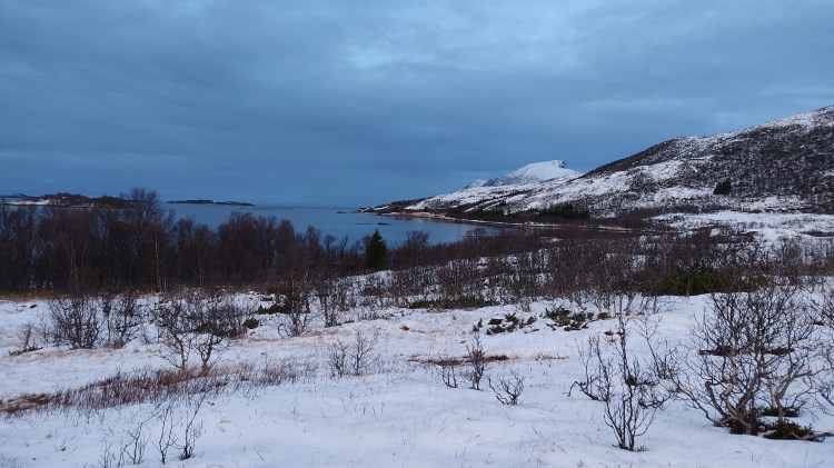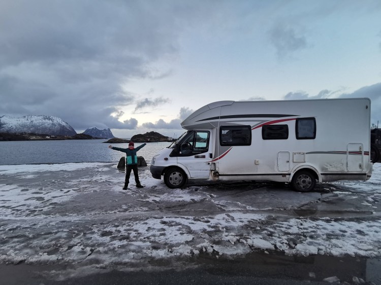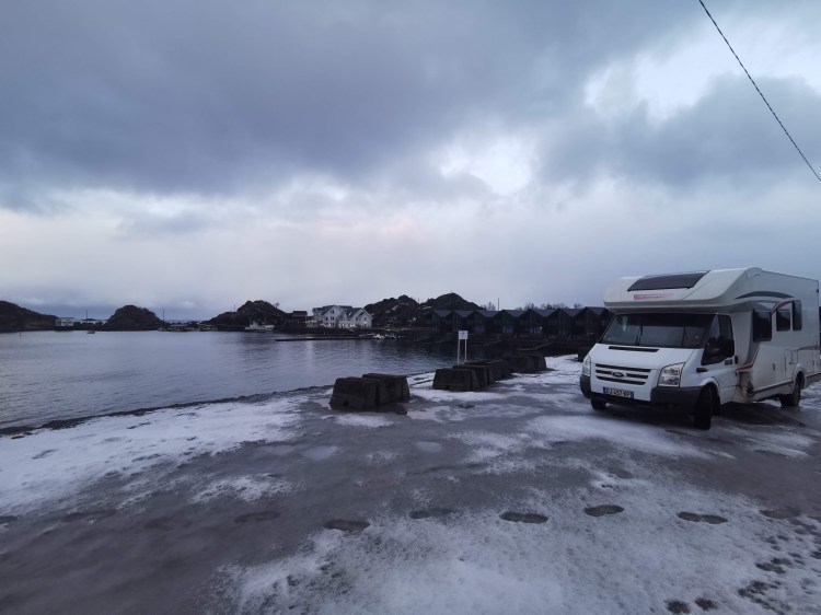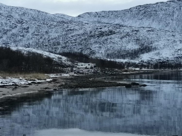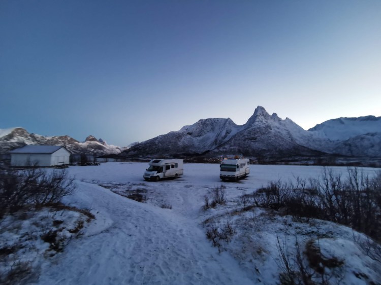 Le lendemain, nous faisons route cette fois vers le sud de l’île pour découvrir le Parc national d’Anderdalen. Nous trouvons un camping près de l’entrée du parc afin de pouvoir partir dès le jour en promenade dans le parc. Je vous rappelle les jours sont très courts maintenant : 3 heures de luminosité… donc il faut être au taquet pour ne perdre aucune minute de luminosité pour visiter. Malheureusement pour nous, ce camping sera une vrai galère. Cela a déjà un peu mal commencé à l’arrivée, tout est fermé et je finis par avoir la gérante au téléphone qui me demande des preuves de notre quarantaine, nos id de passeports… je comprends au final que son mari est malade du COVID et qu’ils sont tous en quarantaine. Après moultes discussions, elle me laisse m’installer dans le camping et me fait confiance (comme tout norvégien qu’il se doit) pour laisser l’argent dans une enveloppe dans la boite aux lettres. Le camping est en étages, pas simple avec cette neige et cette glace qu’on peut trouver sur les chemins. On va pour s’installer le plus droit possible dans la neige. Mais sous la neige, il y avait de la … boue !!! en clair on s’est embourbé de 10cm ! Heureusement les petits pois arrivent 1h plus tard et Jérôme avait eu la bonne idée d’acheté une sangle au cas où il aurait eu besoin de se faire treuiller. Bon finalement c’est nous qu’il tire de cette galère !! Leur billy a chauffé !!