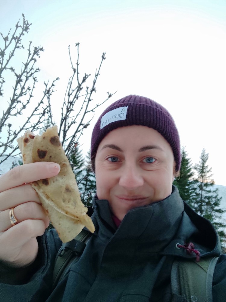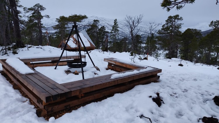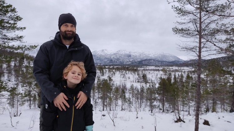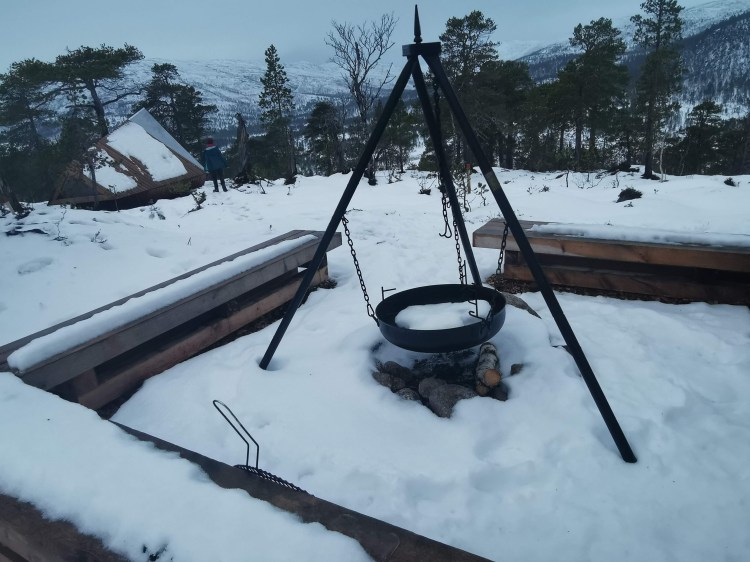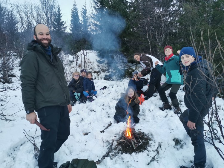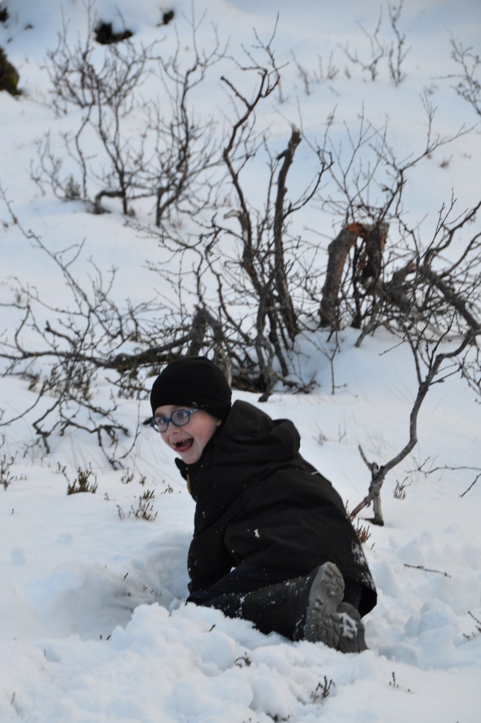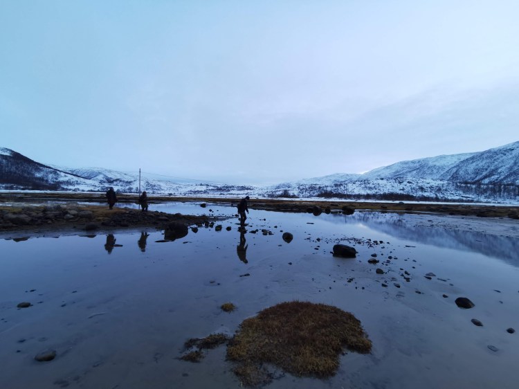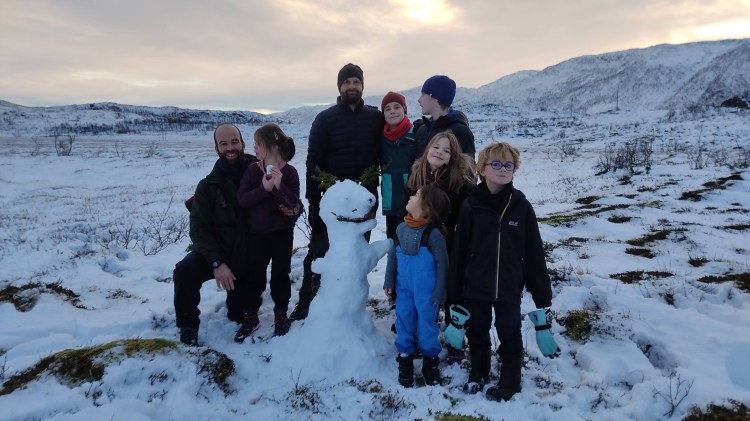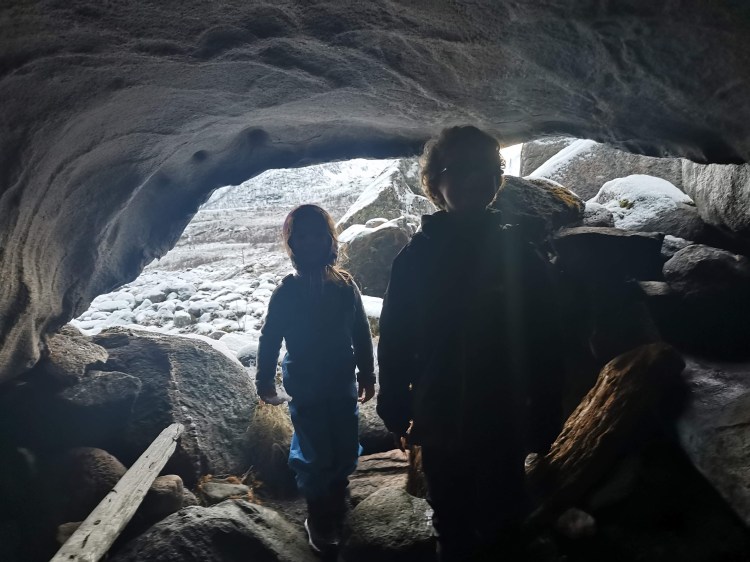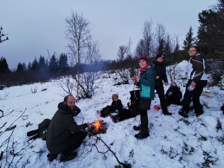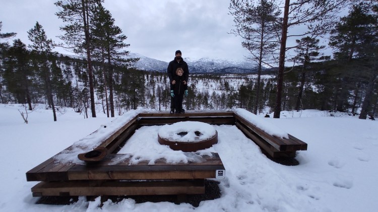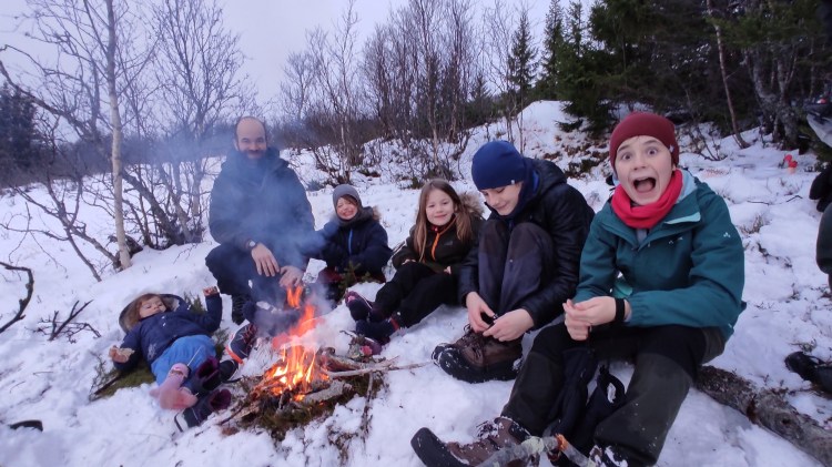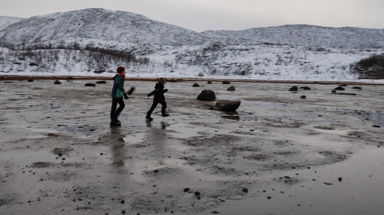 Le lendemain nous partons pour une ballade près du musée du troll. Le coin est plein de tourbières. Entre la neige et les tourbières cachés, les enfants finissent vite par avoir les pieds trempés. Nous n’aurons du coup pas le courage d’aller jusqu’à un parc à saumons que nous avions vu de l’autre côté de la rive. Jérôme qui adore le feu (encore plus traqué que Ludo sur le sujet et c’est pas peu dire !) nous en fait un et nous improvise des fajitas sandwichs cuites au feu de bois : un régal ! Nous faisons chemin retour après cette pause déjeuner et profitons de la marée basse pour couper à travers l’étendue de sable vaseuse.
