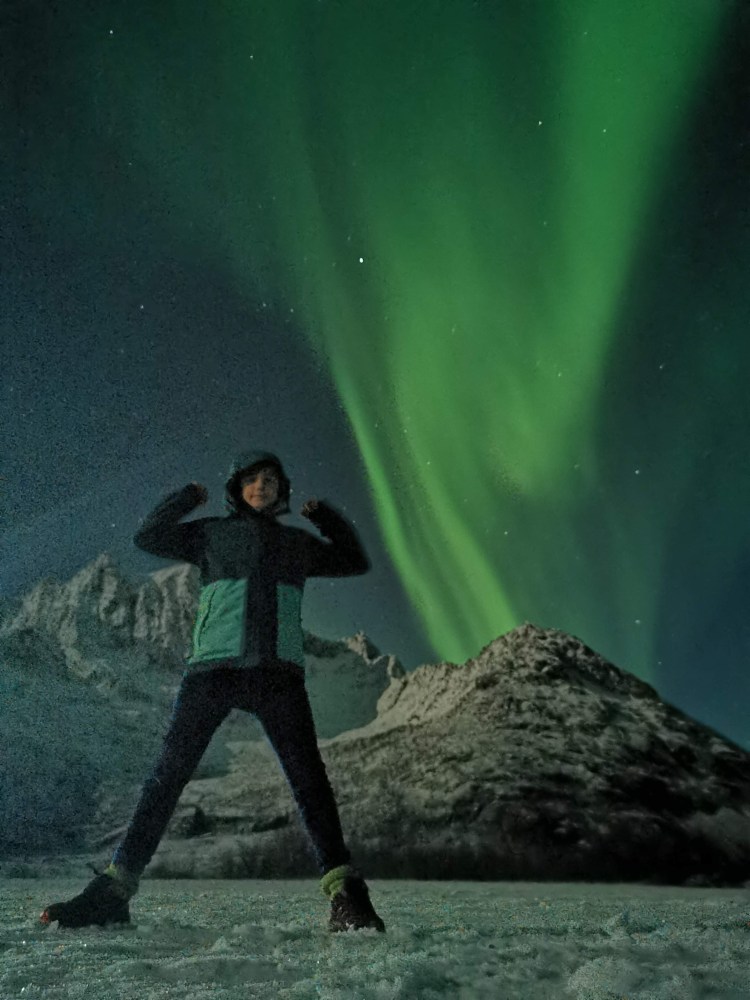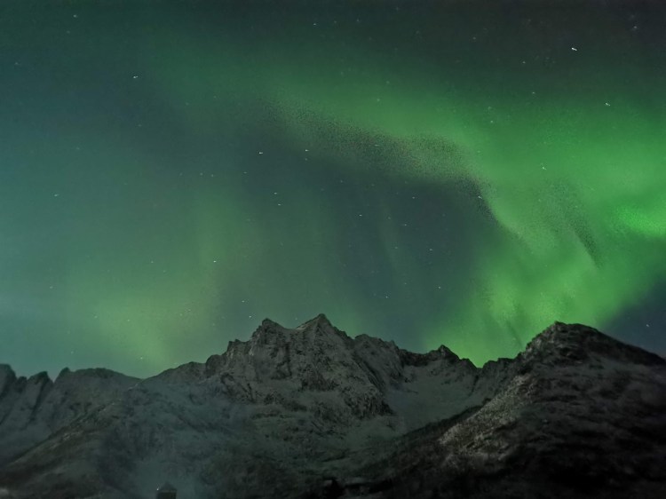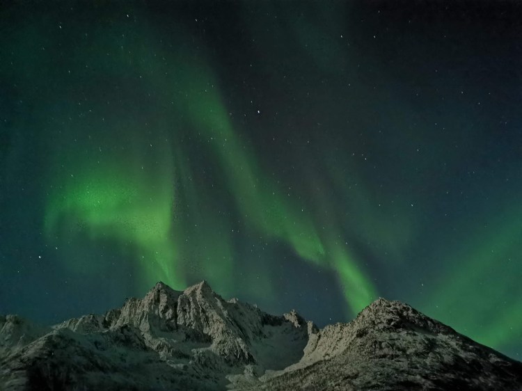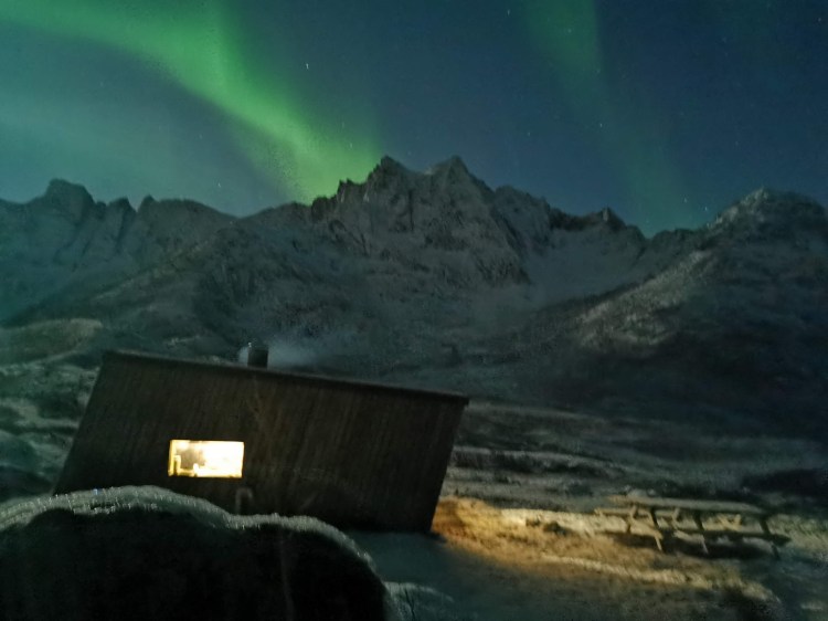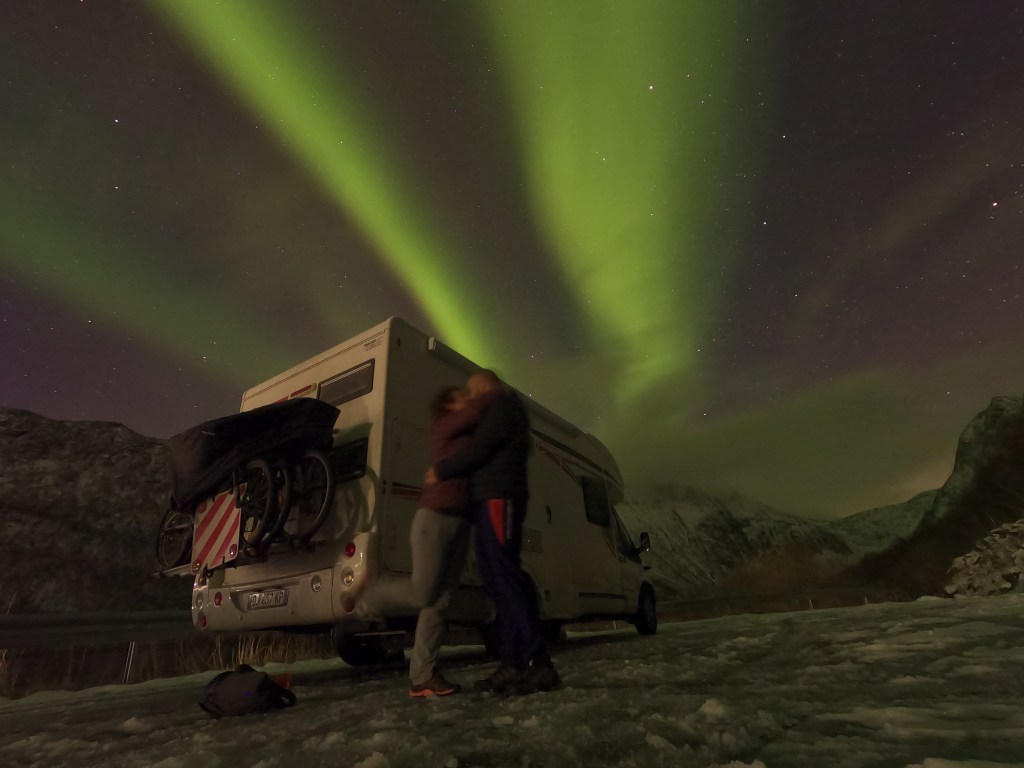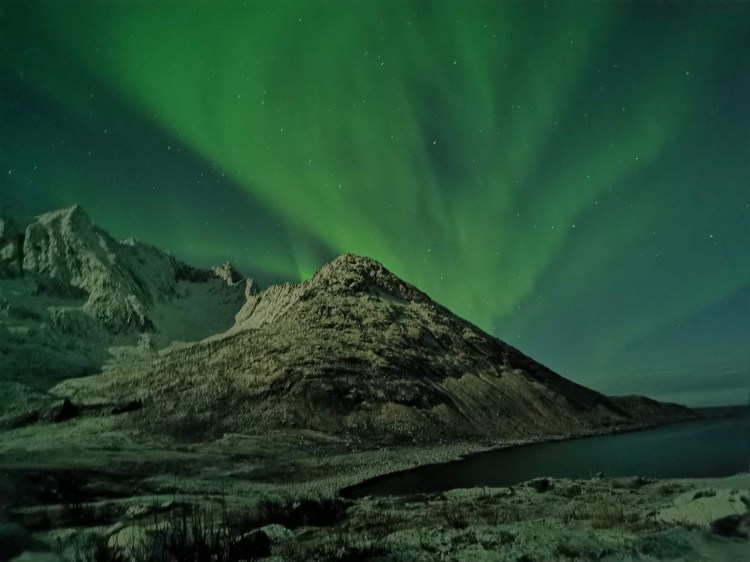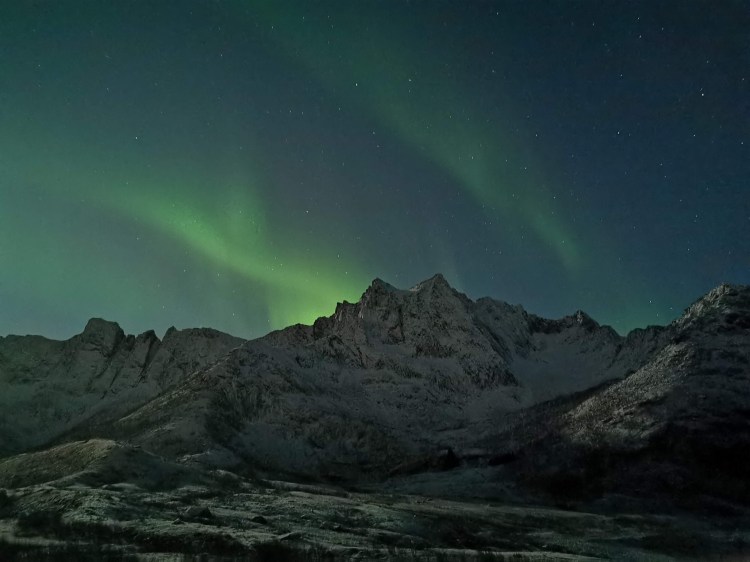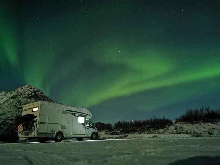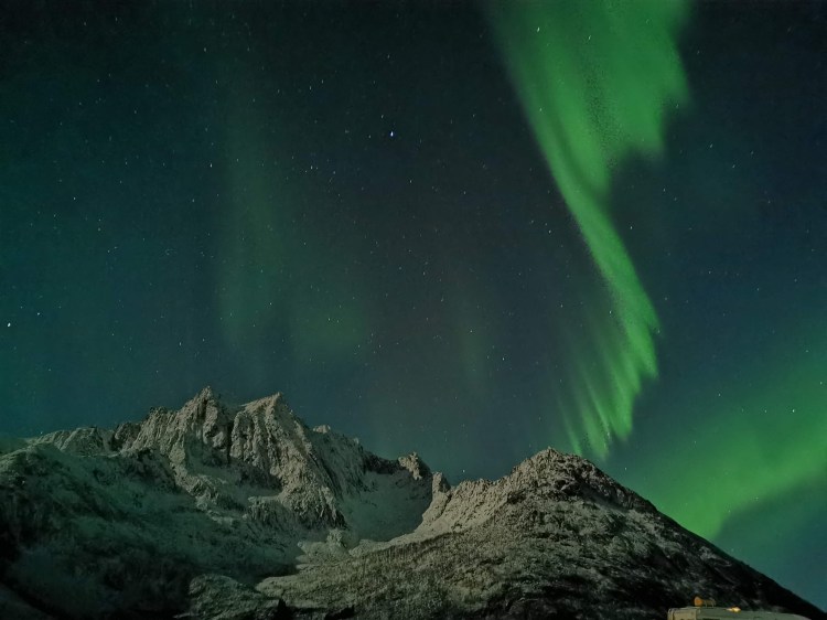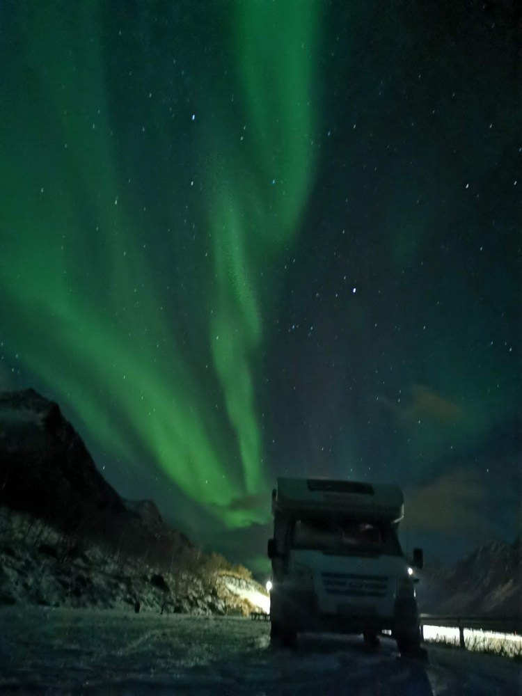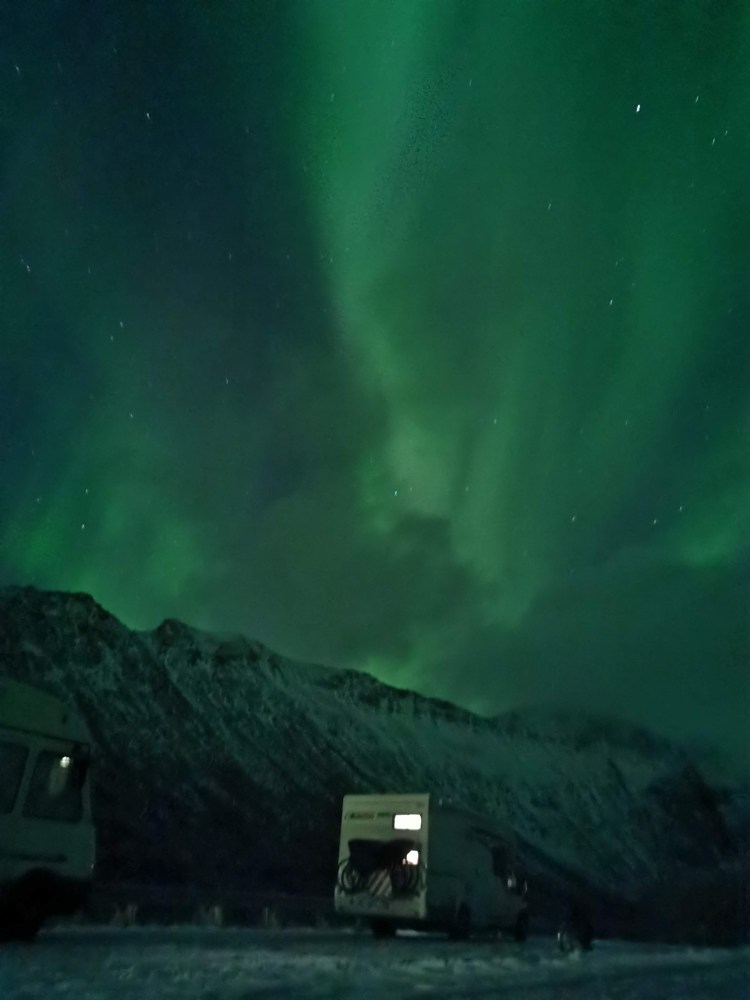 Nous trouvons un endroit magnifique pour passer la nuit dans le fjord de Gryllefjord. Les aurores sont annoncées avec un KP fort (indice d’intensité de l’aurore) et une forte probabilité d’en voir. Et c’est sans compter sur le ciel qui décide de se dégager juste le temps des aurores… on en prend pleins les yeux !!!