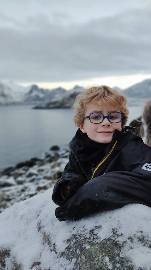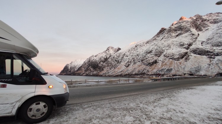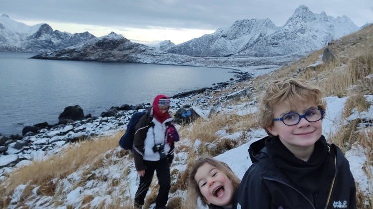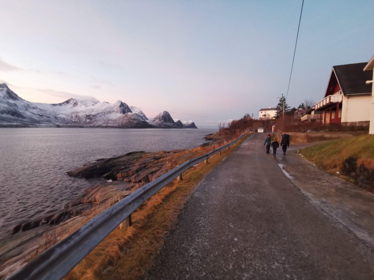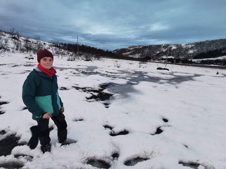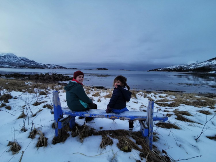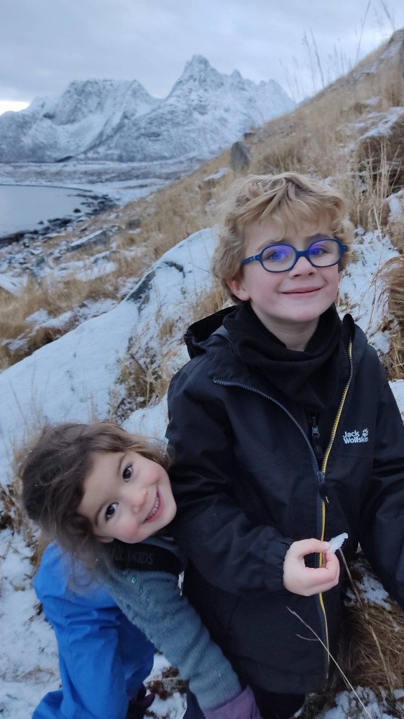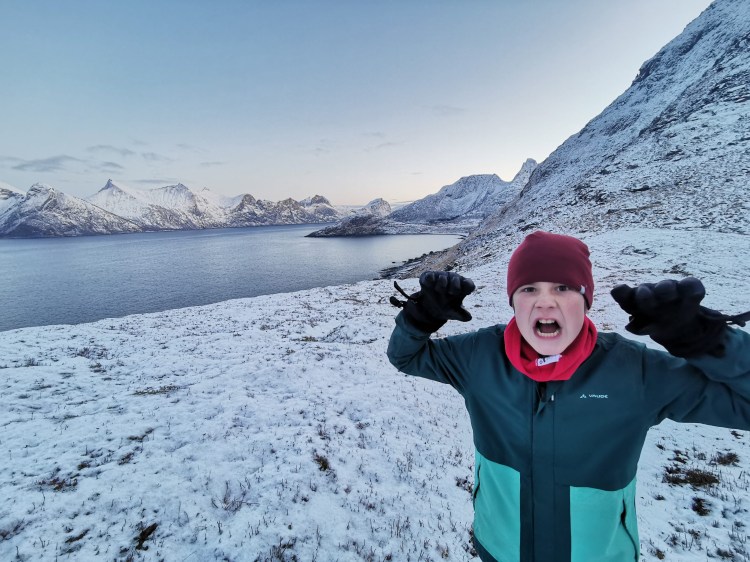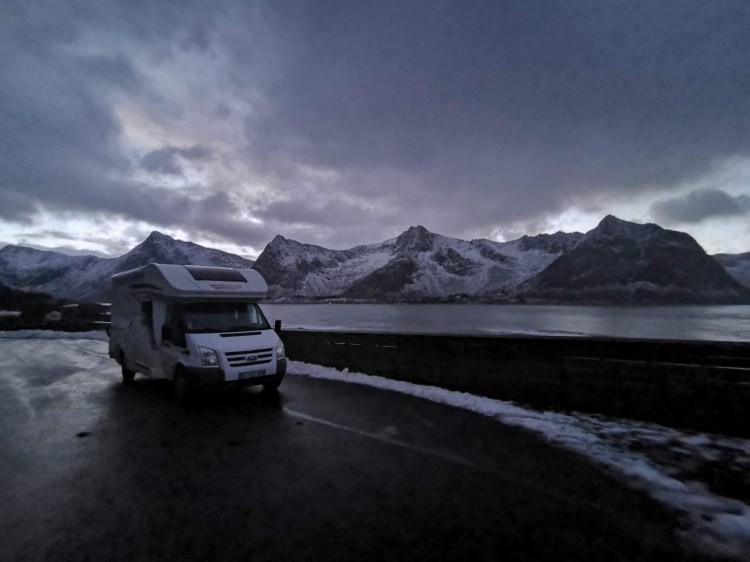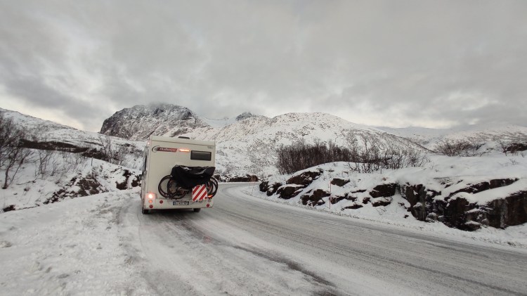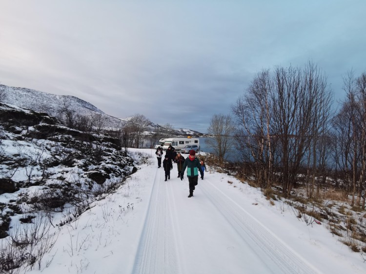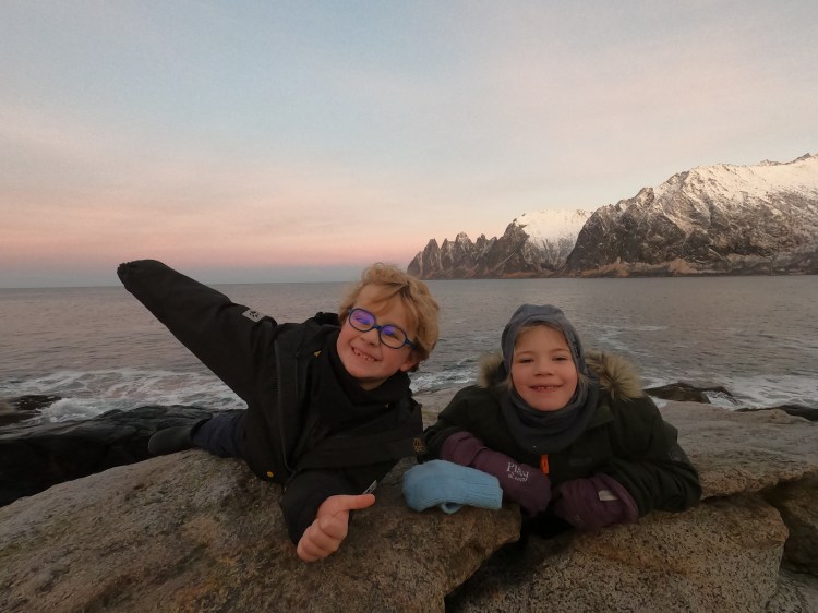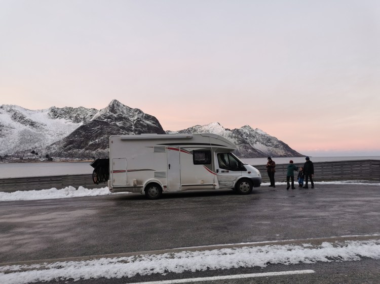 Nous avons un long chemin jusqu’à Senja. Nous passons par de petites routes tortueuses à flan de montagne et au bord des fjords. Les routes sont enneigées et même souvent verglacées. Dès que nous commençons à monter, nous espérons ne croiser personne pour ne pas perdre notre élan… Jusqu’à mi-chemin tout se passe bien. Puis nous nous trouvons sur une route toute blanche qui monte bien (blanche de neige ?? enfin c’est ce qu’on croyait mais la neige cache souvent la glace) et là c’est le drame… le camping-car monte, monte, ralentit et commence à glisser… jusqu’à ne plus arriver à monter ! et ça malgré les pneus cloutés… Il faut dire que notre véhicule à traction a du mal avec tout notre poids à l’arrière. Nous ne pensons pas sur le coup à mettre les chaines. Au final, nous entamons une longue redescente en marche arrière. On n’emmène pas large et Hugo est le seul à s’en rendre compte. Les 2 petits restent plonger dans leur activité « écran ». Et oui des fois, les écrans ça sauve quand la route est longue et/ou compliquée. Une fois revenus sur le plat, nous pouvons repartir en faisant un détour par une autre route plus sûre… Nous alertons d’ailleurs nos amis avec leur gros Billy pour qu’ils prennent tout de suite une autre route pour Senja afin de ne pas connaître les mêmes difficultés que nous.
