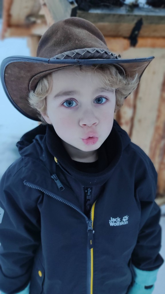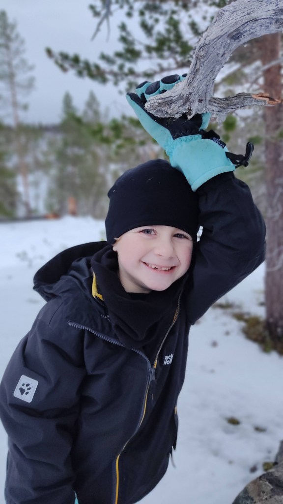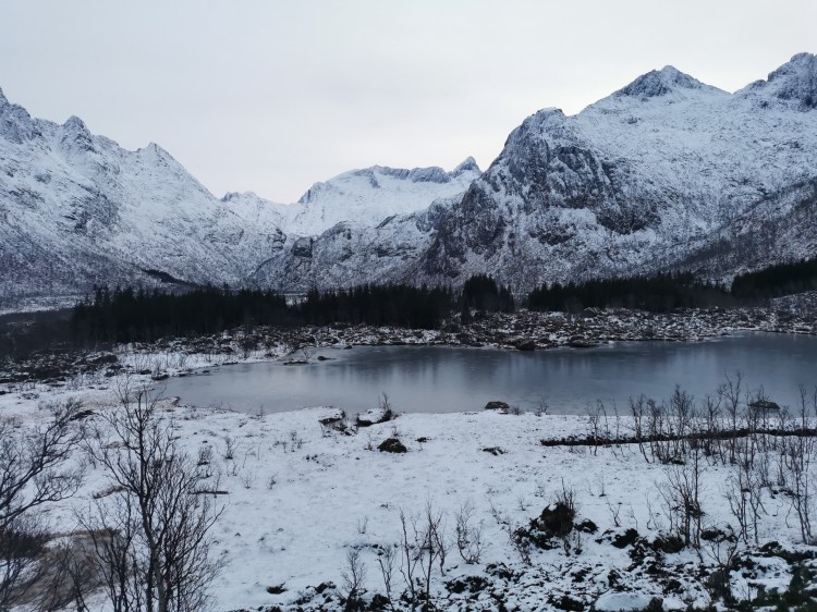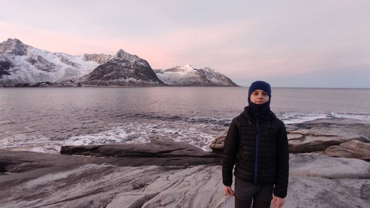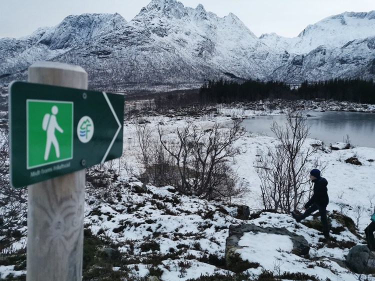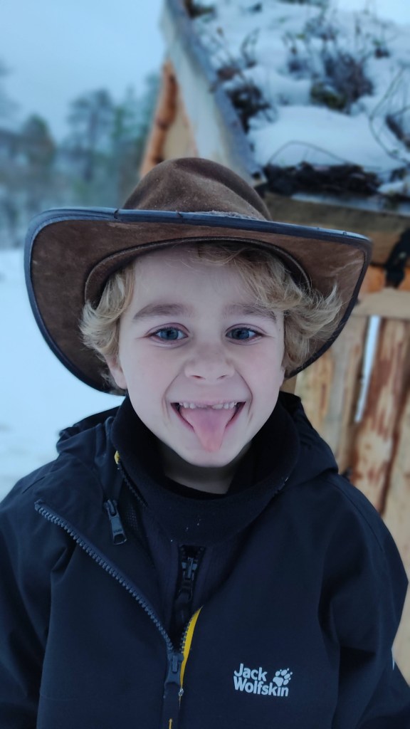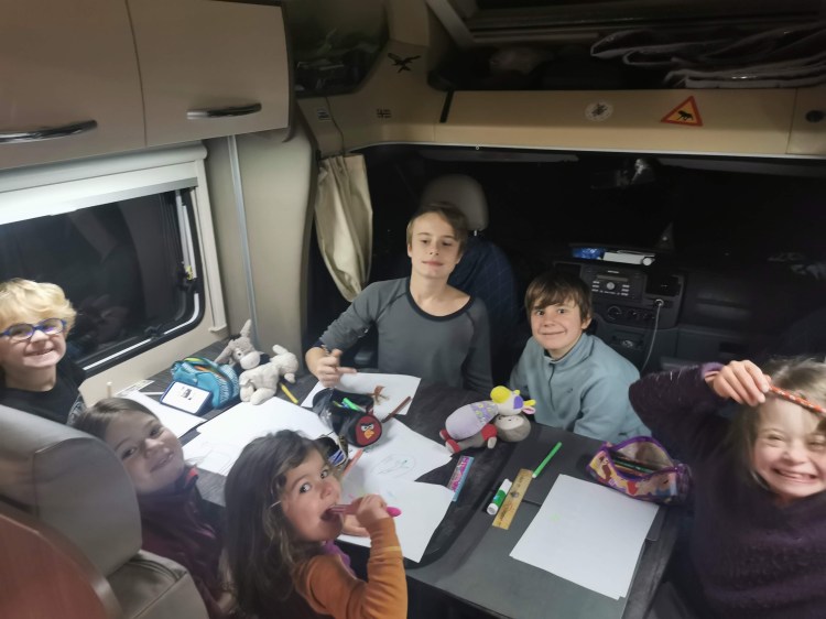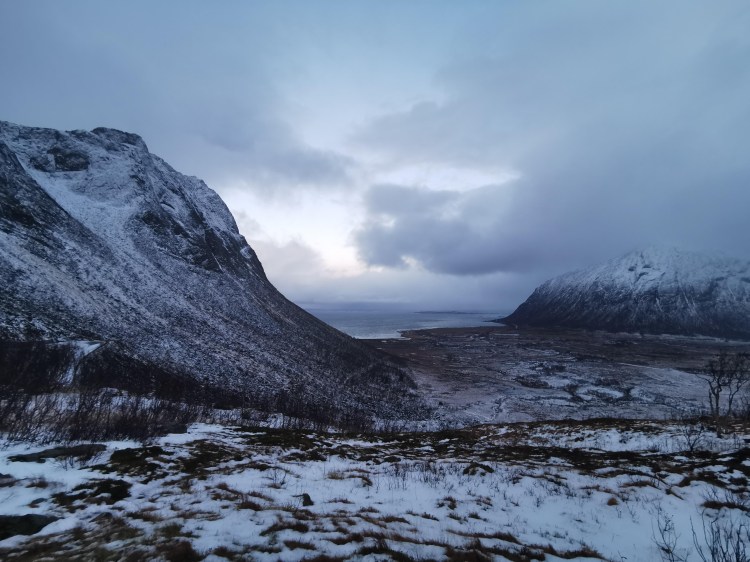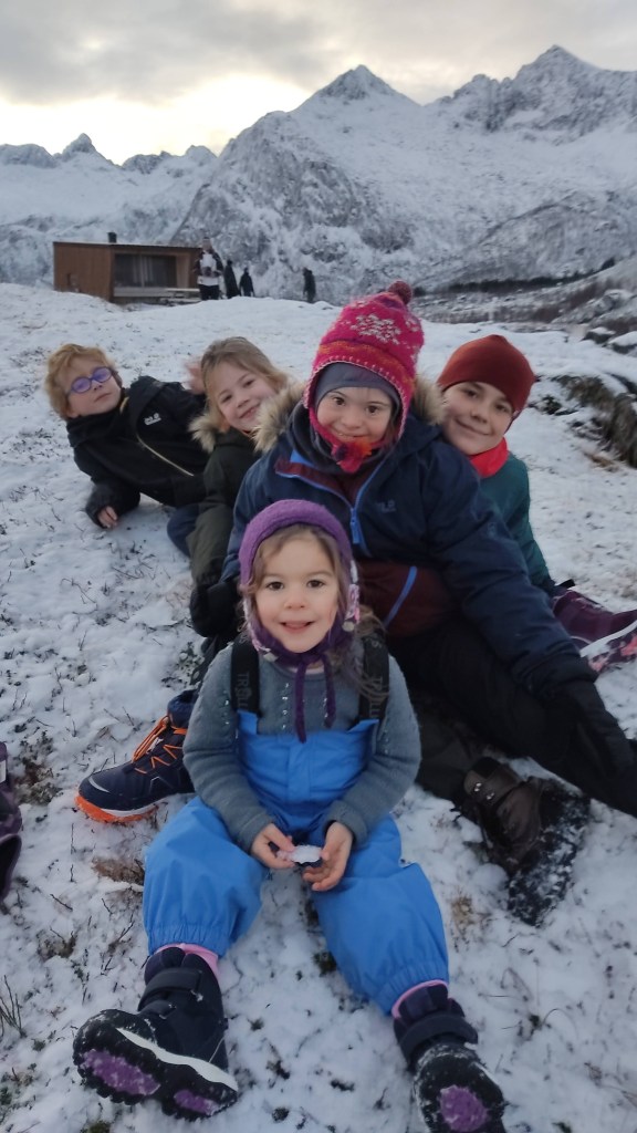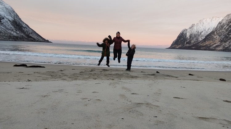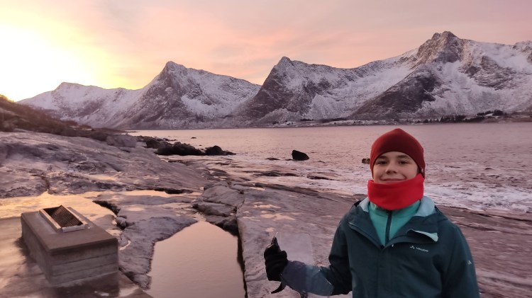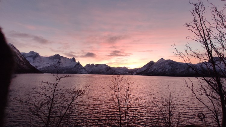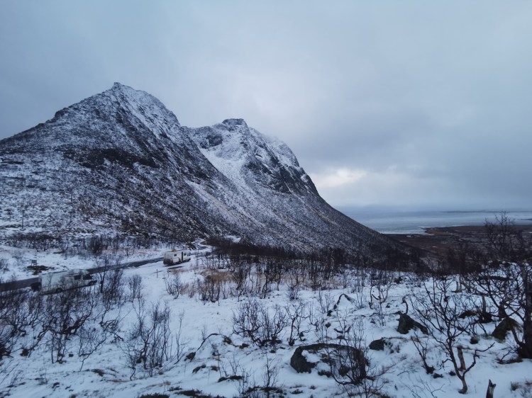 Nous avons un long chemin jusqu’à Senja. Nous passons par de petites routes tortueuses à flan de montagne et au bord des fjords. Les routes sont enneigées et même souvent verglacées. Dès que nous commençons à monter, nous espérons ne croiser personne pour ne pas perdre notre élan… Jusqu’à mi-chemin tout se passe bien. Puis nous nous trouvons sur une route toute blanche qui monte bien (blanche de neige ?? enfin c’est ce qu’on croyait mais la neige cache souvent la glace) et là c’est le drame… le camping-car monte, monte, ralentit et commence à glisser… jusqu’à ne plus arriver à monter ! et ça malgré les pneus cloutés… Il faut dire que notre véhicule à traction a du mal avec tout notre poids à l’arrière. Nous ne pensons pas sur le coup à mettre les chaines. Au final, nous entamons une longue redescente en marche arrière. On n’emmène pas large et Hugo est le seul à s’en rendre compte. Les 2 petits restent plonger dans leur activité « écran ». Et oui des fois, les écrans ça sauve quand la route est longue et/ou compliquée. Une fois revenus sur le plat, nous pouvons repartir en faisant un détour par une autre route plus sûre… Nous alertons d’ailleurs nos amis avec leur gros Billy pour qu’ils prennent tout de suite une autre route pour Senja afin de ne pas connaître les mêmes difficultés que nous.