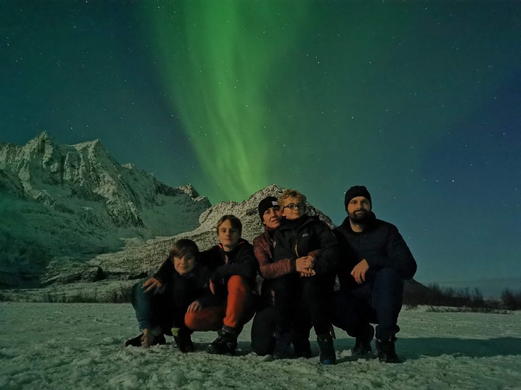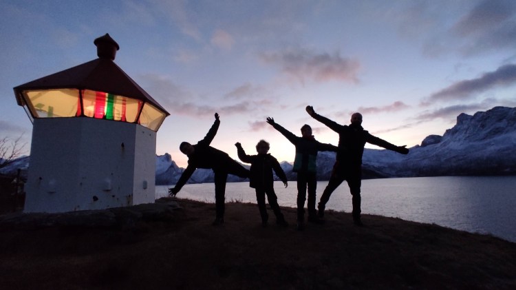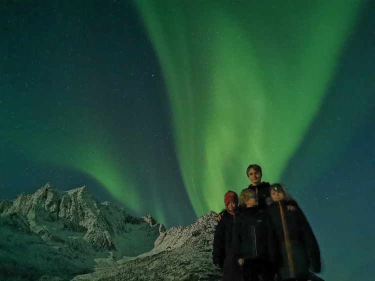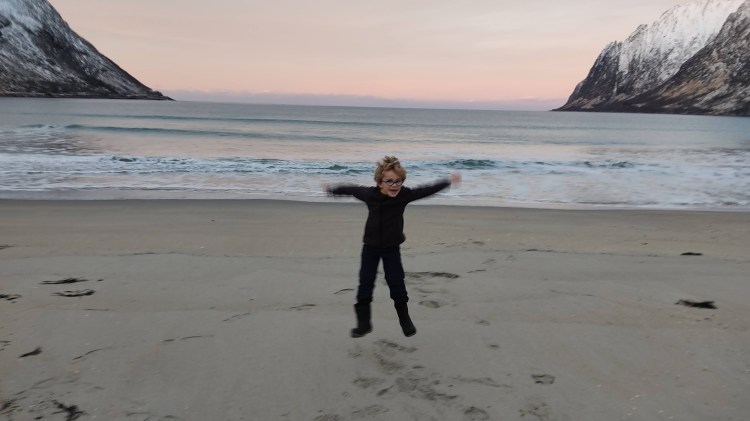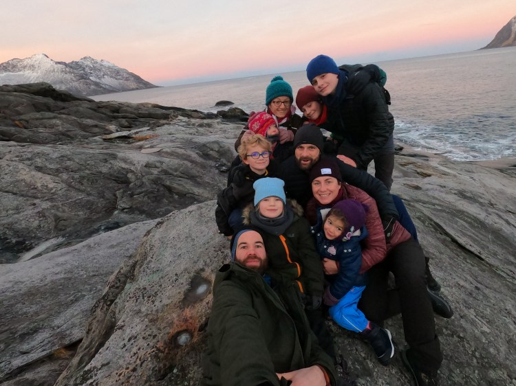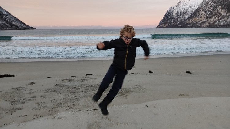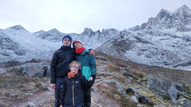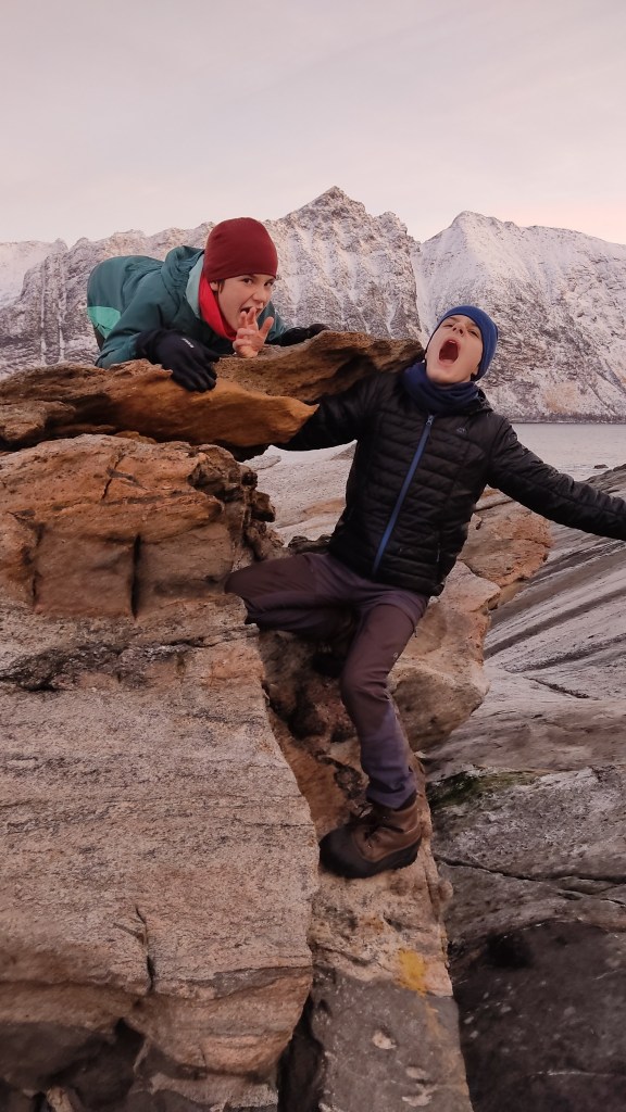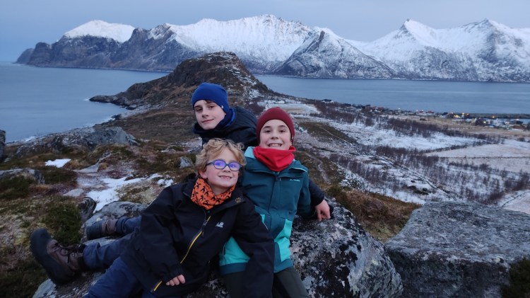 Nous nous arrêtons pour quelques jours sur un magnifique spot surplombant le petit village de Mefjordvaer afin de profiter des ballades dans le coin. Nous faisons une ballade l’après-midi à côté, mais cette fois juste tous les cinq. Les petits pois roulants nous ont laissé pour gérer leur panne de gaz (bouteille vidée en une nuit !), ils nous rejoignent à la nuit tombée.
