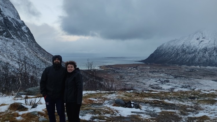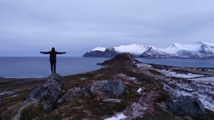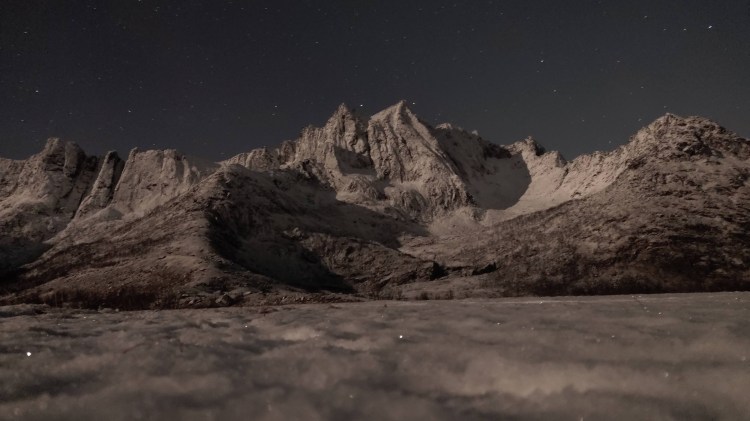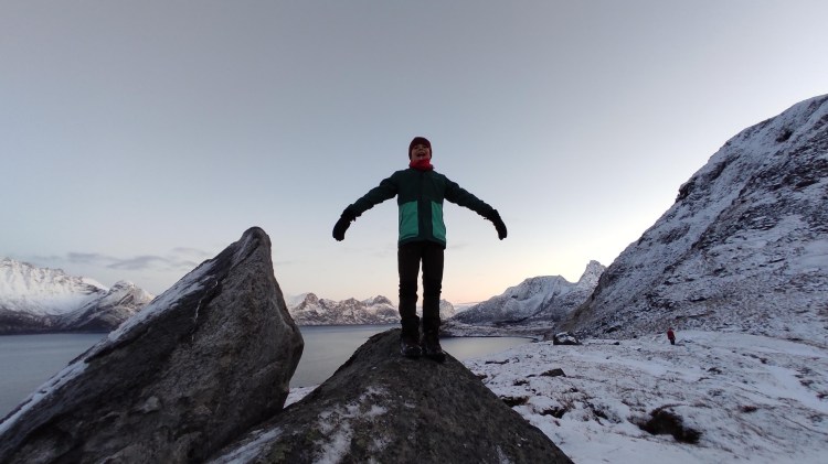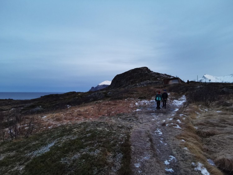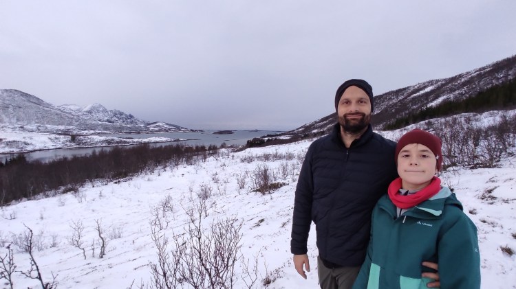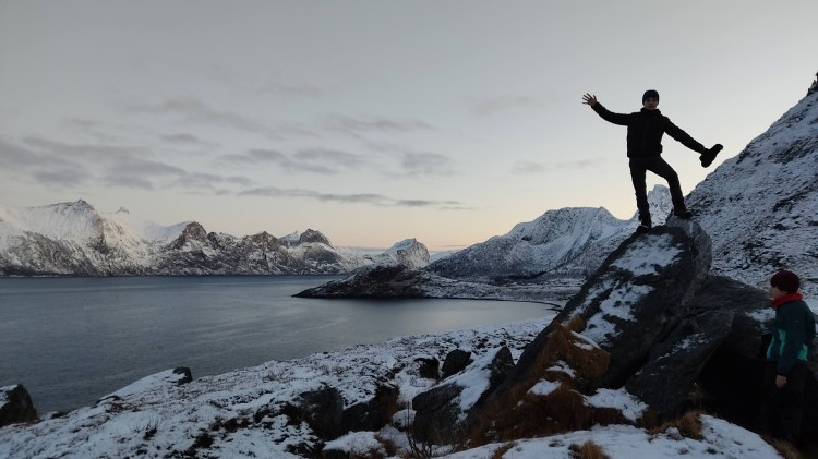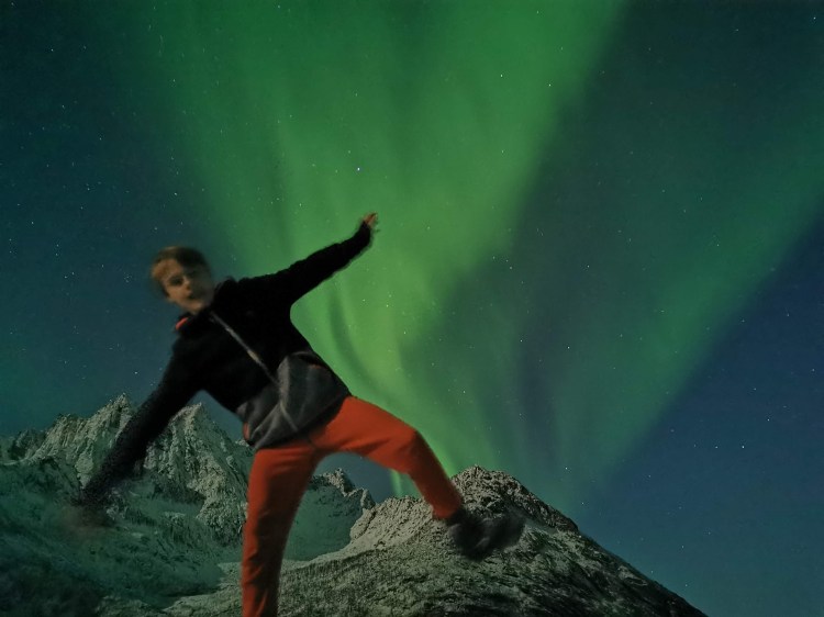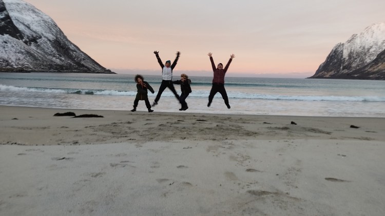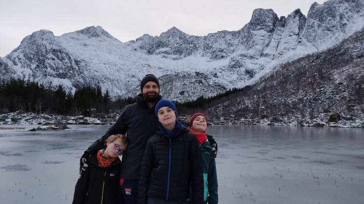 Nous nous arrêtons pour quelques jours sur un magnifique spot surplombant le petit village de Mefjordvaer afin de profiter des ballades dans le coin. Nous faisons une ballade l’après-midi à côté, mais cette fois juste tous les cinq. Les petits pois roulants nous ont laissé pour gérer leur panne de gaz (bouteille vidée en une nuit !), ils nous rejoignent à la nuit tombée.