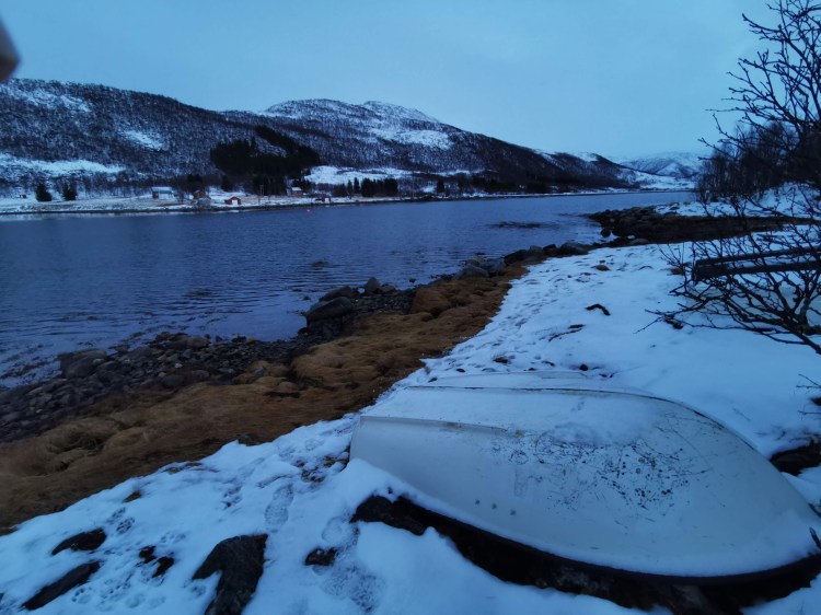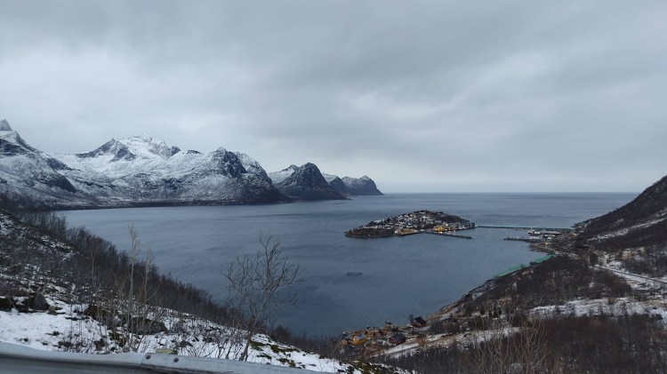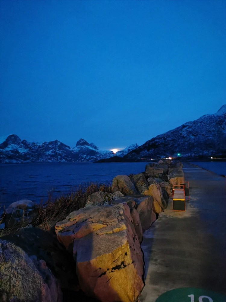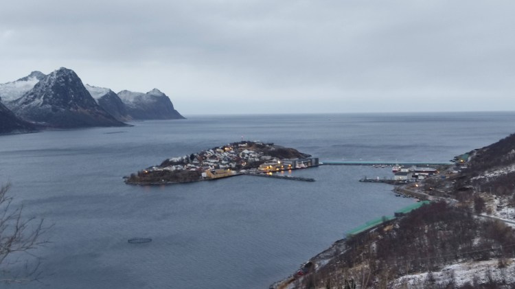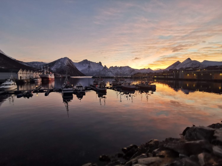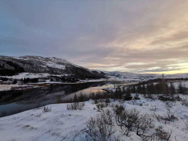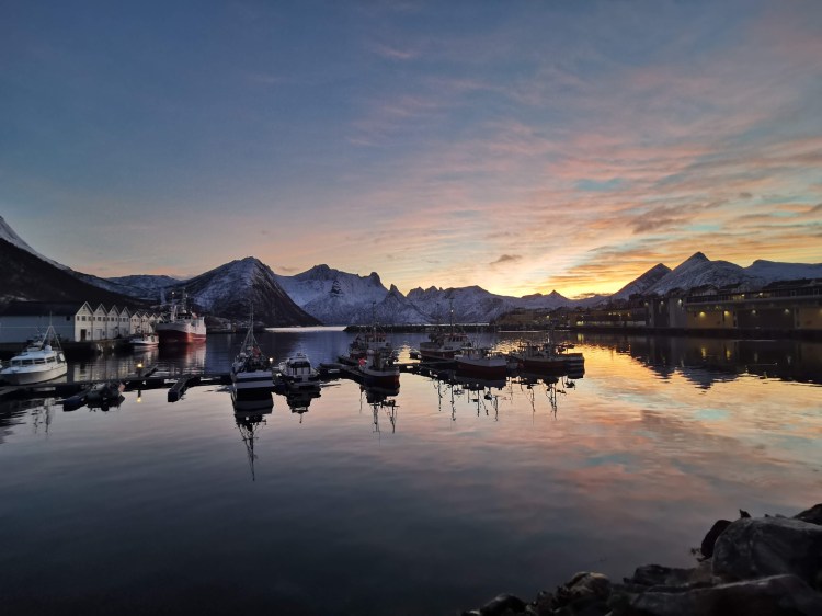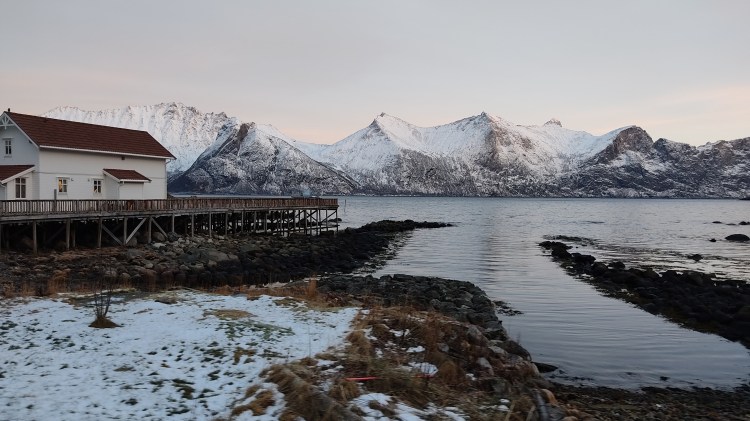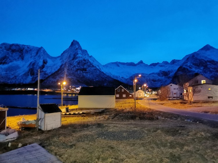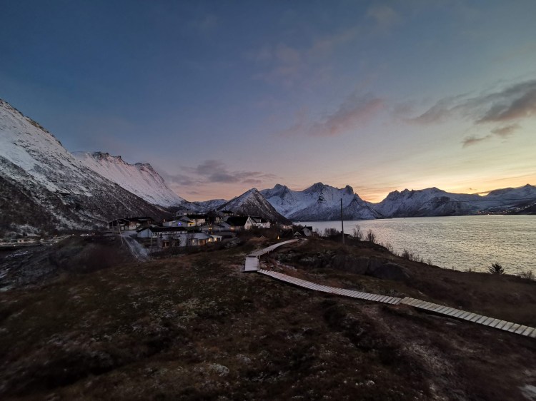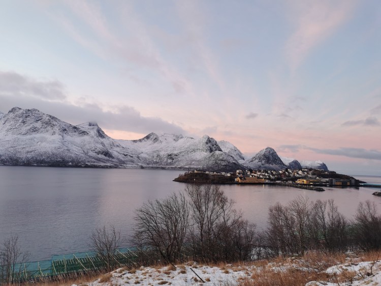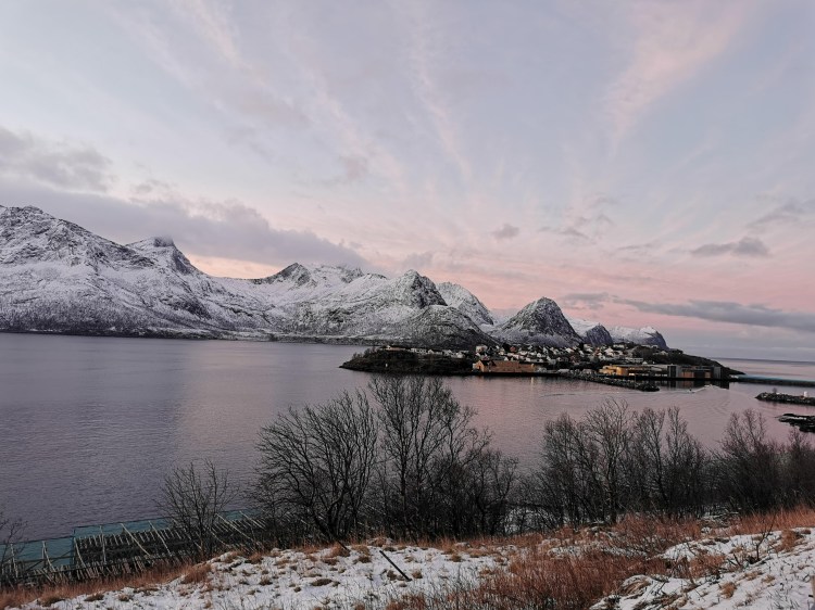 Le lendemain, nous reprenons la route en direction de Husoy. Ce petit village de pécheurs isolé sur une île est authentique et se trouve au milieu d’un fjord. Il ne vit que des fruits de la pêche. La route pour le rejoindre est splendide au bord des fjords puis dans les terres enneigées, nous en prenons encore pleins les yeux. Nous visitons le village à la nuit tombée autant dire qu’il est 14h !! Malgré ces jours si courts, décidément Senja nous conquit…