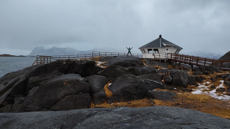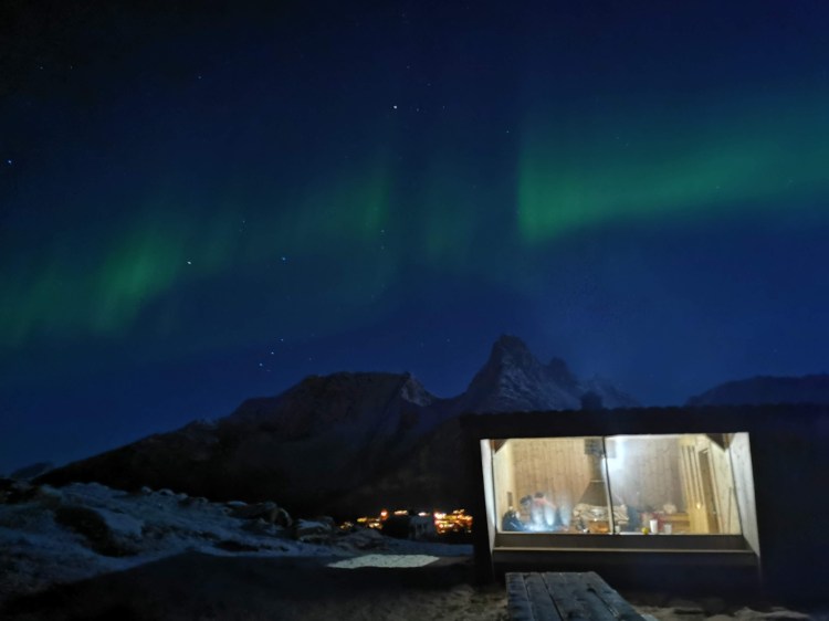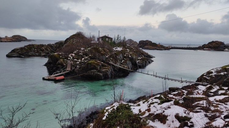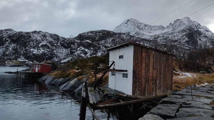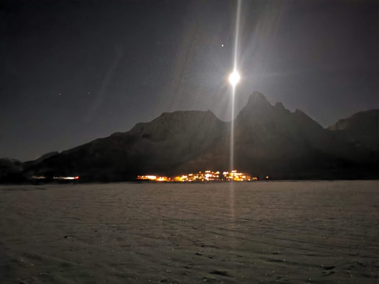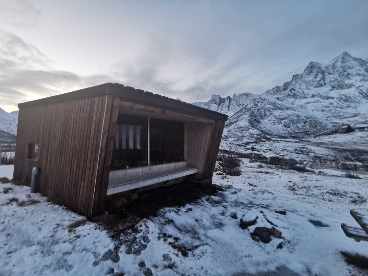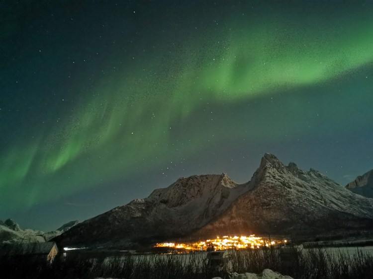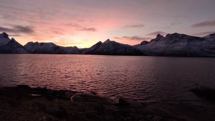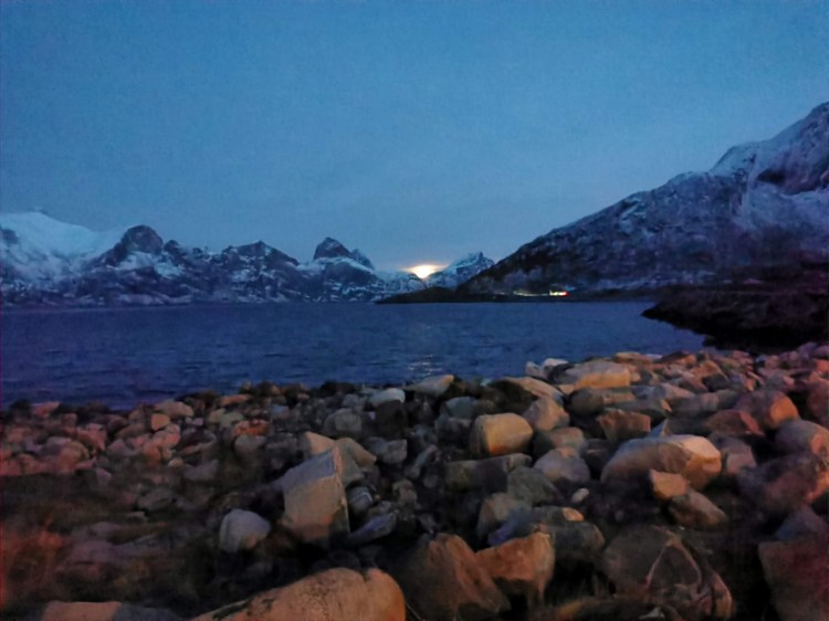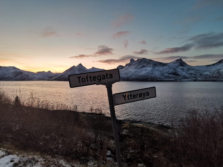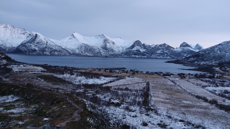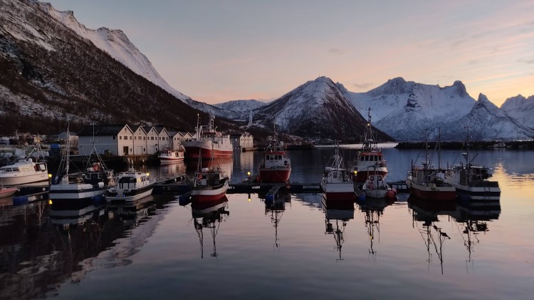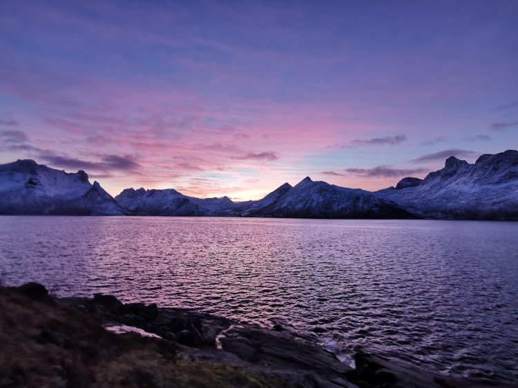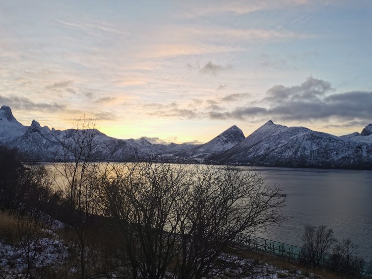 Le lendemain, nous reprenons la route en direction de Husoy. Ce petit village de pécheurs isolé sur une île est authentique et se trouve au milieu d’un fjord. Il ne vit que des fruits de la pêche. La route pour le rejoindre est splendide au bord des fjords puis dans les terres enneigées, nous en prenons encore pleins les yeux. Nous visitons le village à la nuit tombée autant dire qu’il est 14h !! Malgré ces jours si courts, décidément Senja nous conquit…