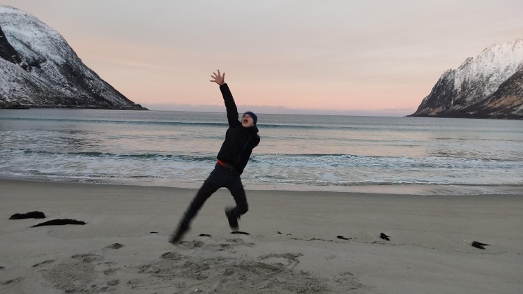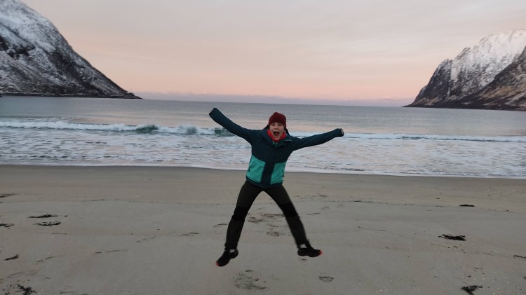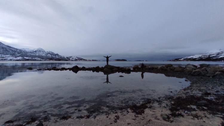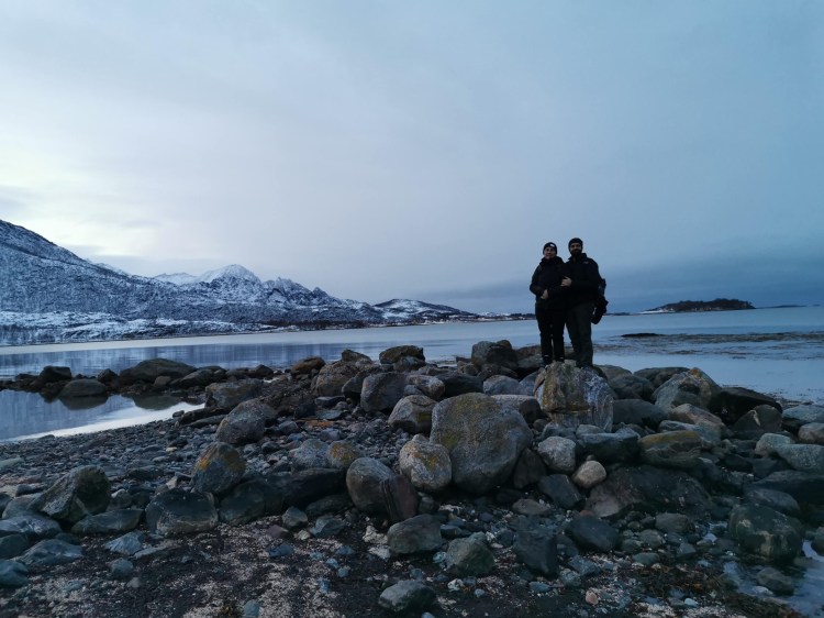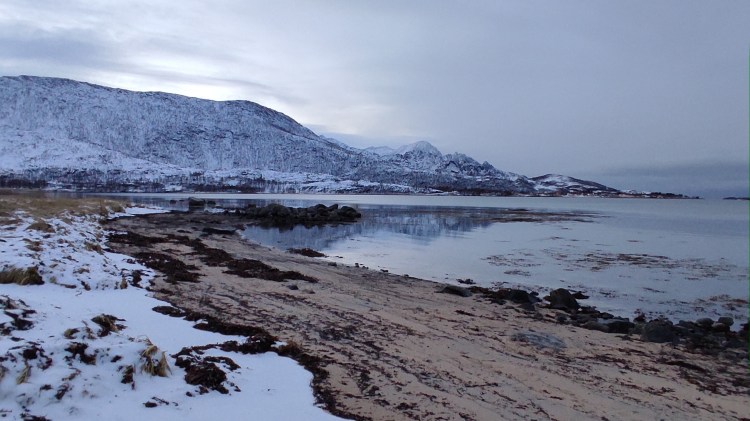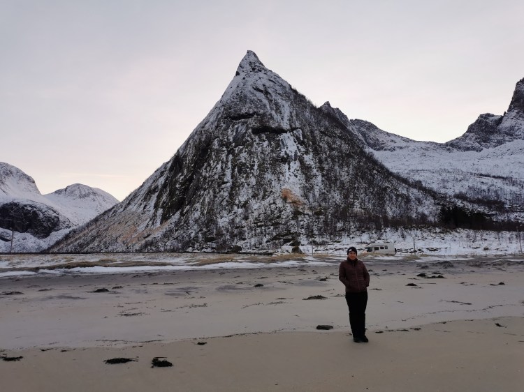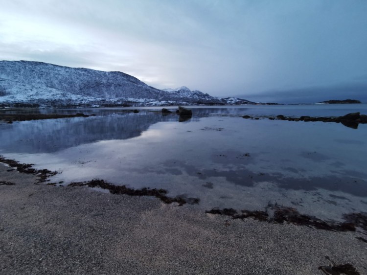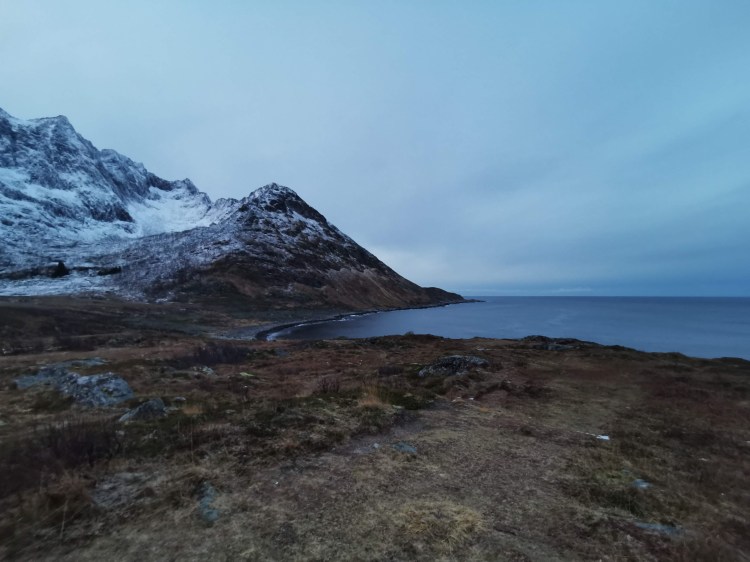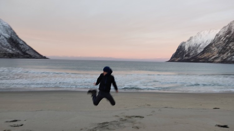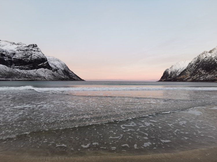 Le lendemain, nous nous balladons près de notre spot sur le bord de l’eau pour admirer le paysage des fjords qui s’offre à nous. Nous reprenons la route avec un premier arrêt sur la plage de Ersfjord.
