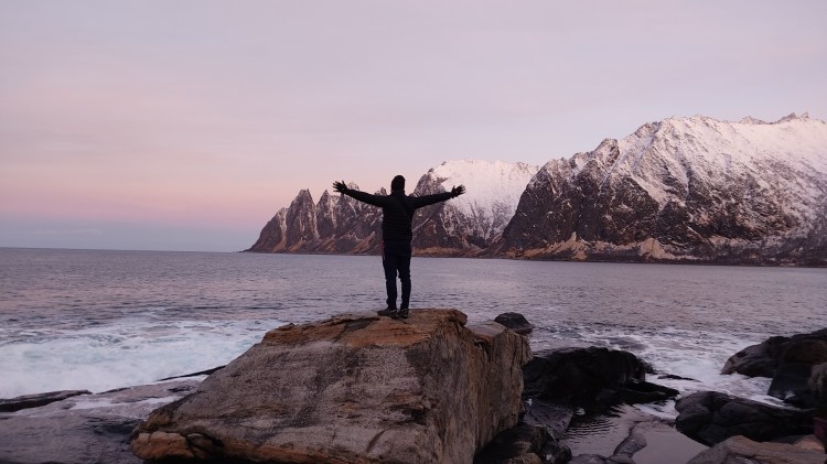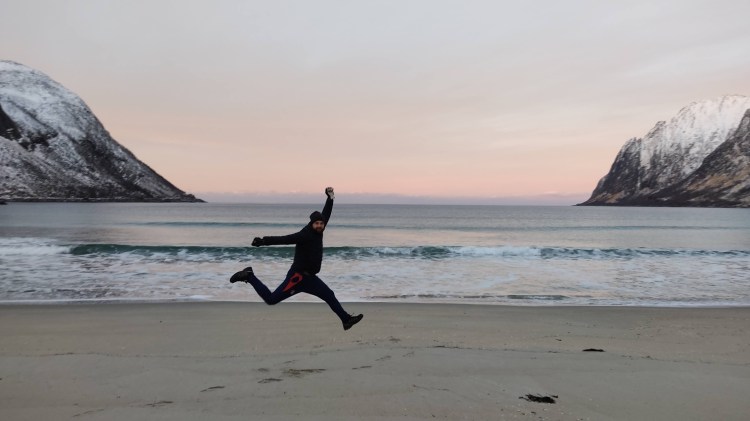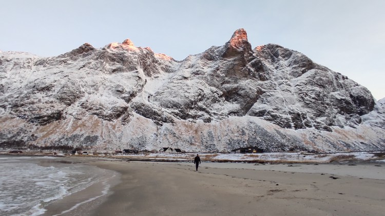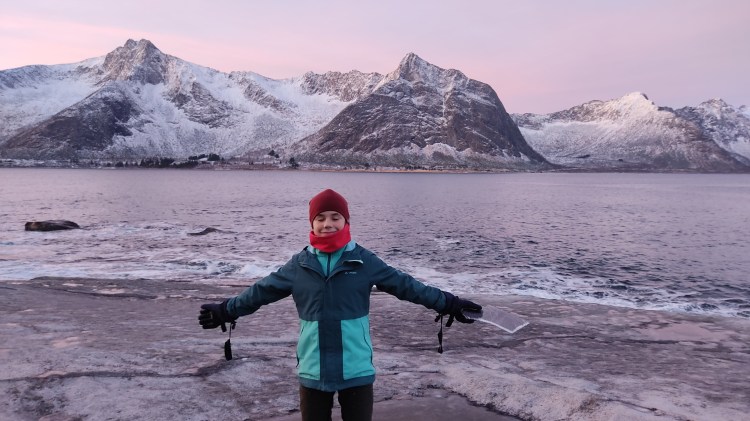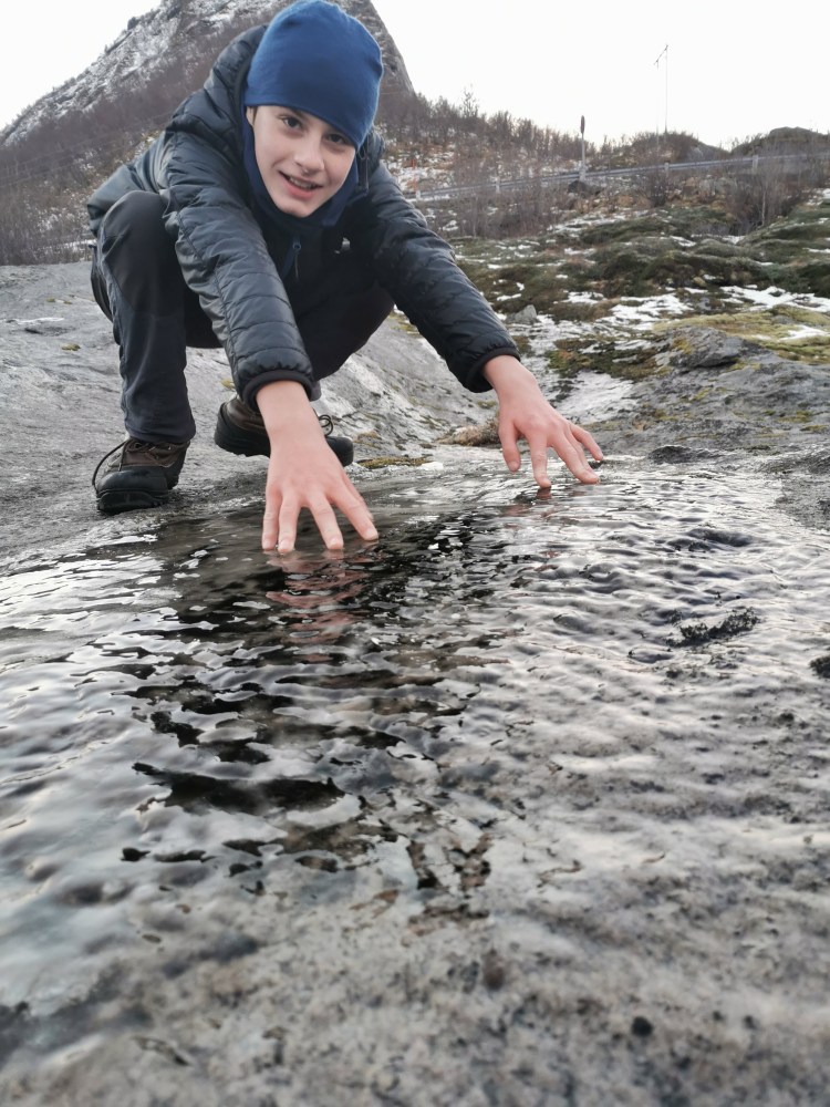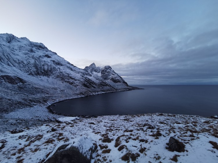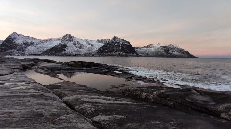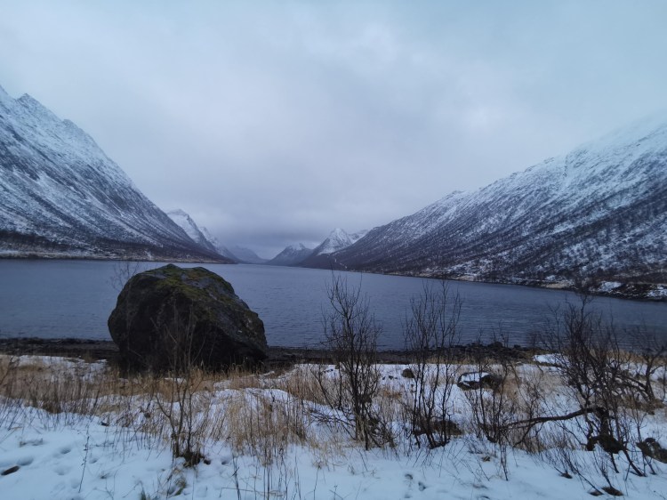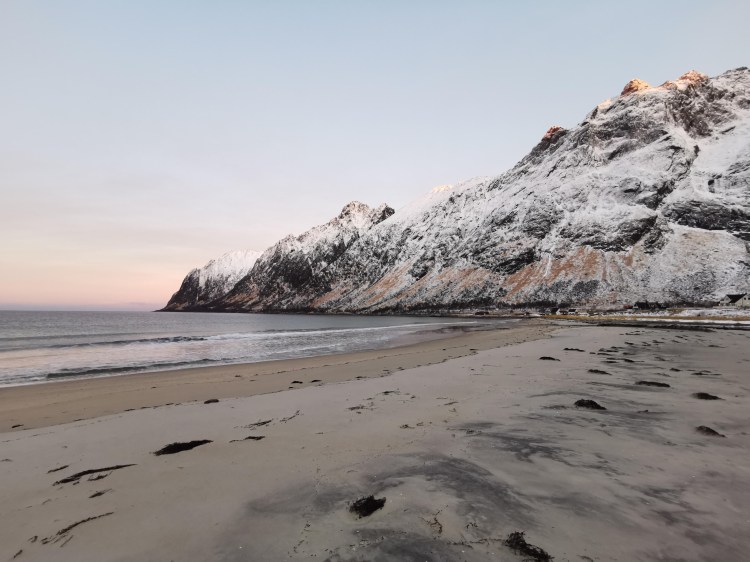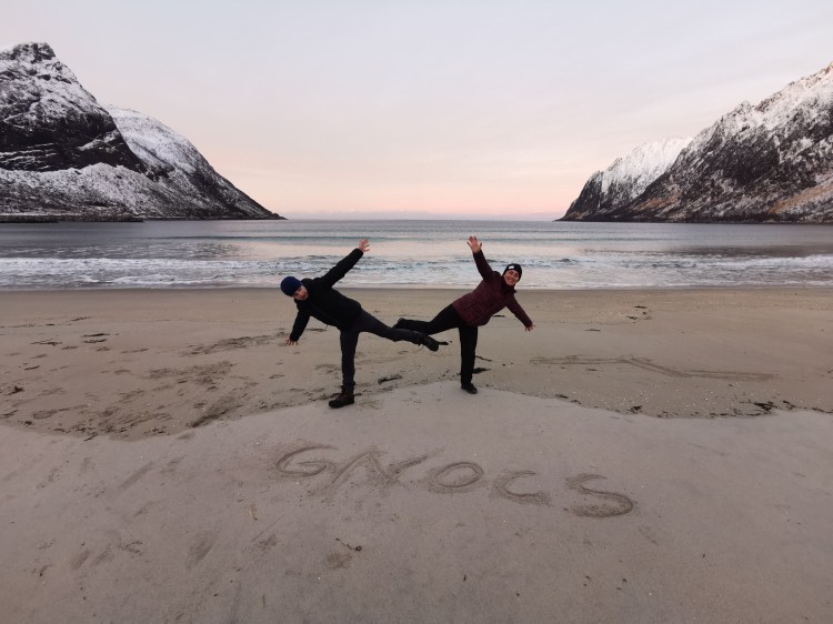Le lendemain, nous nous balladons près de notre spot sur le bord de l’eau pour admirer le paysage des fjords qui s’offre à nous. Nous reprenons la route avec un premier arrêt sur la plage de Ersfjord.