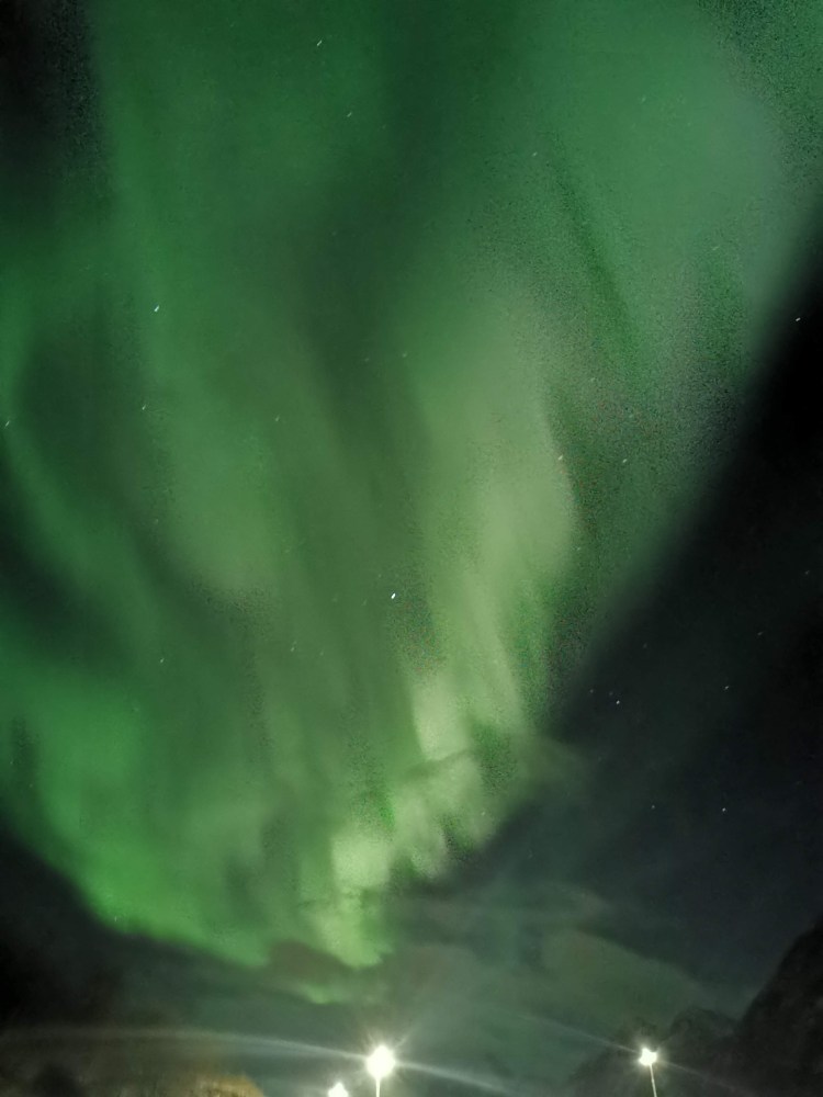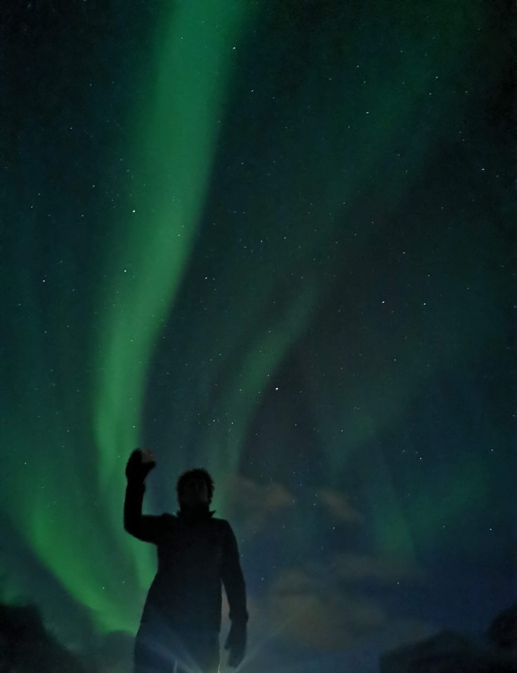 Nous sommes récompensés le soir par des aurores boréales, les premières pour nos amis. Le ciel n’est pas très dégagé mais les couleurs sont belles tout de même.