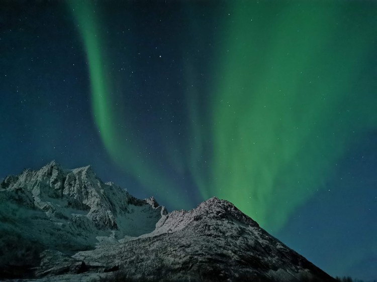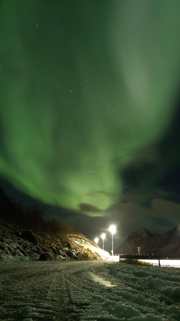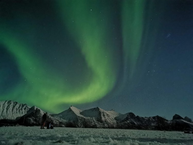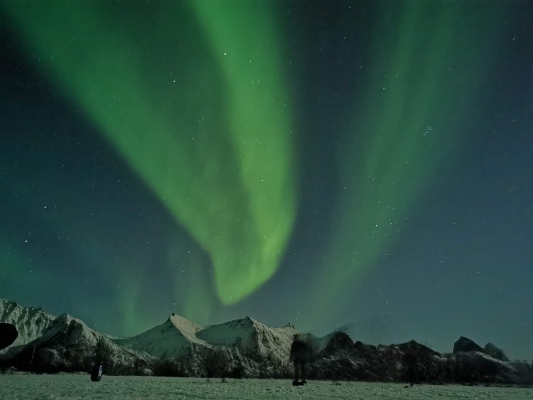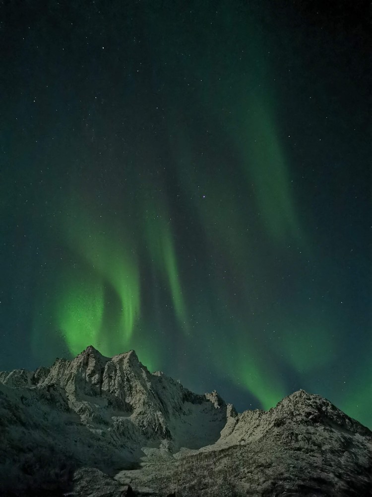 Nous sommes sur un spot parfait pour observer les aurores. Nous sommes haut entourés de montagnes sans pour autant gêner le champ de vision sur le ciel vers les 4 points cardinaux ! Et ce soir-là la nature nous fait le plus beau des cadeaux : nous avons le droit à un magnifique spectacle, le plus beau qu’on ait eu en Scandinavie !!!