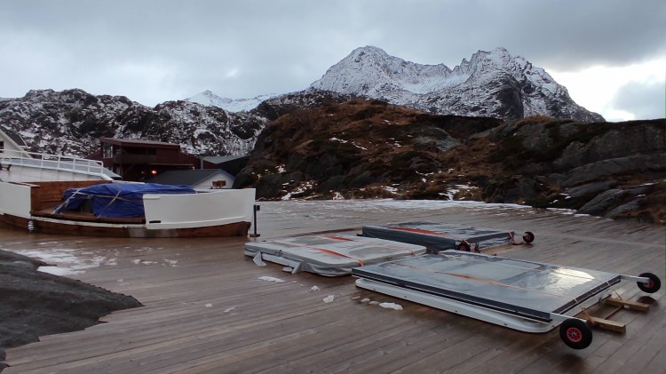 Nous arrivons sur Senja à la nuit (bon ok il fait nuit à 15h…) et nous nous posons sur un parking d’un ancien musée de Troll fermé depuis son incendie de 2019. Nos amis nous rejoignent et labourent le parking pendant 1h jusqu’à trouver la planitude parfaite de leur véhicule vérifiée avec un niveau… Alors que nous on le fait plutôt au doigt mouillé !
