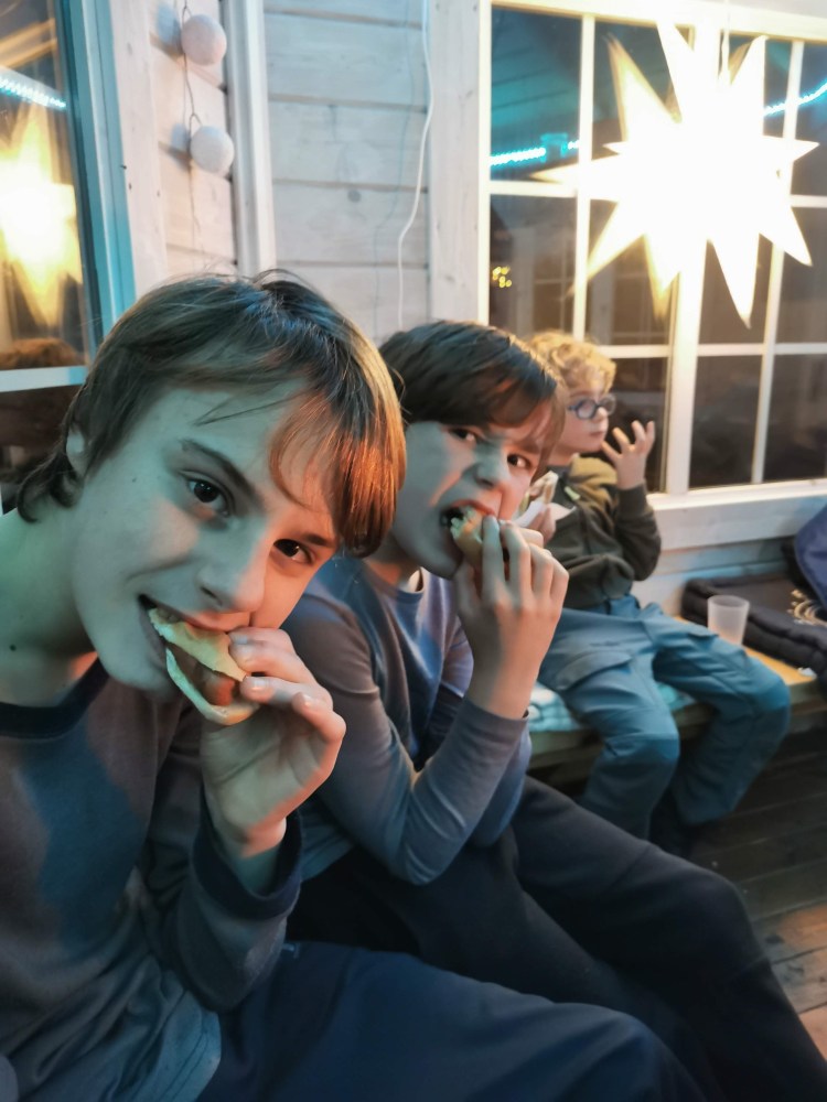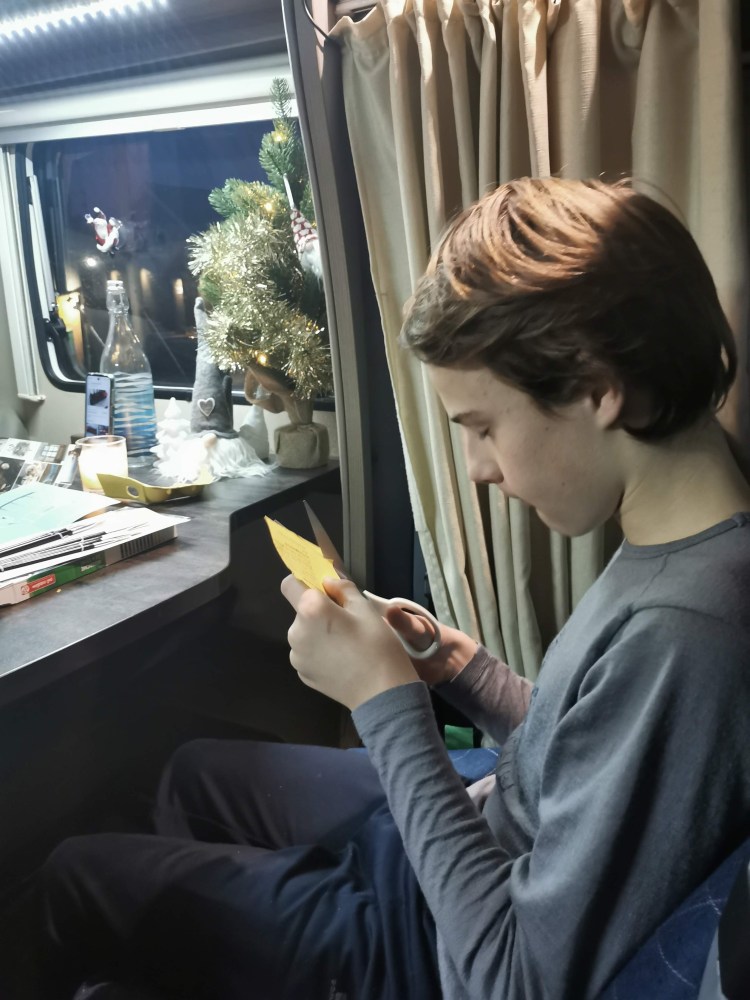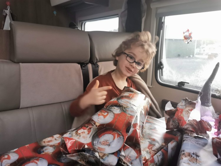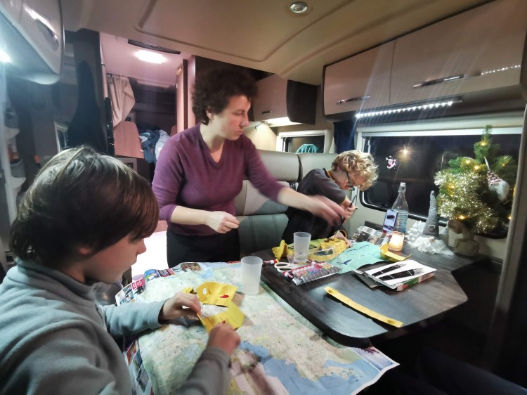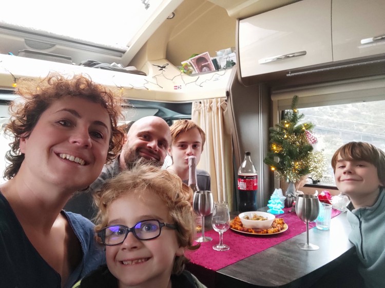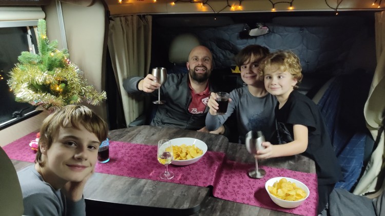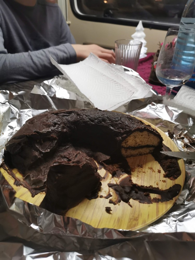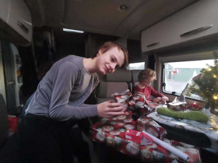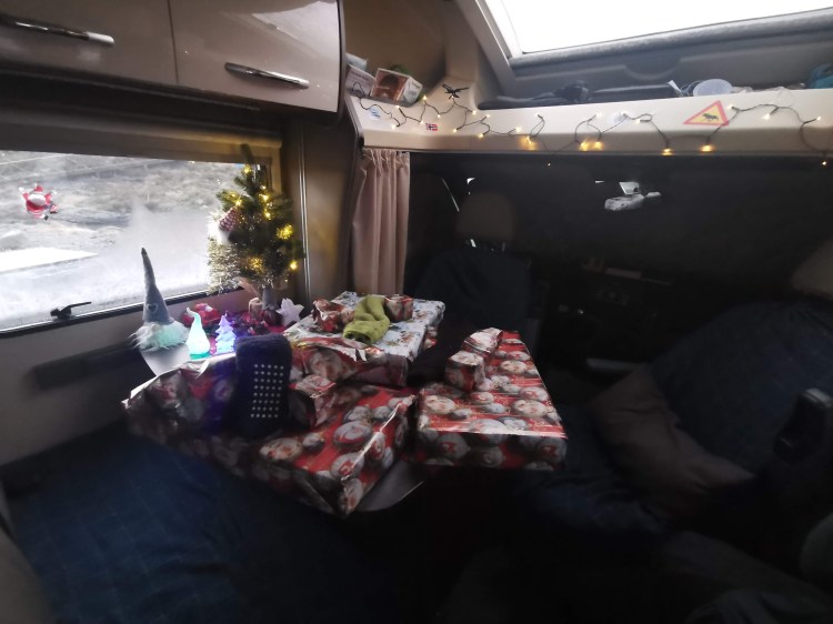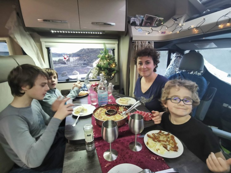 Vers 18h30, alors que nous sommes dans les préparatifs de déco, dessert et cie, la pompe à eau s’arrête de fonctionner. Grrrr ! Des fois, on en a un peu ras le bol des pannes dans le camping-car même si ça fait partie du voyage. Comme nous échangeons en direct via whatsapp avec nos amis de vadrouille, les petits pois, ils nous appellent pour nous rebooster et tenter de réparer la pompe car ça peut être un petit truc banal. Ludo en y regardant de près pense que c’est une cosse qui nous a lâché. Bon biensûr c’est pas le genre de truc qu’on a dans le camping-car, surtout quand on n’est pas prévoyant puisque c’était pas notre mode initial de voyage en tour du monde… Bref je me décide du coup à aller toquer chez des norvégiens le soir du réveillon de Noël en plein repas ! Je tombe sur des gens vraiment sympas, le gars cherche dans son garage la cosse en question. Sa femme embêtée me propose de goûter son repas de Noël avec la spécialité de cette période : le pinnekjøtt, ce sont des côtes de mouton salées et séchées. Elle m’emballe une bonne portion pour qu’on puisse tous y goûter avec les enfants. Son mari finit par trouver 2 cosses dans la soirée et me les rapporte au camping-car. Malheureusement, les cosses ne suffisent pas, il semblerait que ce soit bien la pompe qui ait lâché. Tanpis, on fera à l’ancienne pendant ces 4 jours avec des seaux d’eau et une bouilloire pour la douche et la vaisselle 🙂