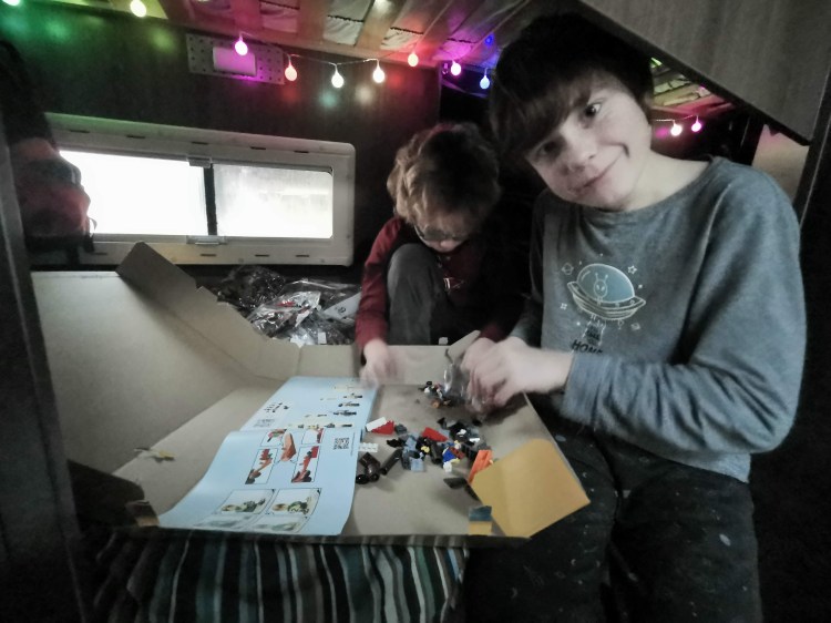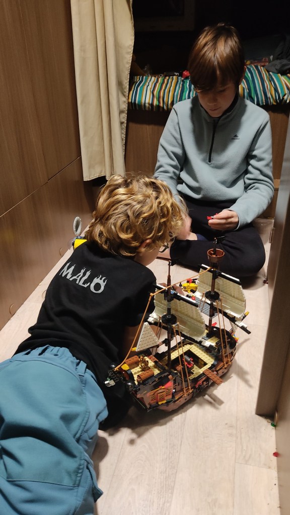 Le lendemain matin, tout est sur la table autour du sapin avant que les garçons se réveillent. Et j’ai préparé des pancakes pour le petit-déjeuner. Pas besoin de trop longtemps imaginer, les enfants se sont jetés sur leurs cadeaux. Ils ont eu chacun un lego à construire, cela a donc été l’activité de la journée 🙂