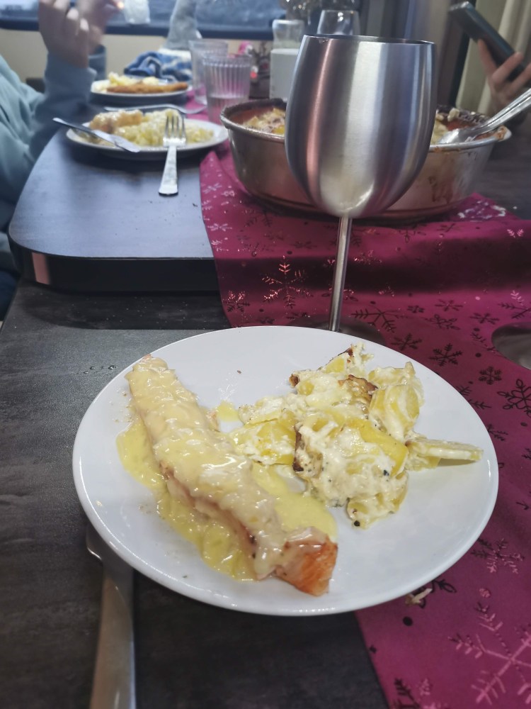 Pour notre repas de Noël, nous avons prévu du saumon sauce beurre blanc avec du gratin dauphinois à la crème, c’est super léger 🙂 mais c’est trop bon. Et toujours les buches chocolat et framboise pour le dessert.