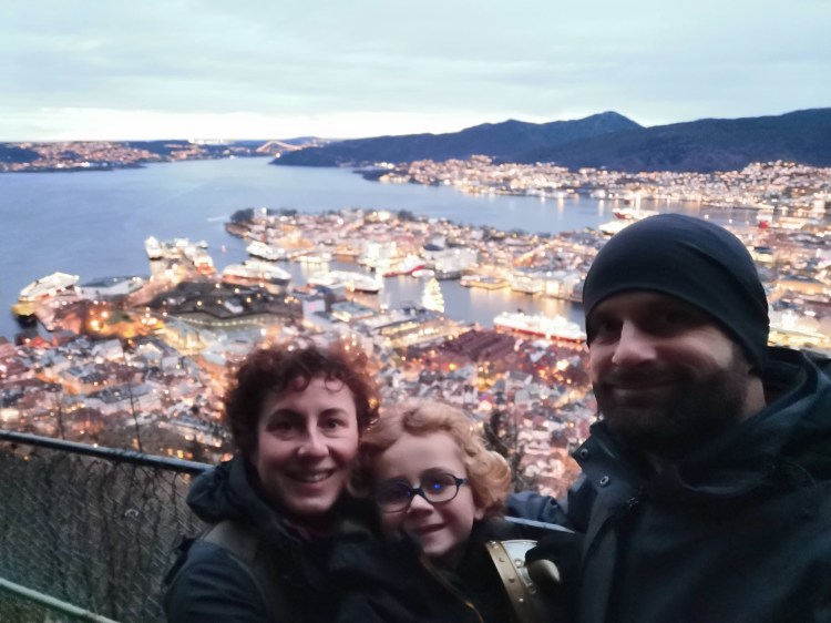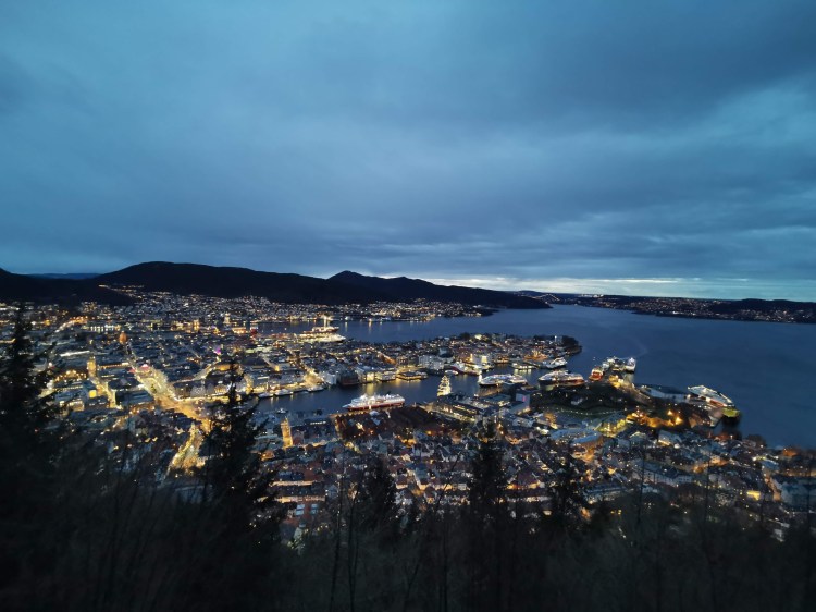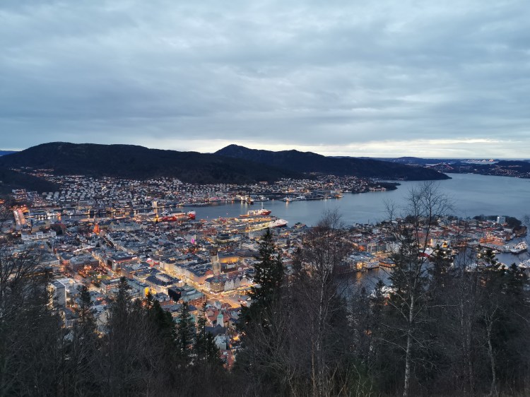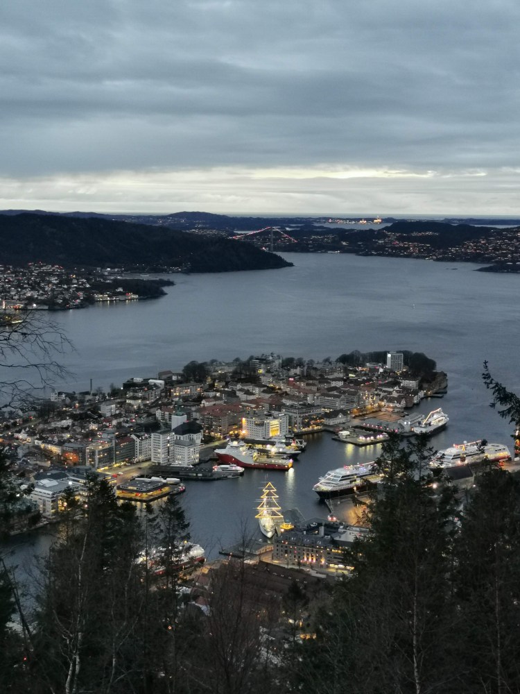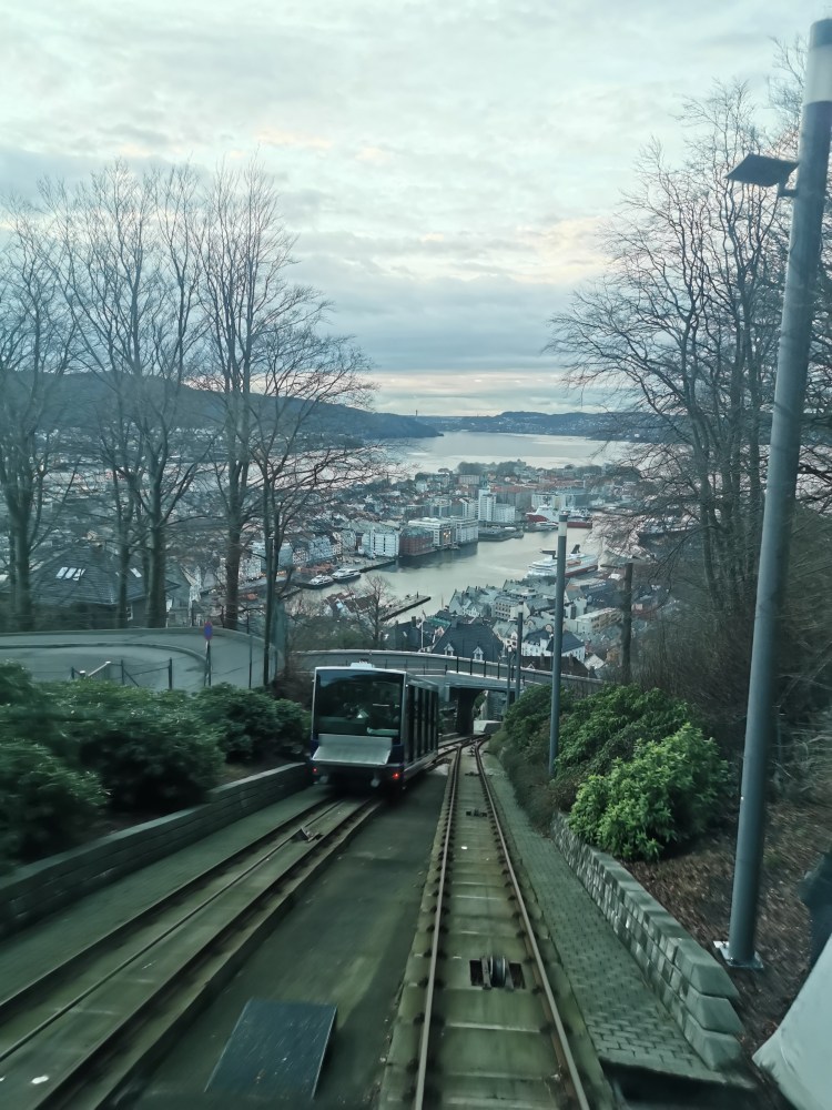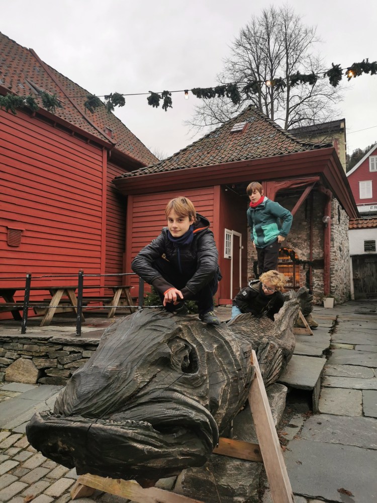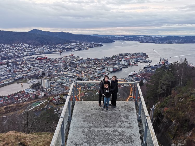 Nous prenons ensuite le funiculaire pour monter sur le mont Floyen et profiter d’une vue magnifique sur Bergen. Nous y arrivons en milieu d’après-midi, le soleil commence à se coucher tout doucement. Nous redescendons à pied la colline, cela nous permet de profiter de la vue autant de jour que de nuit. Les aménagements au mont Floyen sont top en plus, notamment pour les enfants. Les garçons passent un bon moment dans les jeux perchés dans les arbres.