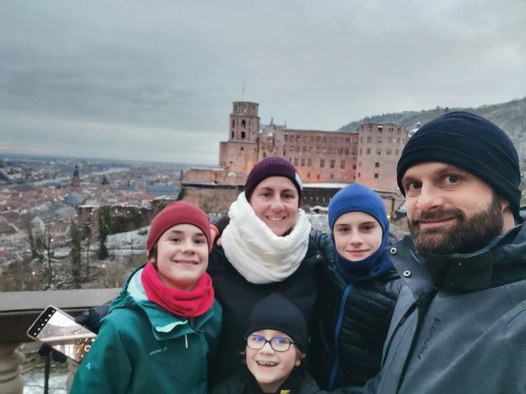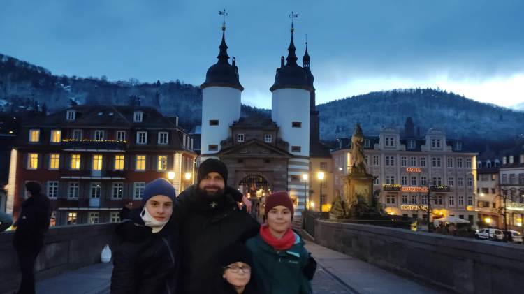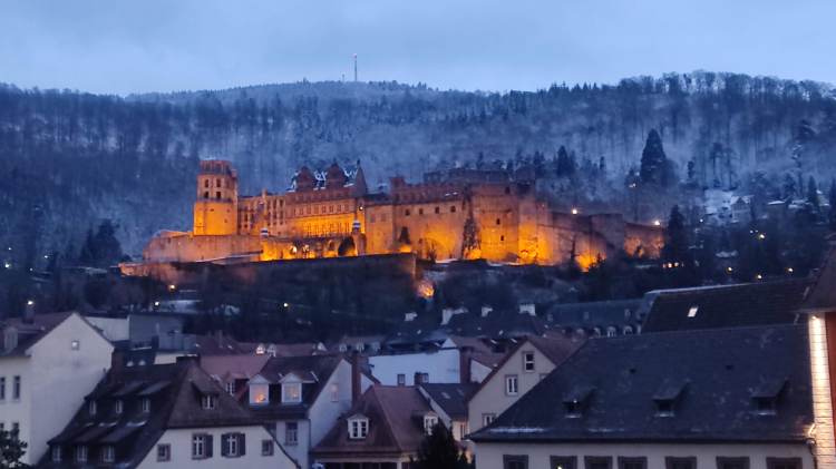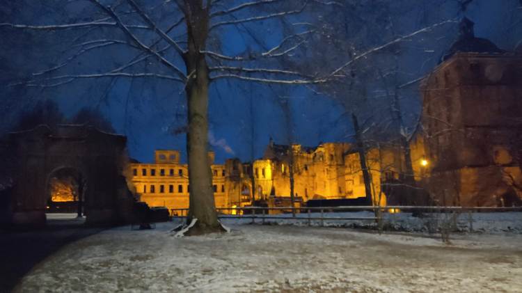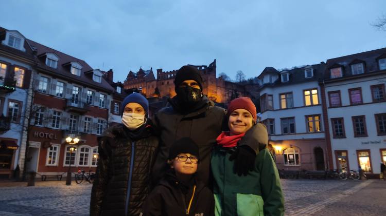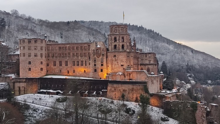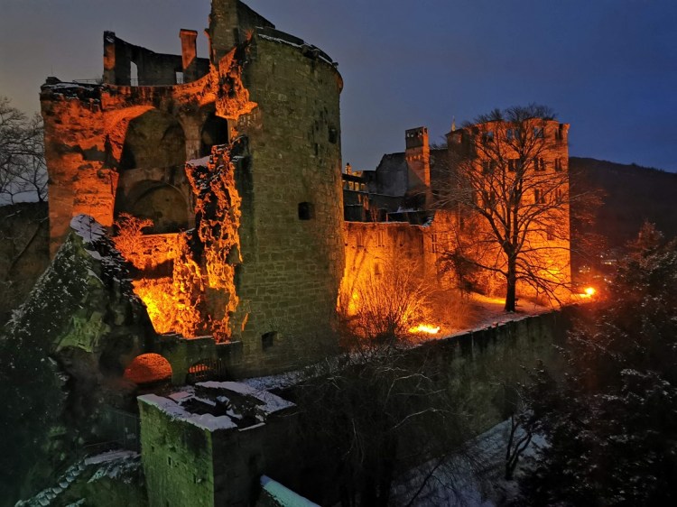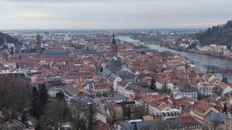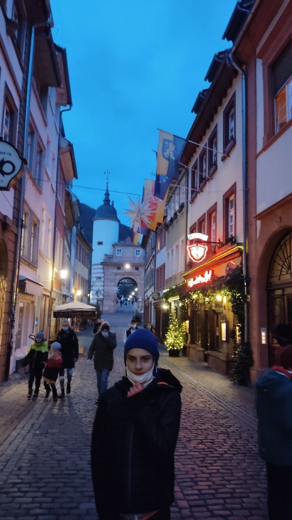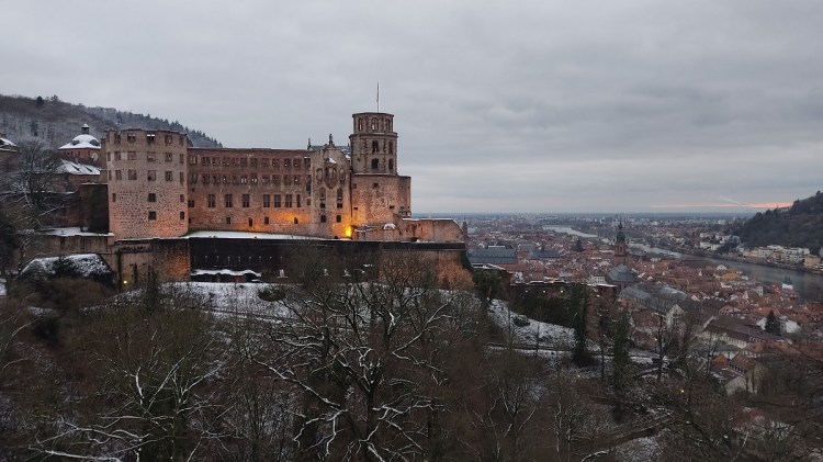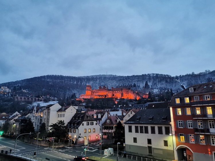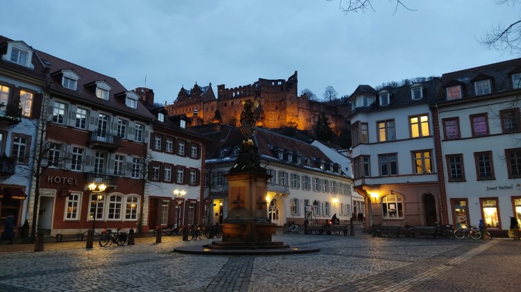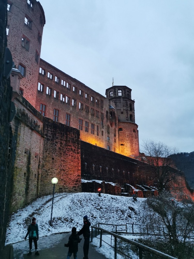 Comme la route est tout de même longue, nous choisissons également un joli stop en Allemagne du côté de Heidelberg où se trouve un très joli chateau fort en ruines sur les hauteurs de la ville. Nous faisons le tour du chateau et descendons dans la vieille ville. Comme pour Ribe, tout est désert et fermé… drôle de période !