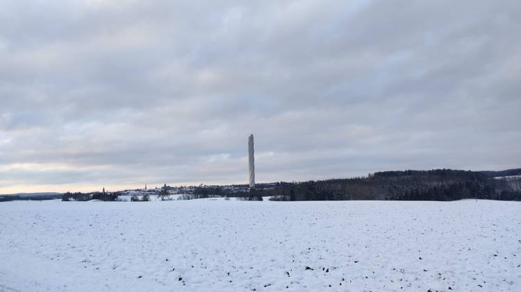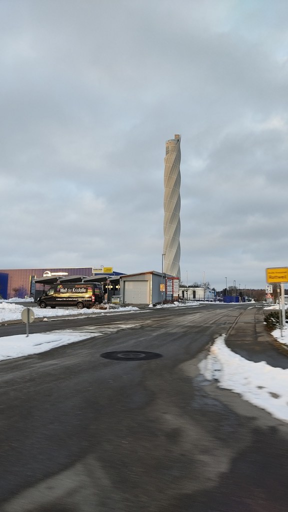 Nous dormons une dernière nuit en Allemagne, pas loin de la frontière suisse sur une aire de camping-car également fermée à cause du Covid. Le lendemain matin, nous découvrons une étrange tour au milieu de nulle part. Il s’avère qu’il s’agit de la tour de test des ascenseurs Thyssenkrup, en temps normal on peut même la visiter.
