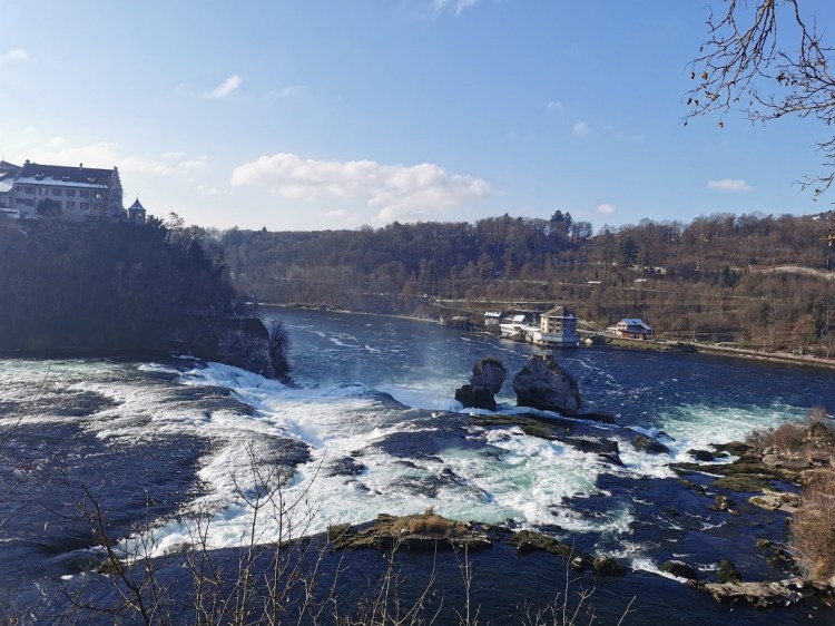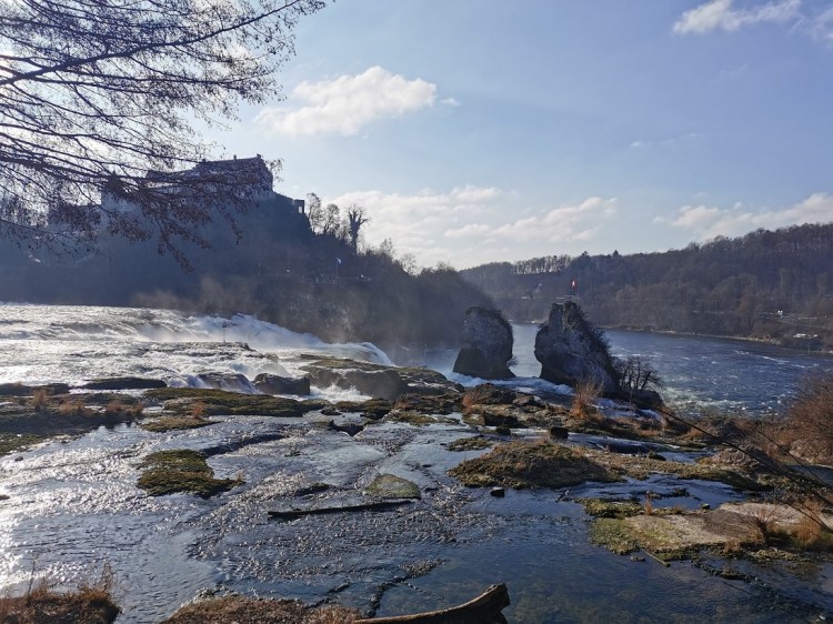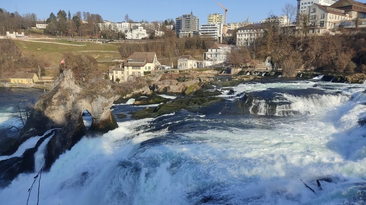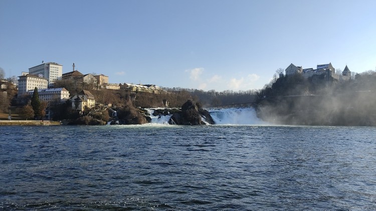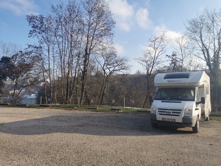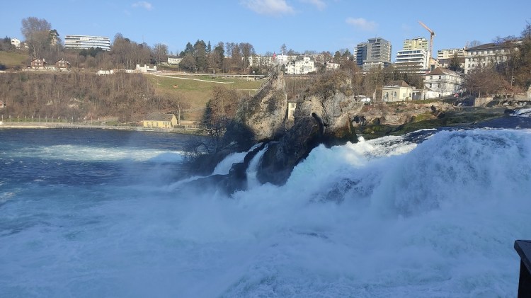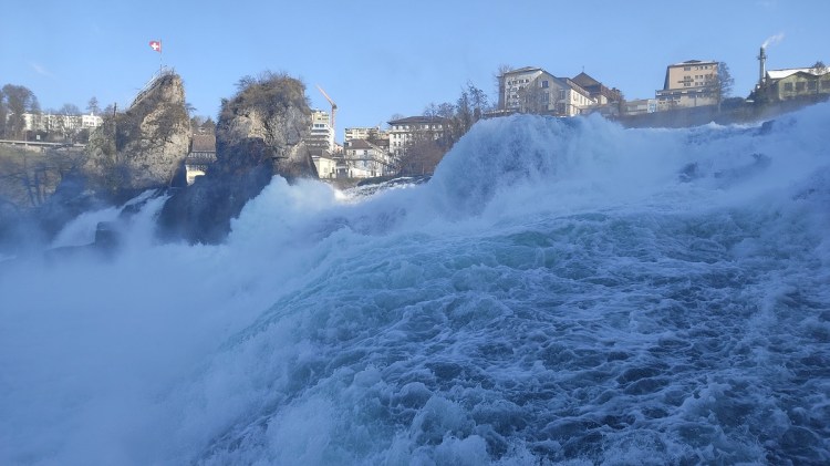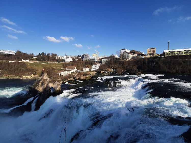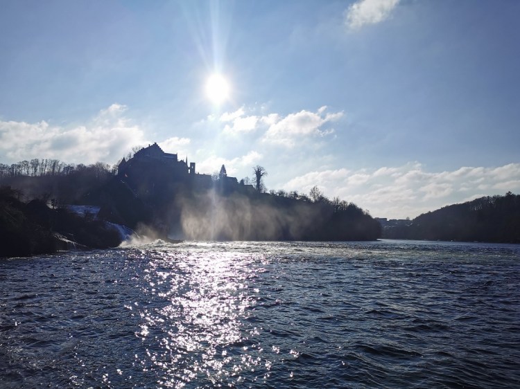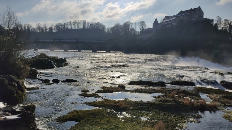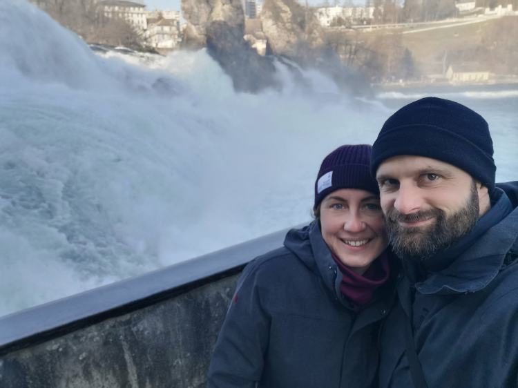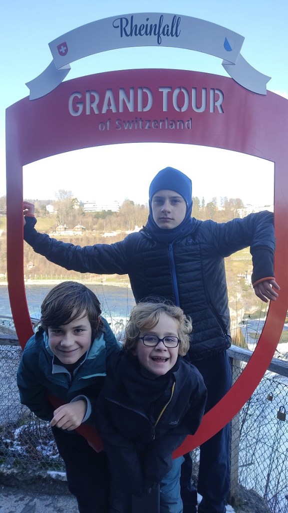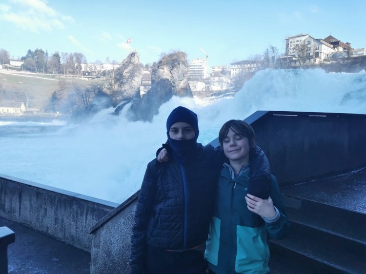 Nous passons la frontière suisse, de nouveau sans être inquiétés. Nous n’avons vu aucun douanier… Nous roulons encore une petite heure pour rejoindre les chutes du Rhin que nos amis Phil et Caro nous avaient conseillées d’aller voir. En arrivant sur le parking, nous voyons un autre camping-car de français immatriculé en Bretagne. Ils sont partis avant nous faire la ballade. Nous les croisons sur le chemin et commençons à échanger rapidement pour se rendre compte que nous vivons les mêmes projets de voyage au long cours en famille. Nous sympathisons bien et décidons de boire le café ensemble après le repas de midi tardif. Au final nous restons à discuter jusqu’au milieu de l’après-midi… Nous échangeons nos coordonnées, nos bons plans et nos blogs.